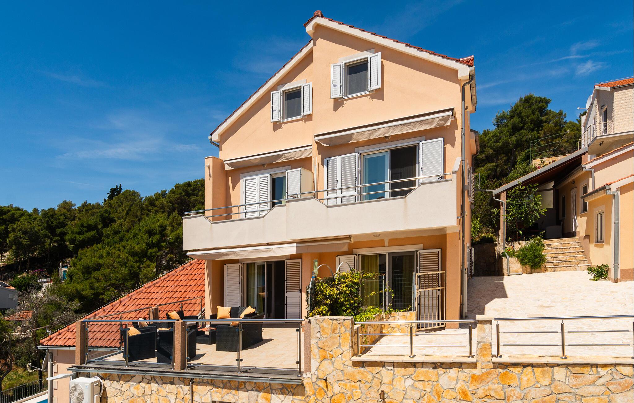 Spazieren Sie, wann immer Ihnen nach einem erfrischenden Bad im türkisblauen Wasser ist, zum Strand hinunter. Unternehmen Sie eine Kajaktour entlang der zerklüfteten Küste und entdecken Sie versteckte Buchten, erkunden Sie das charmante Städtchen Supetar mit seinen traditionellen Tavernen und lebendigen Märkten oder wandern Sie auf den Vidova Gora, den höchsten Punkt der Adriainseln, für einen atemberaubenden Panoramablick. Mieten Sie ein Boot, um umliegende Inseln wie Hvar oder Šolta zu besuchen, oder genießen Sie lokale Weine bei einer Führung durch ein familiengeführtes Weingut im Inselinneren.