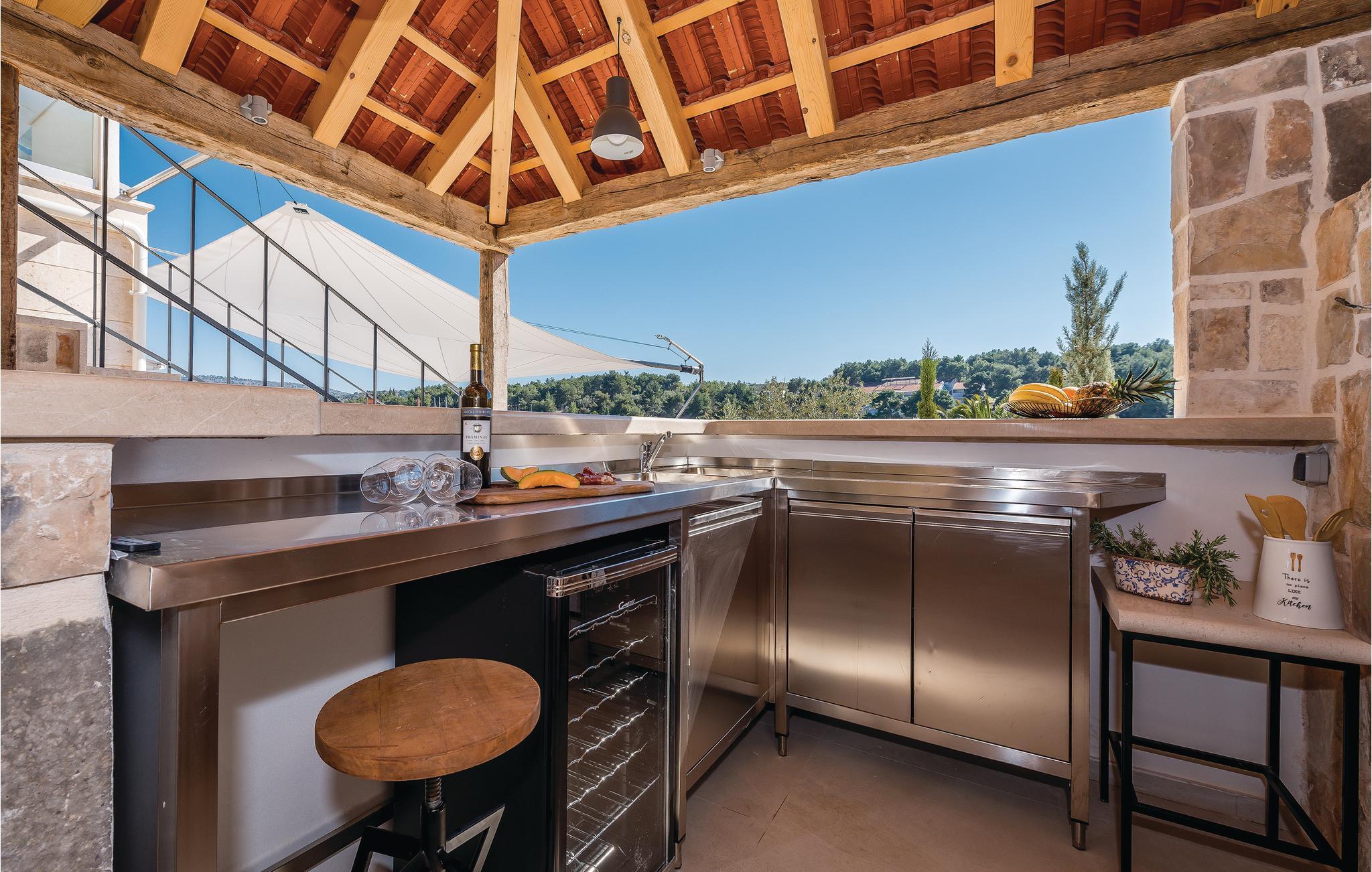 Dieses luxuriöse und geschmackvoll eingerichtete Ferienhaus mit Pool ist die perfekte Wahl für einen unvergesslichen Urlaub. Es liegt auf der Insel Brac im Ort Milna, dessen Altstadt im barock-urbanen Stil mit einem natürlichen Hafen bezaubert. Genießen Sie die atemberaubende Aussicht auf das Meer von einer der Terrassen. Im Erdgeschoss sind eine Küche, Sauna und ein Bad. Zum ersten Stock gelangen Sie von außen, wo Sie eine geräumige Küche mit Wohnzimmer, Schlafzimmer und Bad finden werden. Jedes Bad hat Fußbodenheizung. Innentreppen verbinden den ersten und zweiten Stock. Den Außenbereich schmücken mediterrane Pflanzen und kleine Steingärten. Auf dem umzäunten Grundstück neben dem Pool ist auch eine überdachte Terrasse mit Sommerküche, wo sich ein Grill, Kühlschrank für Getränke sowie Tisch und Stühle für angenehme Sommerabende befinden. In Milna gibt es viele Freizeitmöglichkeiten und Restaurants mit köstlich zubereiteten Fischspezialitäten. Unternehmen Sie Ausflüge nach Split, Hvar, Korcula, Mljet und Dubrovnik per Katamaran-Verbindung.