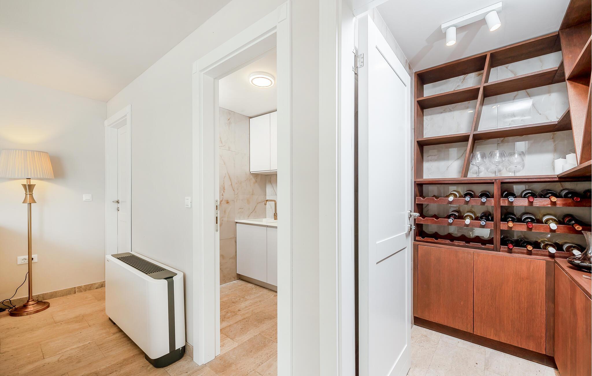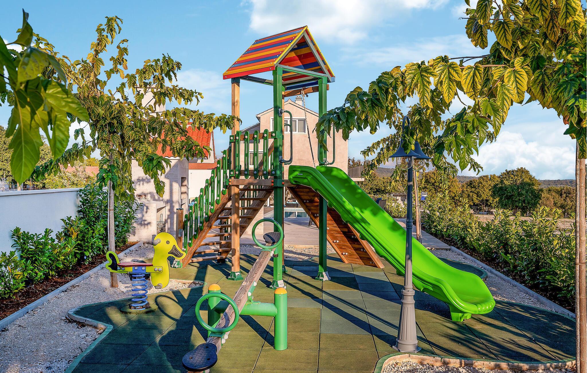 Reisen Sie mit Ihrer Familie an und wechseln direkt in den Urlaubsmodus. Die elegante, stilvolle Einrichtung, der offene Kamin im Wohnzimmer und die hochwertigen Möbel schaffen ein einladendes Ambiente, in dem Komfort und Luxus im Mittelpunkt stehen. Durch die großen Fenster flutet das Tageslicht die hellen, offenen Räume und sorgt für eine warme, entspannte Atmosphäre – perfekt für erholsame Tage in stilvollem Rahmen. Genießen Sie hier Ihren Ferienalltag beim Kochen, Essen, Spielen oder Relaxen und treten hinaus auf den Balkon oder erkunden mit Ihren Lieben den Garten- und Terrassenbereich. Auf dem weitläufigen Grundstück bietet Ihnen das moderne Haus nicht nur einen Swimmingpool, sondern auch einen Wellnessbereich mit Whirlpool und Sauna. Lassen Sie die Seele baumeln und erfrischen sich in Ihrem privaten Pool, während Ihre Kinder den Spielplatz entdecken.