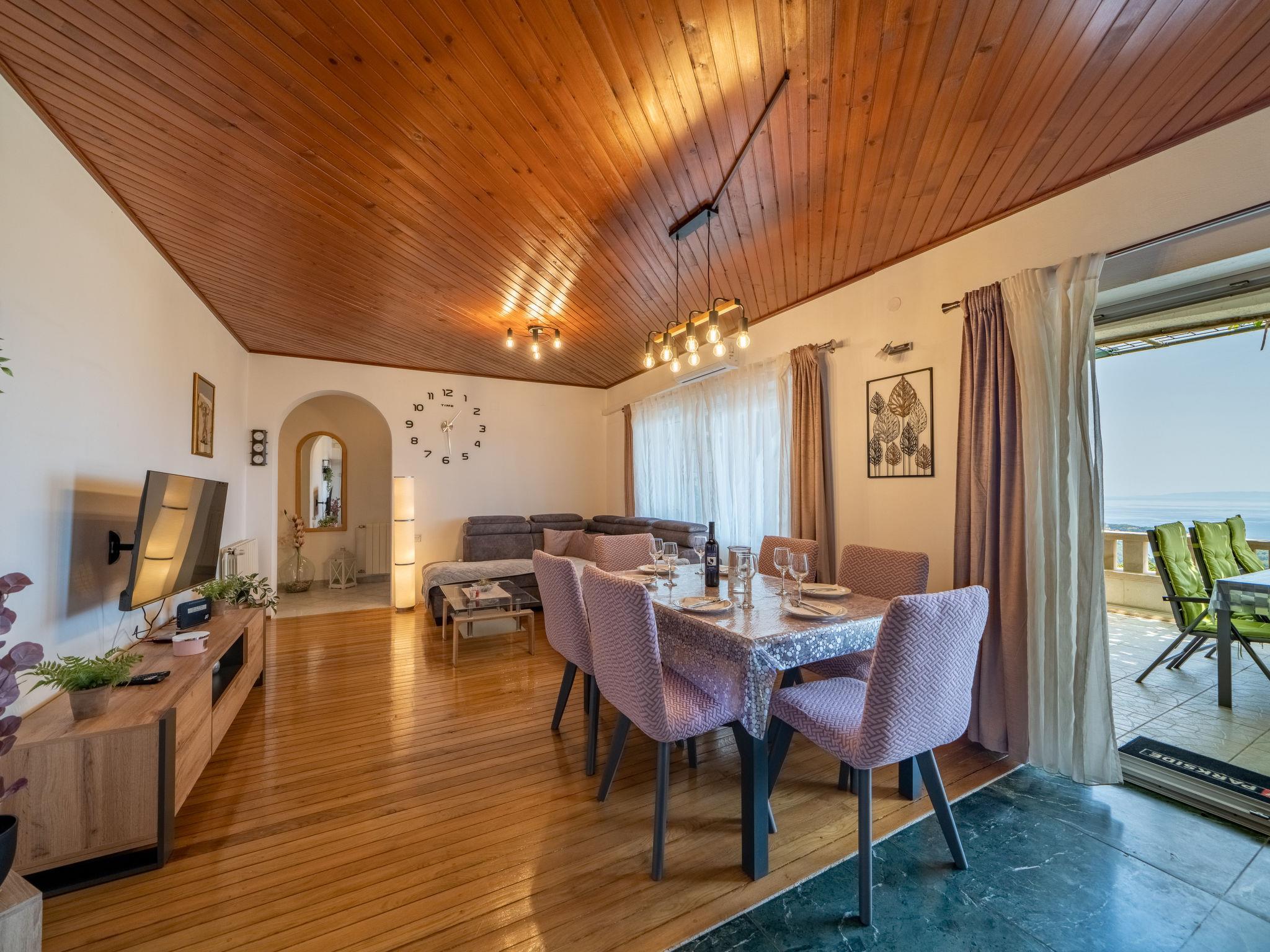 4-room house 100 m2, south facing position. Living/dining room with satellite TV (flat screen), air conditioning. Exit to the terrace. 1 room with 1 french bed (160 cm, length 200 cm). 1 room with 1 x 2 bunk beds (90 cm, length 200 cm), shower/WC. 1 room with 1 double bed (2 x 90 cm, length 200 cm). Open kitchen (4 hot plates, oven, dishwasher). Bath/bidet/WC with corner bath. Terrace 28 m2 partly roofed. Terrace furniture. Distant view of the sea. Facilities: hair dryer. Internet (WiFi, free).