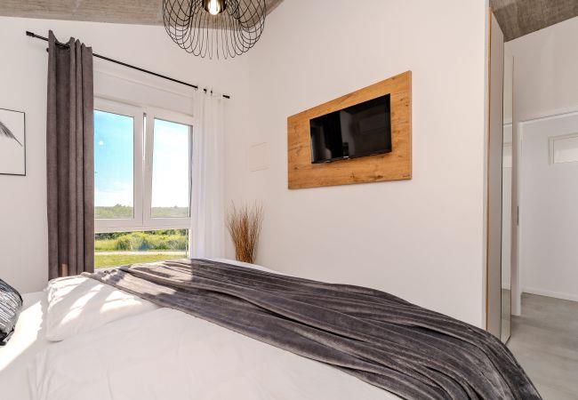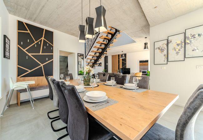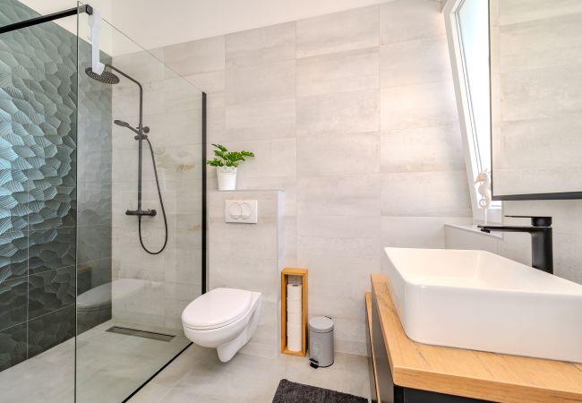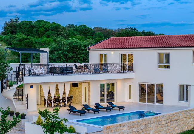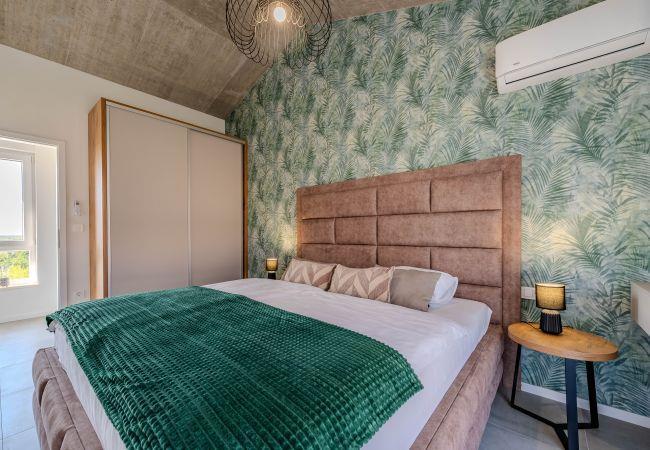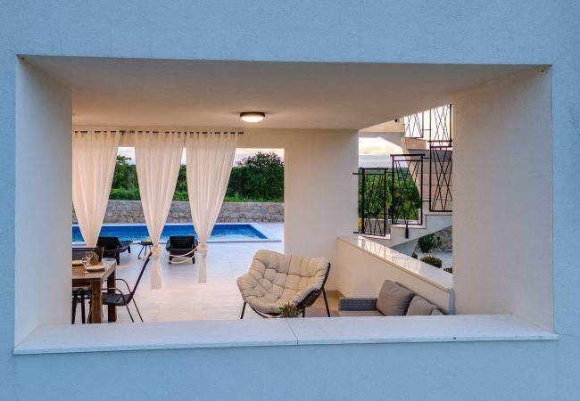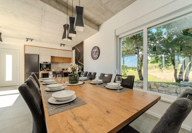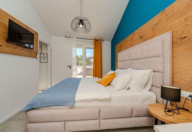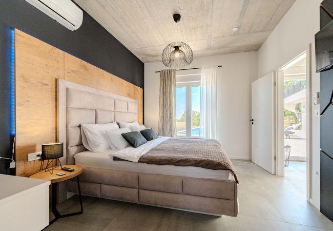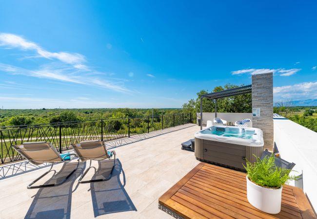 Villa Sunset Grusi is a newly built, fully air-conditioned and modernly decorated villa whose design and eye for detail will surely leave you breathless. The villa can accommodate up to 8 people in 4 bedrooms and 3.5 bathrooms, which are spread over two floors. On the ground floor of the house there is a fully equipped kitchen, a beautiful dining room and a living room where the whole family can be comfortably accommodated. There is also a separate toilet on the ground floor, as well as a room with a large double bed and a private bathroom, equipped with air conditioning and television. Upstairs there is another bathroom and 3 rooms with large double beds, each of which has air conditioning and television, and one room has a private bathroom. In addition to the beautiful bedrooms, there is also a large terrace with a Jacuzzi on the first floor, and space for drinking morning coffee or perhaps evening cocktails. The terrace is connected by spiral stairs to the courtyard of the house, so the house has a circular flow. The yard of the house will certainly be the place where you will spend the most time because it contains a private swimming pool of 32 square meters as well as a summer kitchen which is covered together with the dining area.