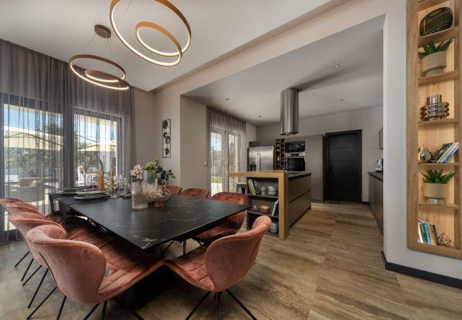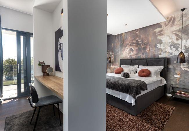 The spacious 400 m2 villa includes the main building, an annex and a summer kitchen. The main building has 4 elegant bedrooms with double beds, 4 luxurious bathrooms and two balconies, ideal for relaxing with your morning coffee. The ground floor, which is completely open plan, features a modern space with a kitchen, dining room and living room, richly illuminated by natural light. The annex is the real gem of this villa, with a spacious bedroom, bathroom and separate toilet, as well as a large dining room with a fireplace and its own kitchen. In the basement of the annex there is an entertainment area with billiards, table football, darts and a PlayStation console, while wine lovers can enjoy the wine room with a bar. With 5 double beds, sofas and extra beds, Villa Quercus can comfortably accommodate up to 13 people, and more beds will be available upon request.