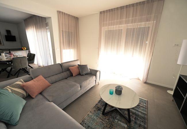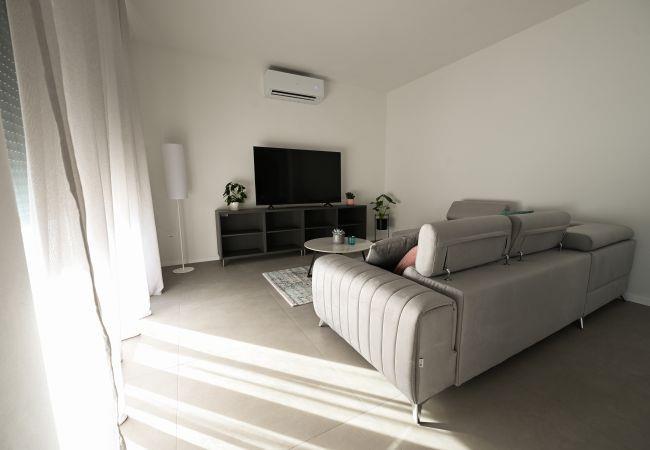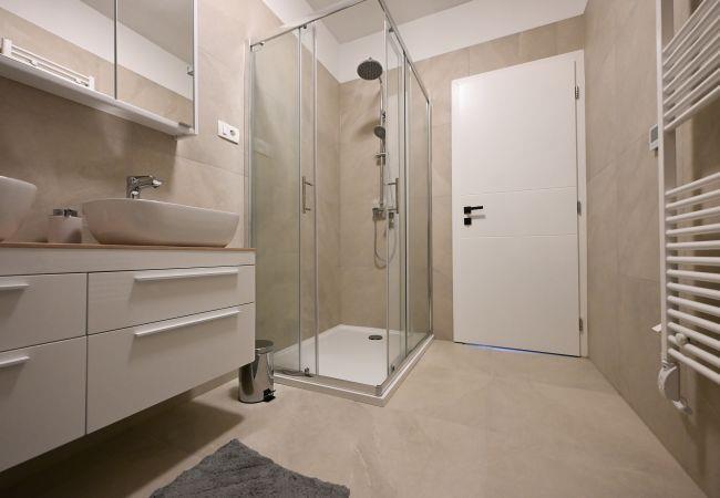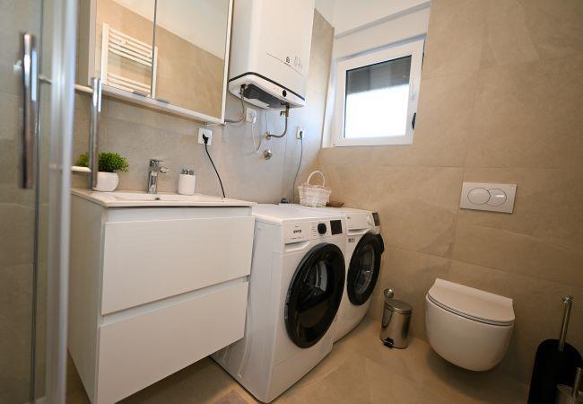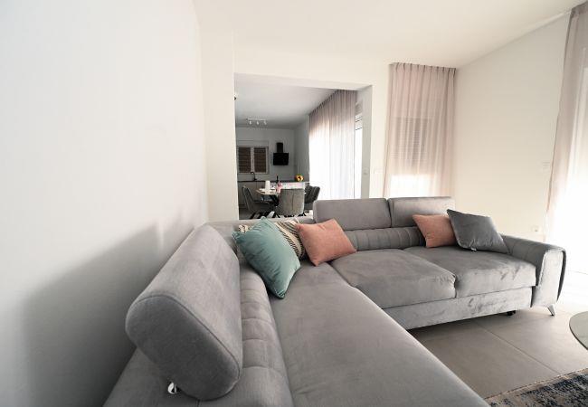 The villa accommodates six guests in three spacious bedrooms, each with a double bed (180x200 cm). One or two additional guests can sleep on a sofa bed in the living room. There are two modern bathrooms with showers, one of which is equipped with a washing machine and dryer, making longer stays more convenient.