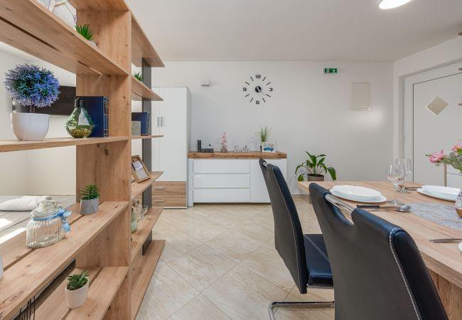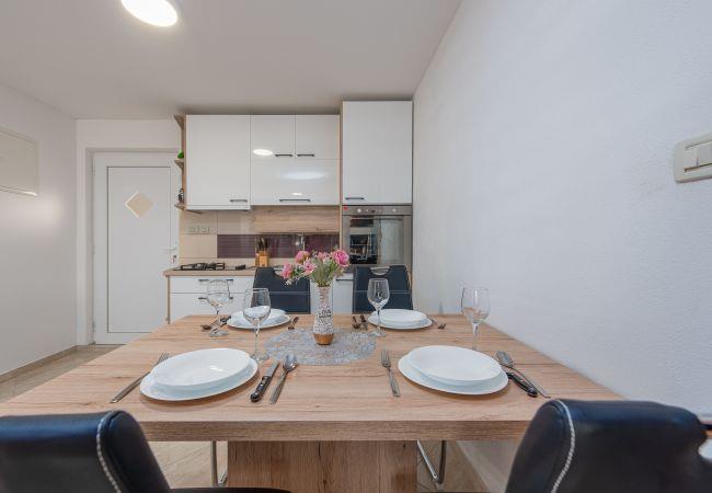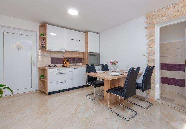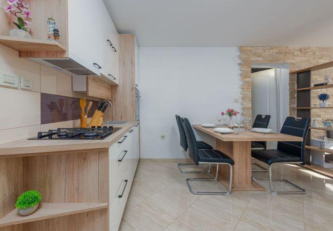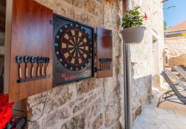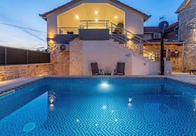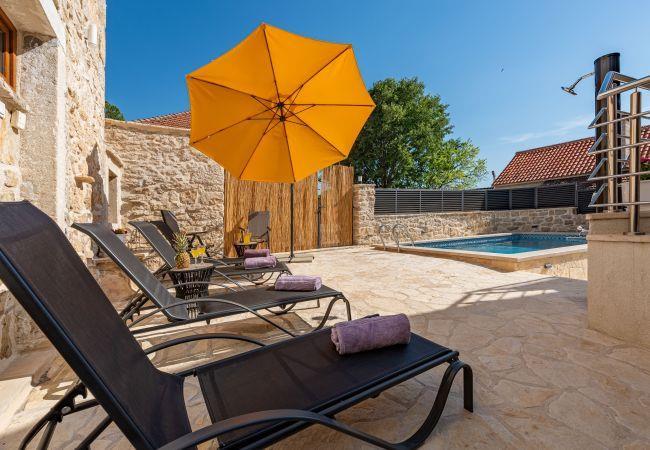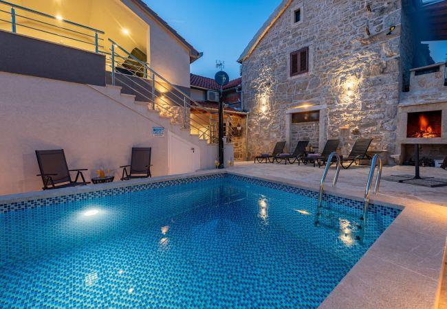 The two-story house itself can comfortably accommodate 6 guests. The heated swimming pool is surrounded by lounge chairs for relaxation and a terrace with a barbecue, for enjoying traditional Dalmatian specialties. On the ground floor there is a separate apartment with a kitchen, dining and sleeping area, and a separate bathroom. The first floor of the house houses another living space with a kitchen, dining room and living room with access to the terrace, and two bedrooms with a separate bathroom.