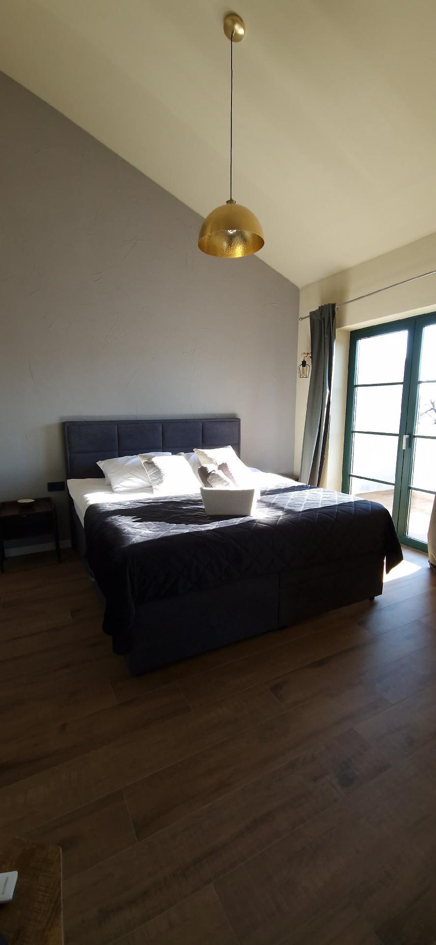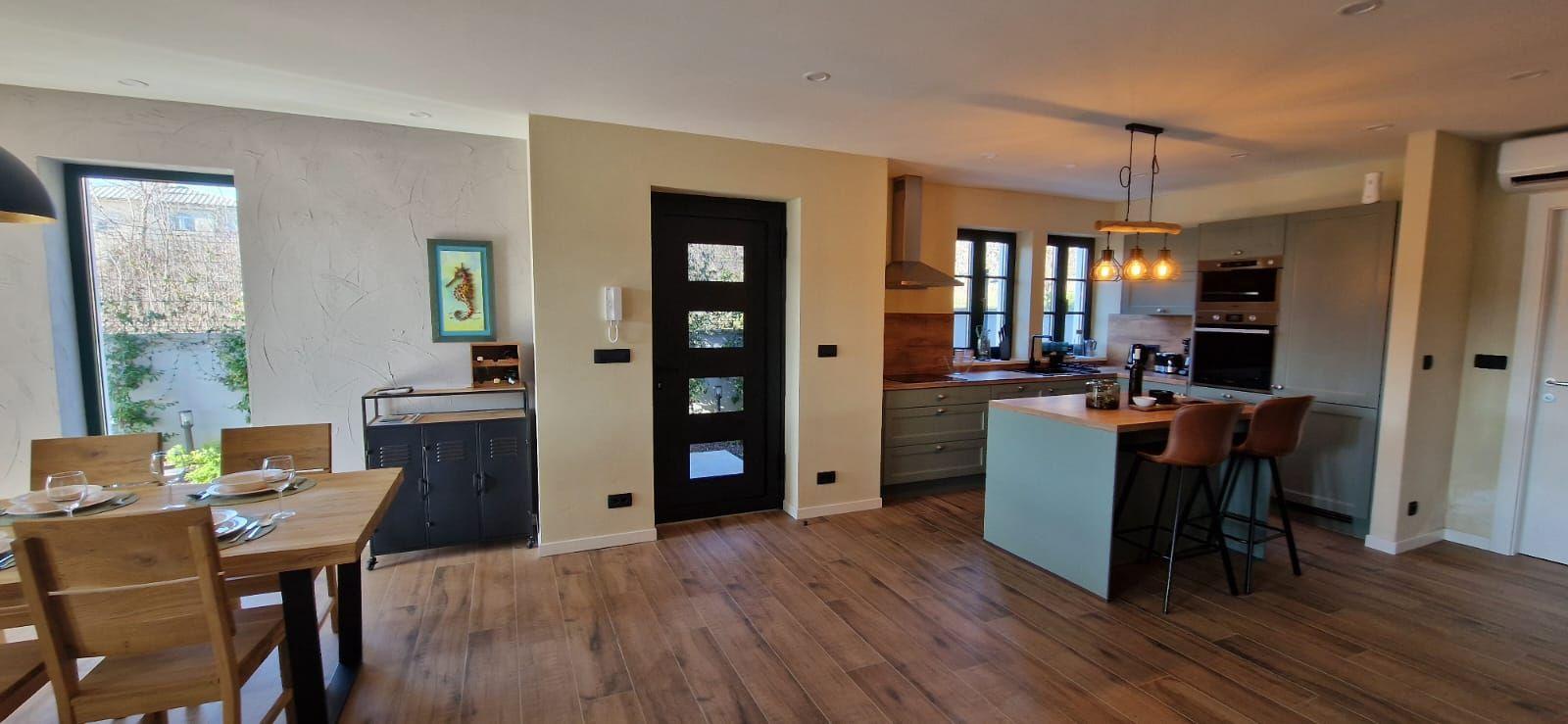 Inside, the villa boasts a large open space on the ground floor, integrating the kitchen and living room into a single harmonious area, complemented by a spacious bathroom. The accommodation is equipped with air conditioning throughout, ensuring your utmost comfort. Guests have access to a range of modern amenities, including a washing machine, induction hob, filter coffee machine, dishwasher, electric kettle, and a games console, making both entertaining and daily living a breeze.