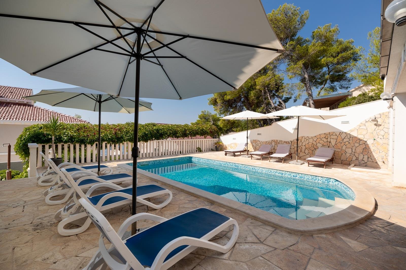 House can accommodate 11 guests. Beds are situated in 5 sleeping rooms, within 128m2. Guests can use a private terrace to enjoy the warm summer evenings. The house offers the sea view. For full enjoyment and relaxation there is a private barbecue for this accommodation guests only. During stay, there is a private pool for relaxation and pleasure.