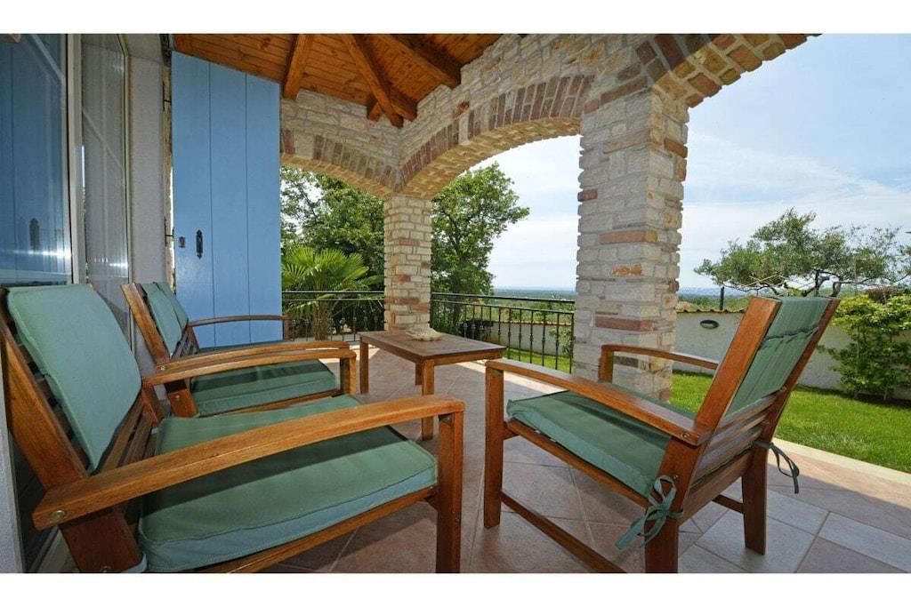 Villa Dany is located in Kastelir, a village about 15 km from Porec. The villa features a pool, a fully fenced garden, a private garden, and a parking space within the garden. It consists of three bedrooms, a toilet and a bathroom with a bathtub, a fully equipped kitchen, and a spectacular living room overlooking the pool and the sea. The villa is perfect for children. The entire villa is on the ground floor only. There are two bedrooms with double beds, and the third bedroom has a smaller double bed (140 x 200 cm) and a bunk bed. The living area is combined with a dining area, overlooking the covered terrace on one side and the pool on the other.