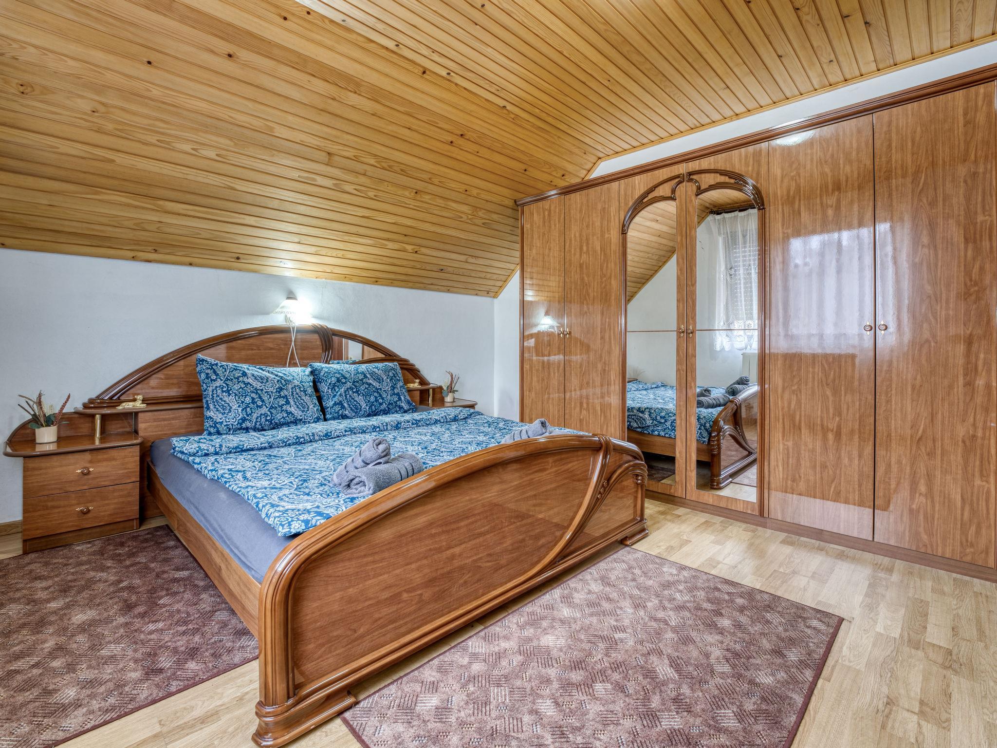 6-room house 200 m2 on 2 levels. Living/dining room with cable TV. Exit to the balcony. 1 room with 1 double bed (2 x 90 cm, length 190 cm). 1 room with 2 beds (90 cm, length 200 cm). Open kitchen (2 hot plates, oven, toaster, kettle, microwave, freezer, electric coffee machine). Bath/WC. Heating. Top floor: living/dining room with sloping ceilings, ceiling height 140 - 270 cm with cable TV. Exit to the balcony. 1 room, ceiling height 140 - 270 cm with 1 double bed (2 x 90 cm, length 200 cm). With sloping ceilings, ceiling height 140 - 270 cm with 2 beds (90 cm, length 200 cm). Open kitchen (2 hot plates, oven, dishwasher, kettle, freezer, electric coffee machine). Shower/WC. 2 balconies 12 m2. Balcony furniture, deck chairs (8). View of the forest. Facilities: Internet (WiFi, free). Please note: non-smoking house.
