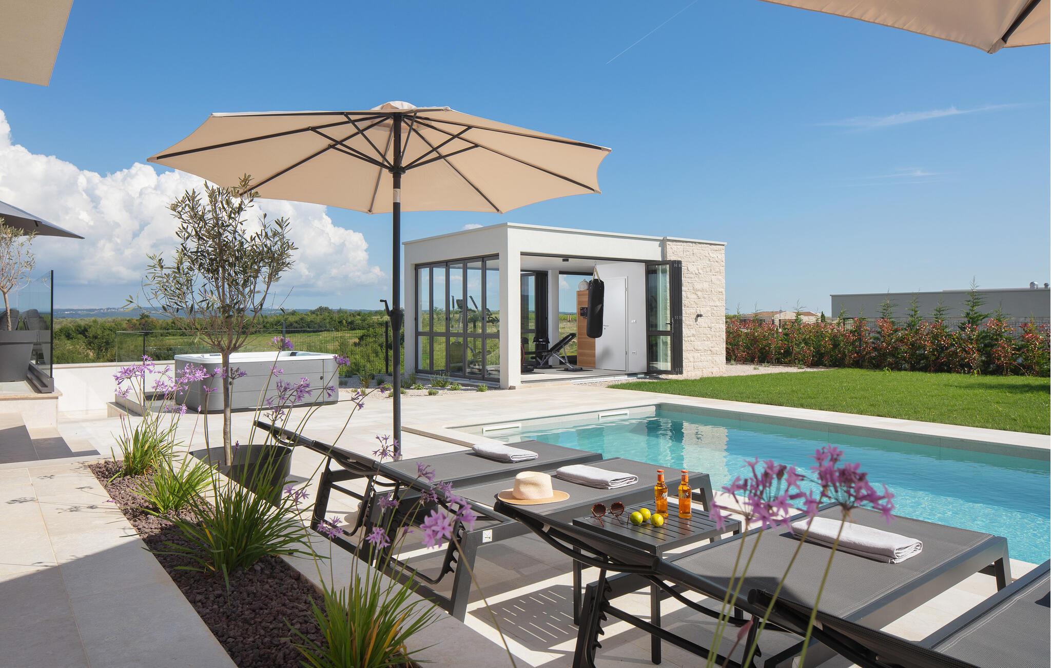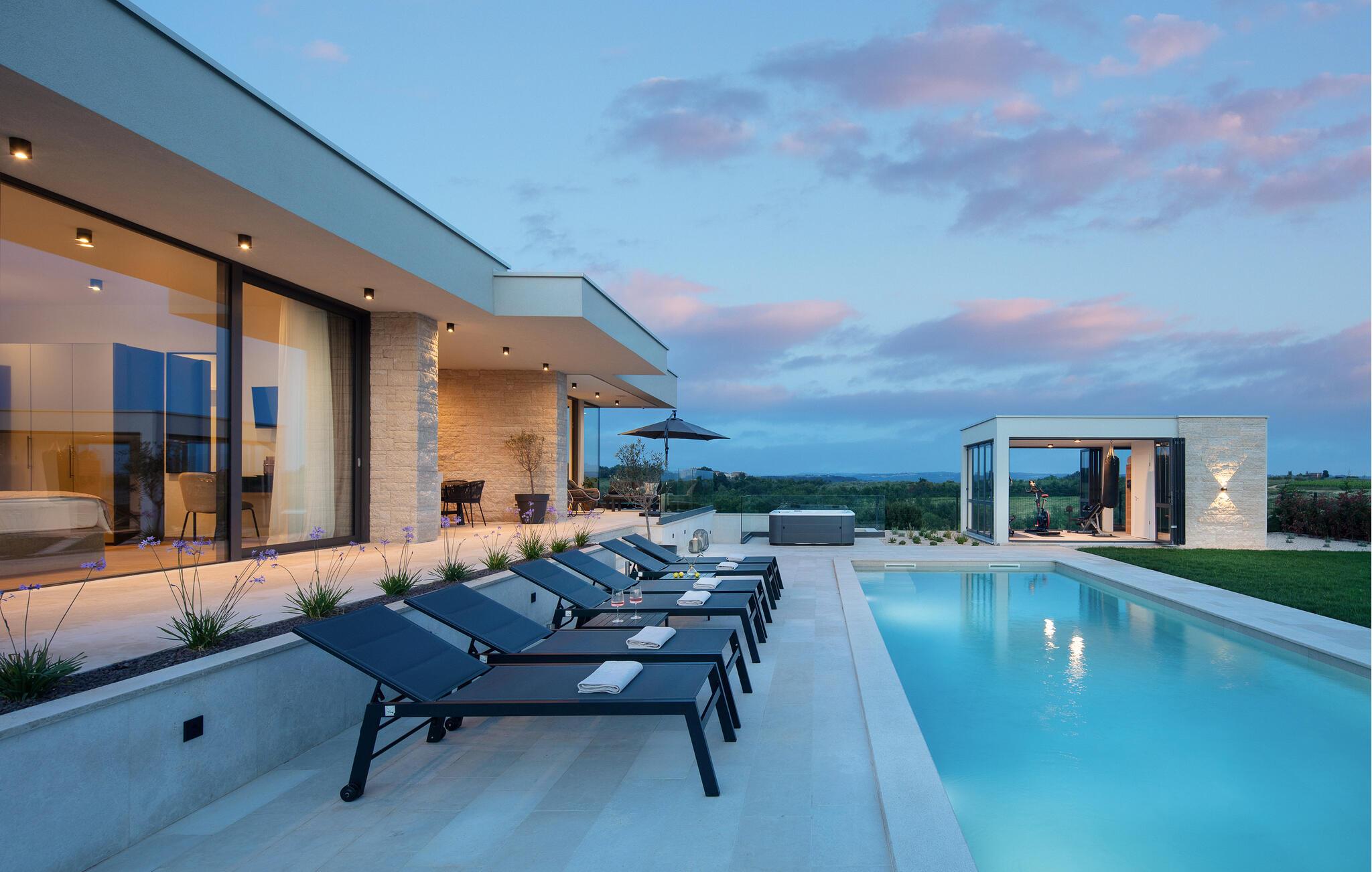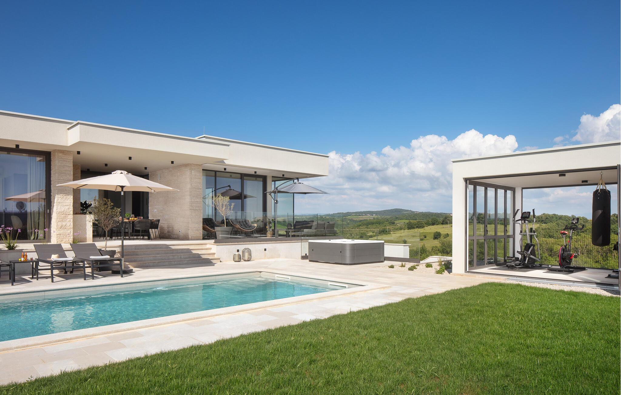 Auf der großen Terrasse und am Swimmingpool können Sie die Seele baumeln lassen, während das separate Fitnesshaus mit Panoramablick, Infrarotsauna und Whirlpool für Ihr persönliches Wellnesserlebnis sorgt.