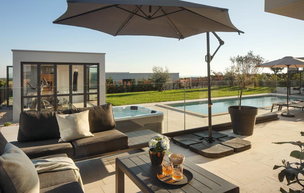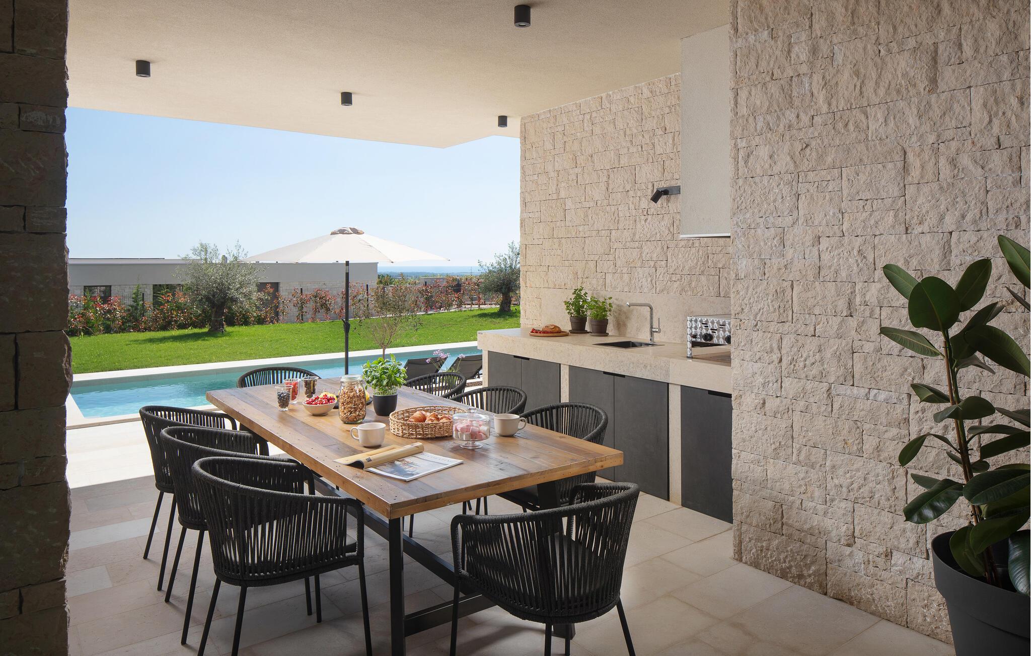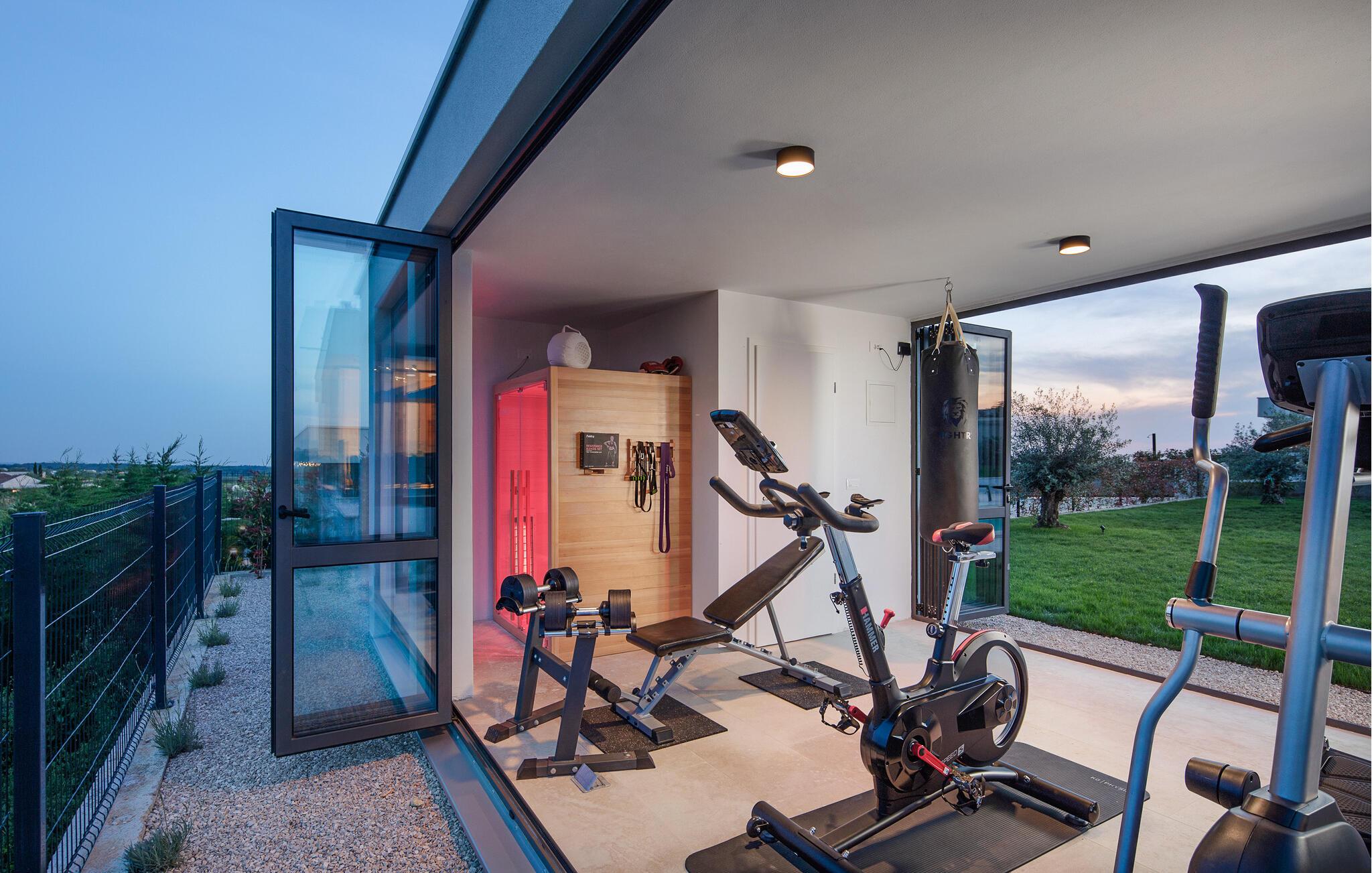 Auf der großen Terrasse und am Swimmingpool können Sie die Seele baumeln lassen, während das separate Fitnesshaus mit Panoramablick, Infrarotsauna und Whirlpool für Ihr persönliches Wellnesserlebnis sorgt.