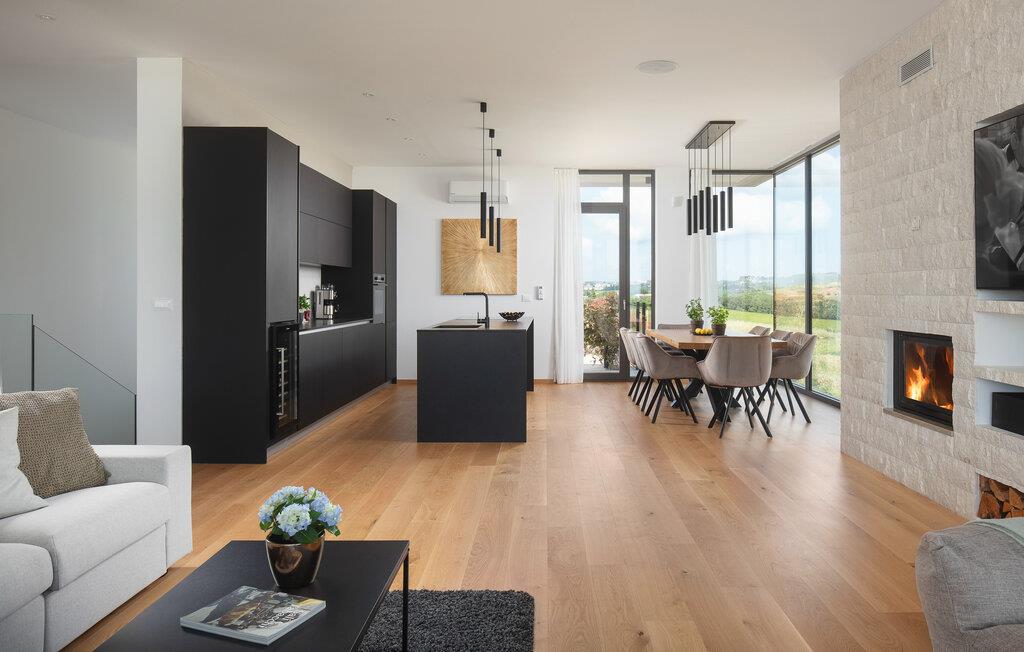 Erleben Sie Luxus pur in diesem modernen, großzügigen Ferienhaus, das mit seiner stilvollen Einrichtung und bodentiefen Fenstern begeistert. Hochwertige Materialien und ein ausgewähltes Design schaffen für Sie ein exklusives Ambiente, das keine Wünsche offenlässt. Die großen Wohnräume öffnen sich zur weiten Landschaft und bieten einen atemberaubenden Blick bis zum Meer. Egal, ob Sie in der modernen Küche zaubern oder auf dem Sofa mit einem knisternden Kaminfeuer entspannen, Sie können hier einfach die Seele baumeln lassen.