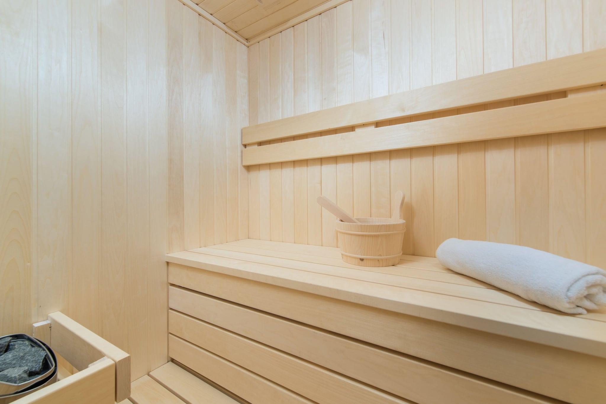 Ground floor: (Living room(TV(flatscreen, satellite), seating area, air conditioning), open kitchen(dining table, electric kettle, cooker, coffee machine, oven, microwave, dishwasher, fridge-freezer), bedroom(double bed, TV(flatscreen, satellite), air conditioning), bathroom(shower, washbasin, toilet), terrace(private)) On the 1st floor: (Bedroom with bathroom(double bed, TV(flatscreen, satellite), shower, washbasin, toilet, bidet, balcony, air conditioning), Bedroom with bathroom(double bed, TV(flatscreen, satellite), shower, washbasin, toilet, bidet, balcony, air conditioning), sauna(private), Bubble bath(private), terrace(private, fenced)) TV(flatscreen, satellite), heating, air conditioning, courtyard(private, fenced), terrace(private), garden(private), garden furniture, sun loungers, BBQ, parking, parasol, swimming pool(private, heated), lounge set
