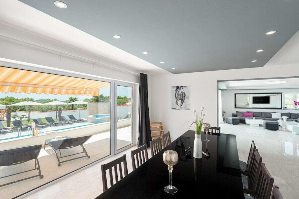 The villa is modern, tastefully furnished, and furnished with attention to detail. It consists of 6 bedrooms and 5 bathrooms. On the ground floor, there is a large living area overlooking the pool and terrace, a spacious dining area, a kitchen, and two double bedrooms, one of which has an en-suite bathroom. On the first floor, there are 4 bedrooms, each with an en-suite shower, one of which is equipped with a hot tub and a small gym, and the other with a sauna. Outside, there is a large garden, a hot tub, and a spacious, fully equipped outdoor kitchen with a large table and chairs.