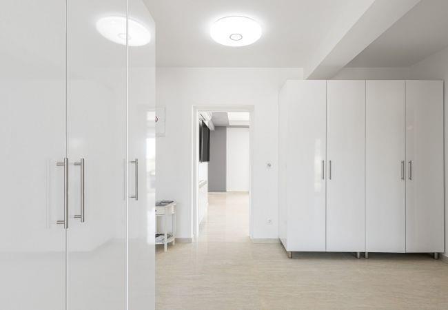 On the ground floor is a spacious living area with panoramic views of the pool and terrace, a generous dining area and a fully equipped modern kitchen, two double bedrooms, one featuring an en suite bathroom.