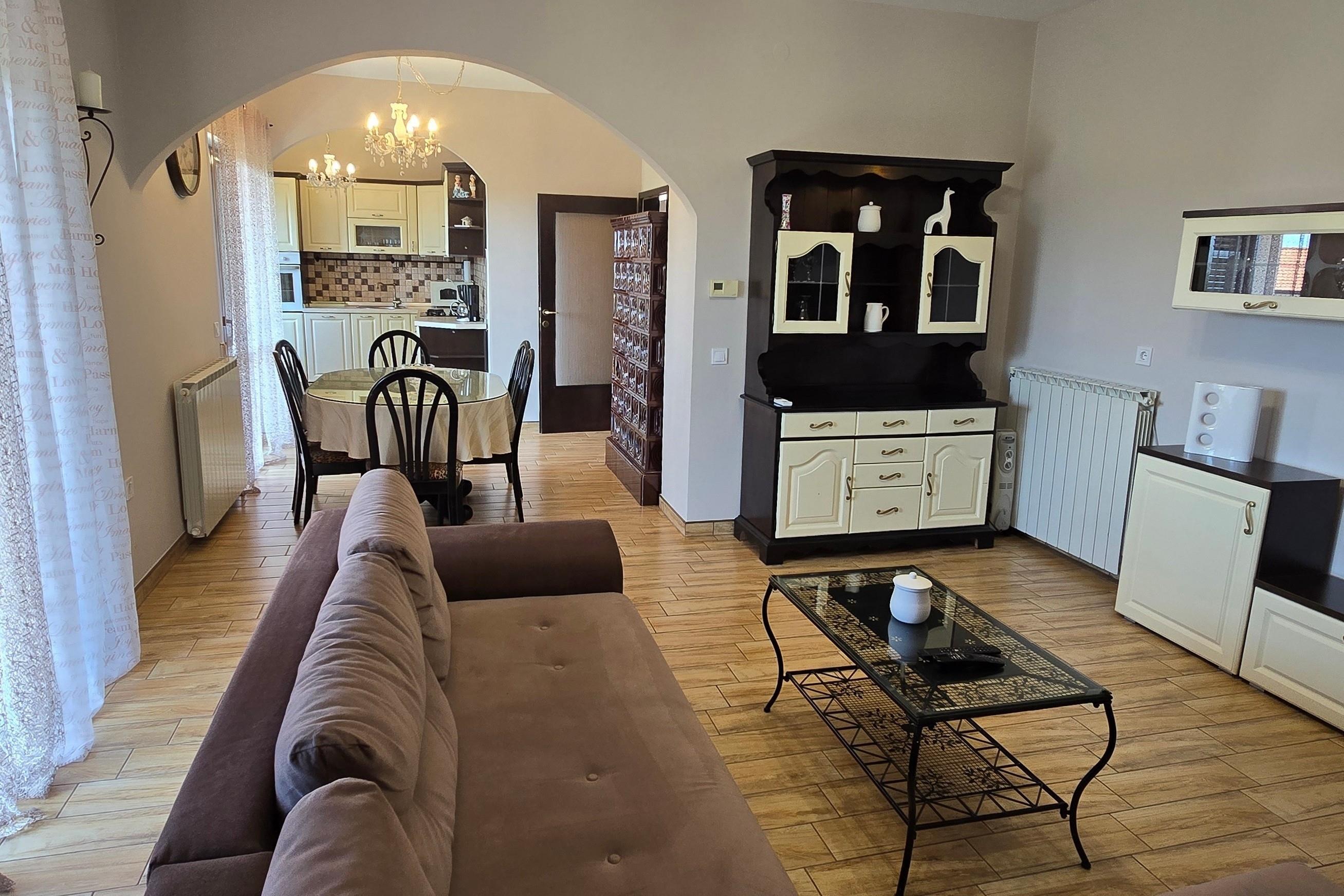 Apartment can accommodate 8 guests. Beds are situated in 3 sleeping rooms, but also in the living room, within 108m2. Guests can use a private terrace to enjoy the warm summer evenings. Food can be prepared using barbecue which is shared with other guests too. This accommodation unit welcomes pets at an additional charge.