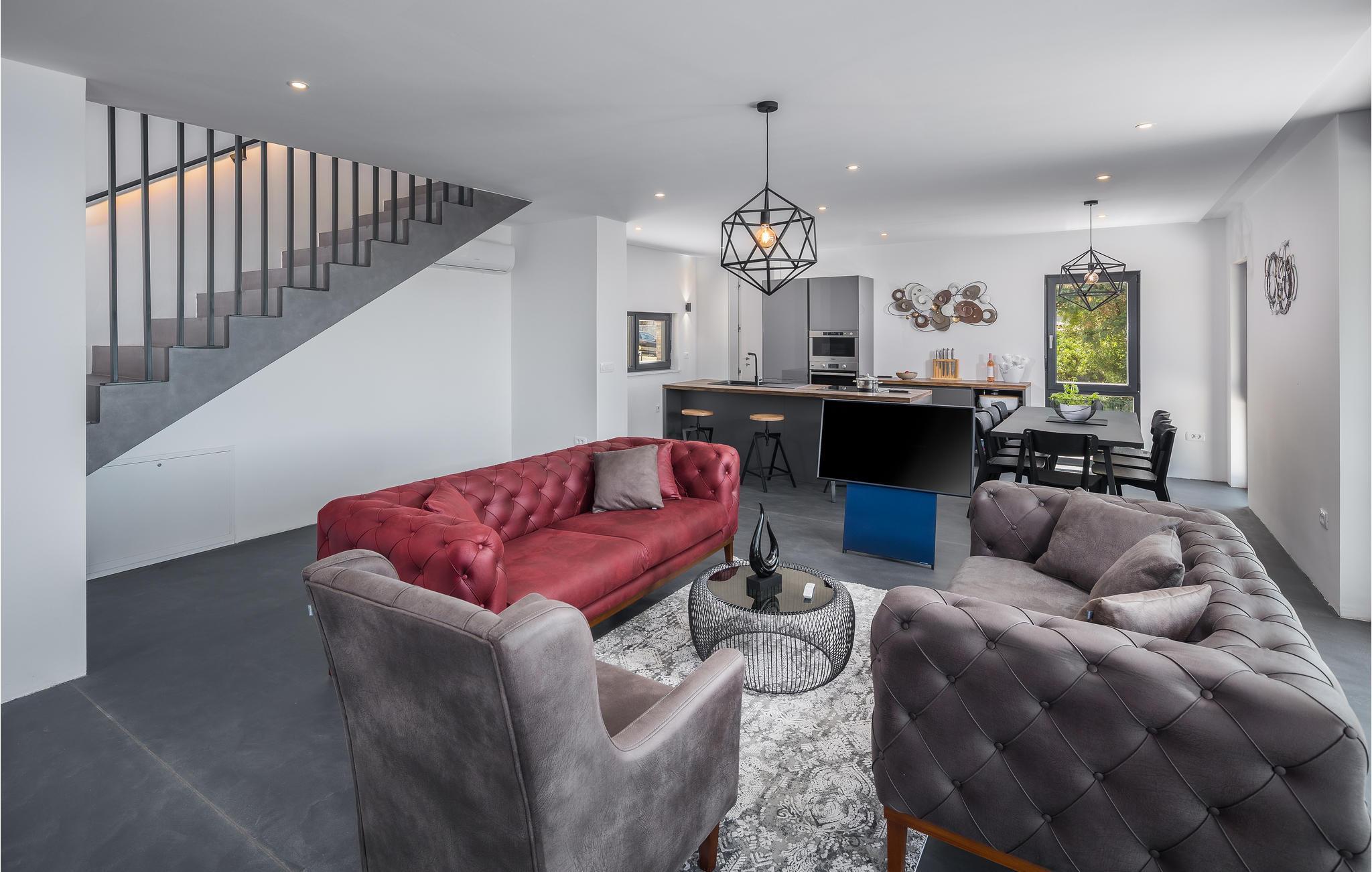 Der dunkle Einrichtungsstil des Hauses verleiht Eleganz und trotzdem können Sie es sich im Wohnraum gemütlich machen und die Beine hochlegen. Die tolle Küche gibt Ihnen den Raum gemeinsam Ihr Liebensessen zu kochen und auf der überdachten Terrasse zu essen.