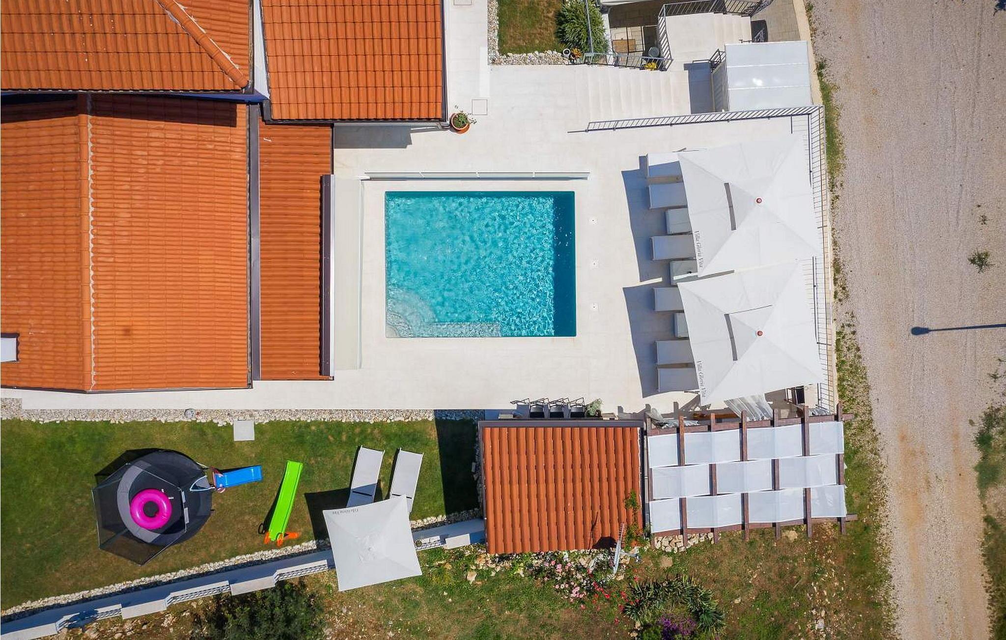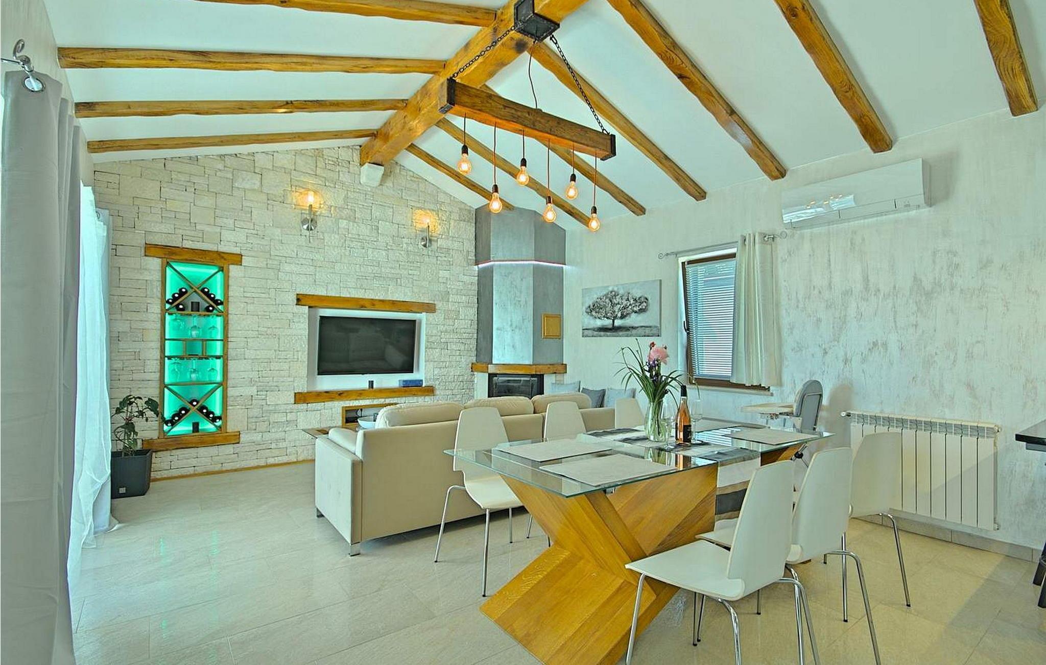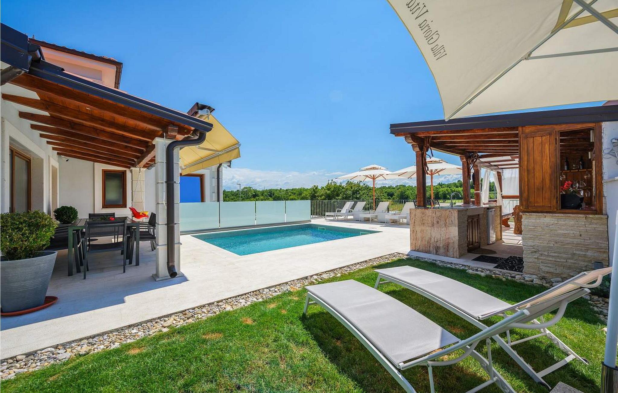 Villa Gloria Vita ist ein wunderschönes, modernes Ferienhaus in der ruhigen ländlichen Umgebung von Nova Vas, nur 8 km von Novigrad und dem nächsten Strand entfernt. Dieser friedliche Rückzugsort bietet einfachen Zugang zu lokalen Tavernen, Weinkellern und dem nahe gelegenen Wasserpark Istralandia. Die Villa befindet sich auf einem umzäunten Grundstück mit einem einladenden Außenpool, einer Sommerküche mit Gasgrill und einer Bar im Freien. Die überdachten Terrassen eignen sich perfekt, um Mahlzeiten im Freien zu genießen, während im Inneren der Villa ein Whirlpool für ultimative Entspannung zur Verfügung steht. Das Erdgeschoss der Villa erstreckt sich über drei Ebenen und umfasst ein gemütliches Wohnzimmer mit einer voll ausgestatteten Küche, einem Essbereich und einem Schlafsofa sowie zwei komfortable Schlafzimmer, beide mit eigenem Bad. Der erste Stock beherbergt ein privates Schlafzimmer mit Balkon und eigenem Bad und bietet einen ruhigen Rückzugsort. Unter dem Sonnendeck bietet das Untergeschoss einen klimatisierten Wohnbereich mit einem großen Esstisch, eine Küche mit Wein- und Bierzapfanlagen, einem Sofa, einem Fernseher und einem zusätzlichen Schlafzimmer mit Dusche/WC. Bitte beachten Sie, dass diese Unterkunft keine Jugendgruppen oder Junggesellenabschiede akzeptiert. Eine Jugendgruppe in dieser Unterkunft besteht aus Personen im Alter von 26 Jahren oder darunter.