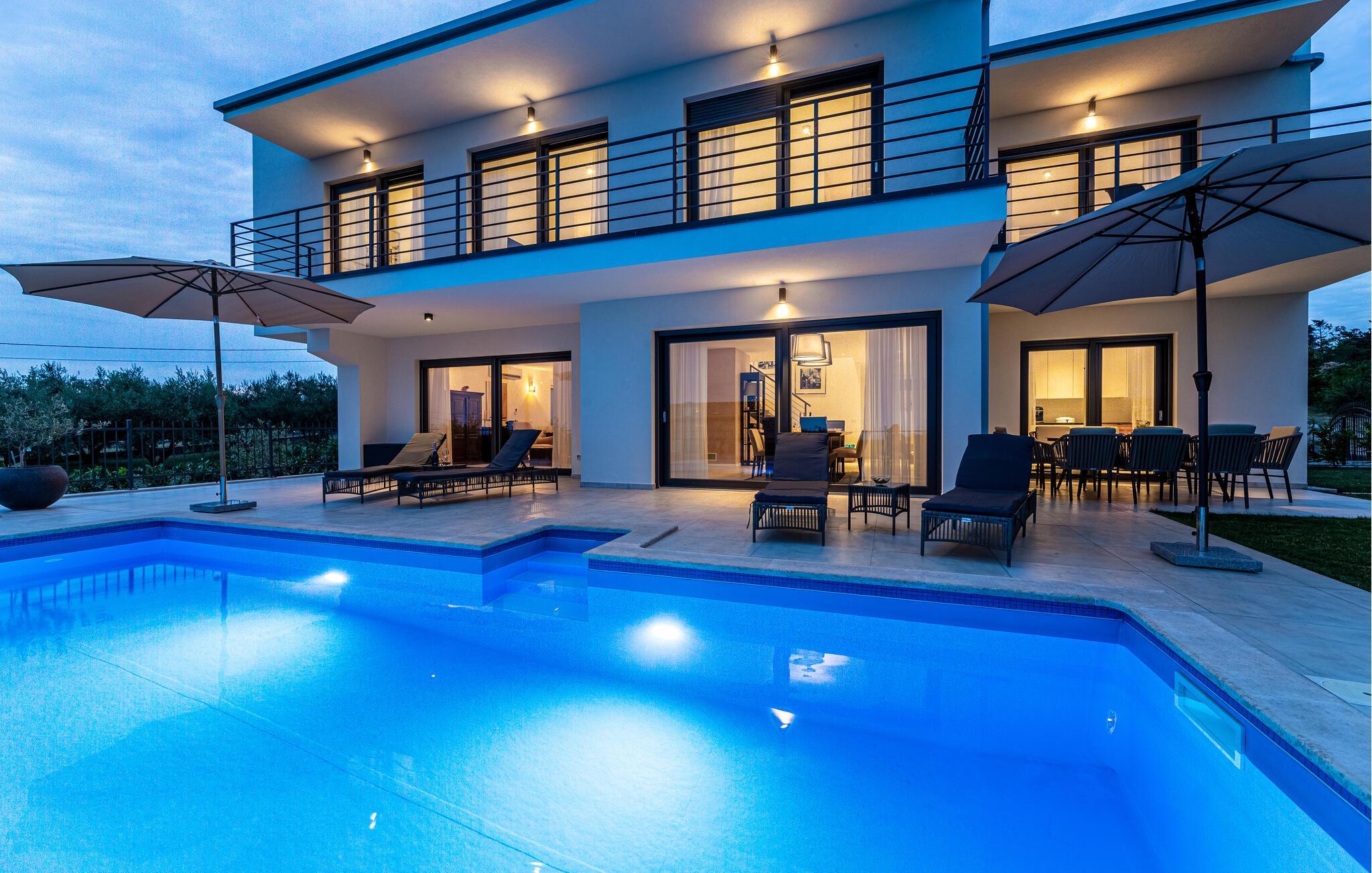 In einem ruhigen Ort heißt Sie dieses moderne und große Ferienhaus mit Pool und Meerblick willkommen.