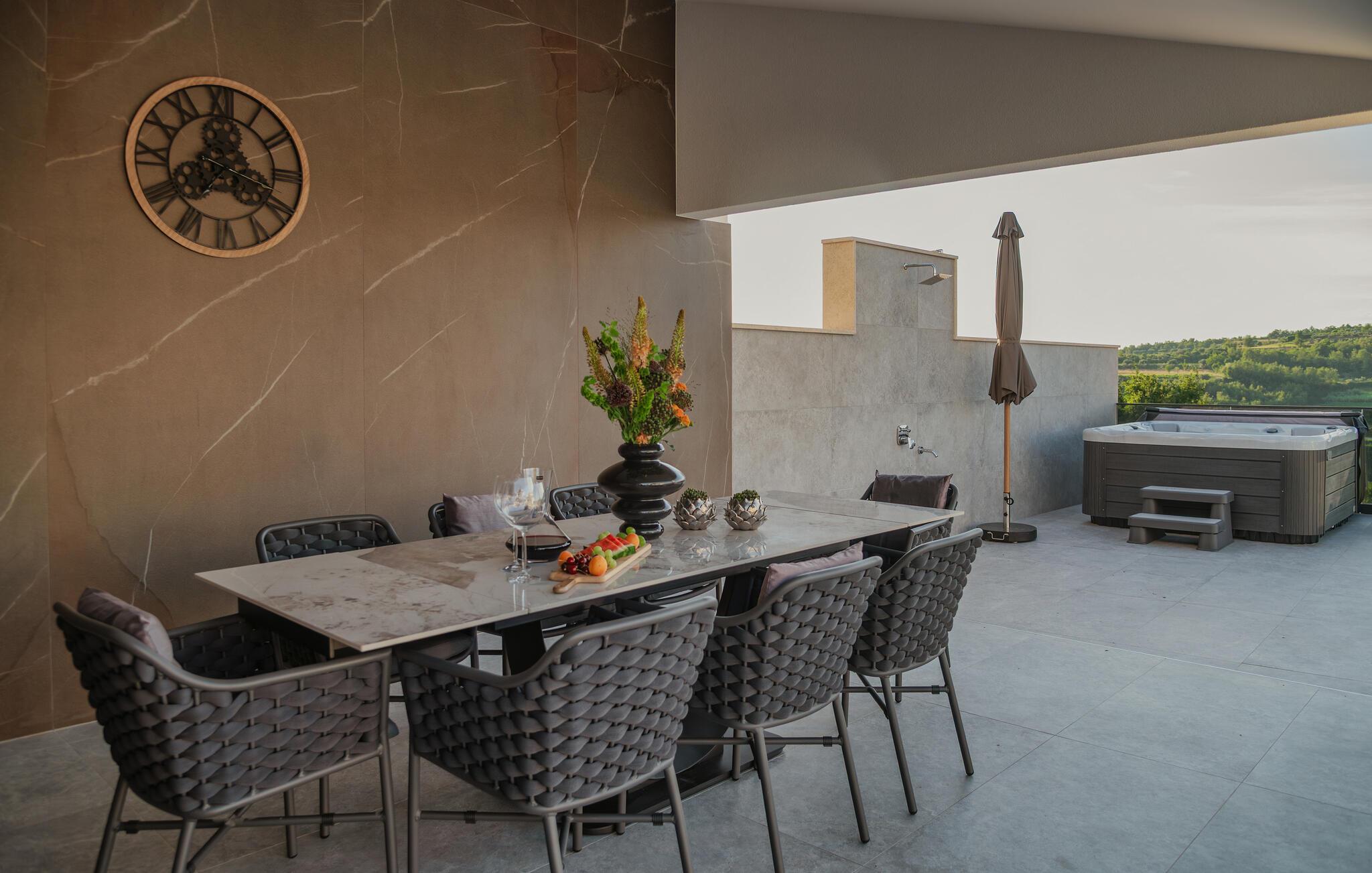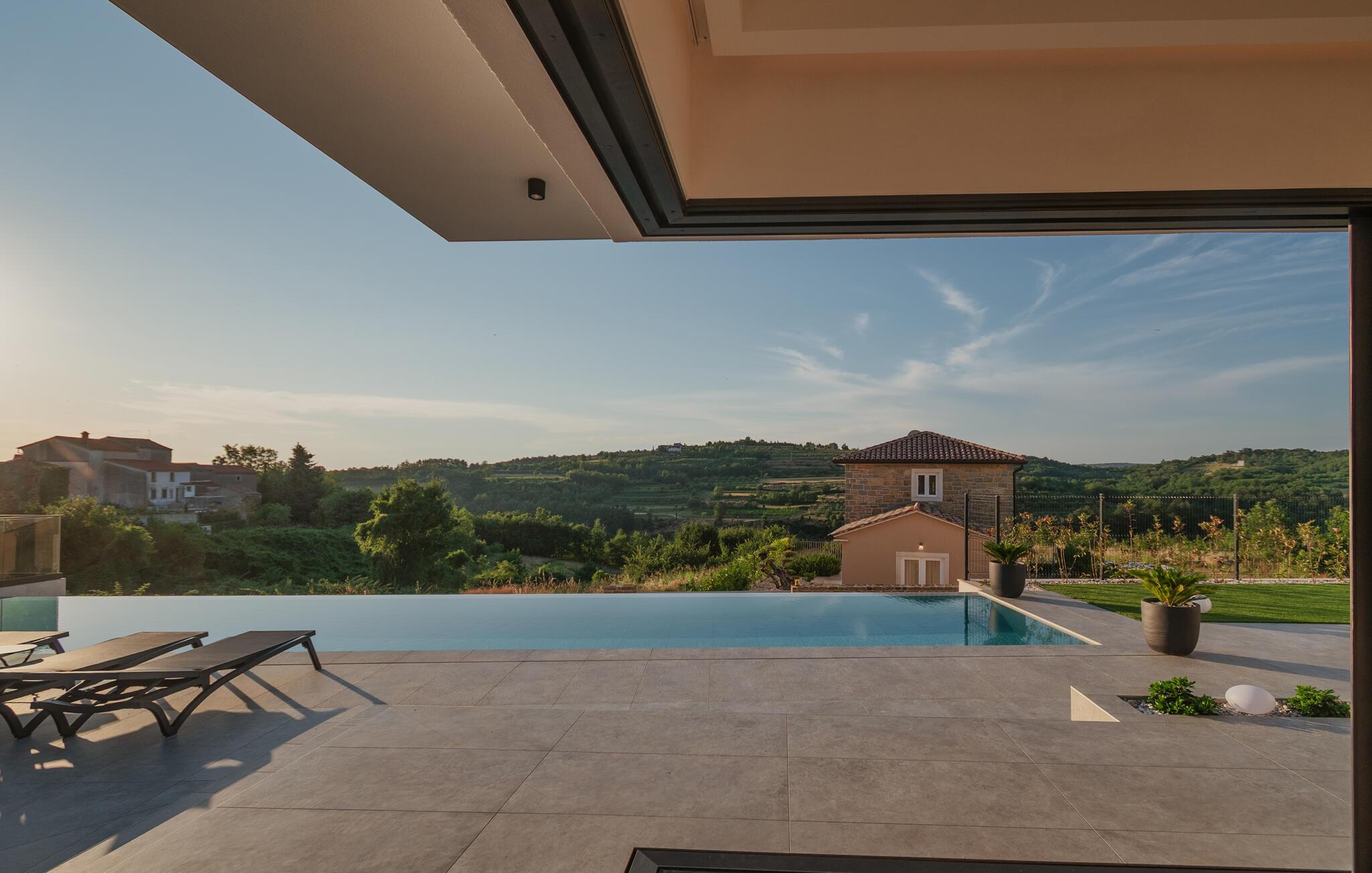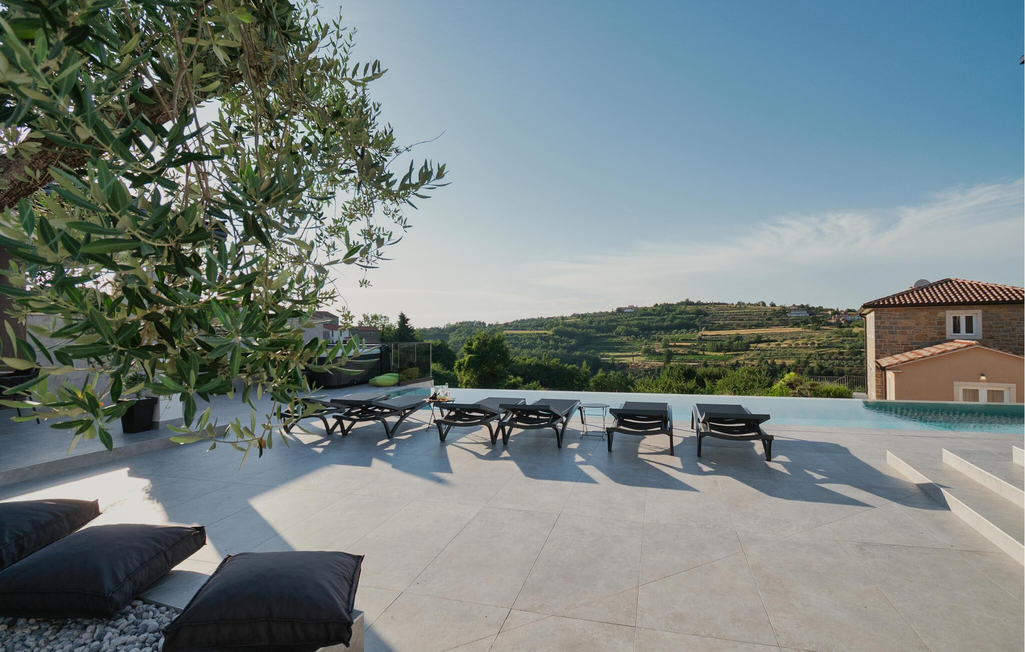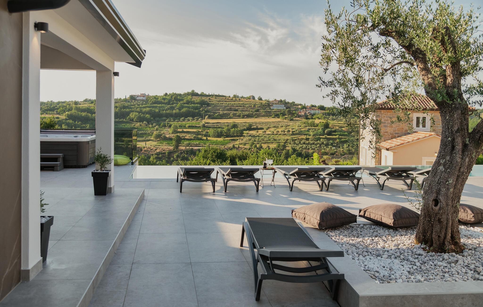 Von Ihrer schönen, weitläufigen Terrasse genießen Sie einen beruhigenden Blick auf die malerische Landschaft, den Sie beim Sonnenbaden am herrlichen Infinity-Pool oder im Whirlpool auf sich wirken lassen können. Entfachen Sie abends den Grill und freuen Sie sich auf eine stimmungsvolle Atmosphäre am beleuchteten Pool.