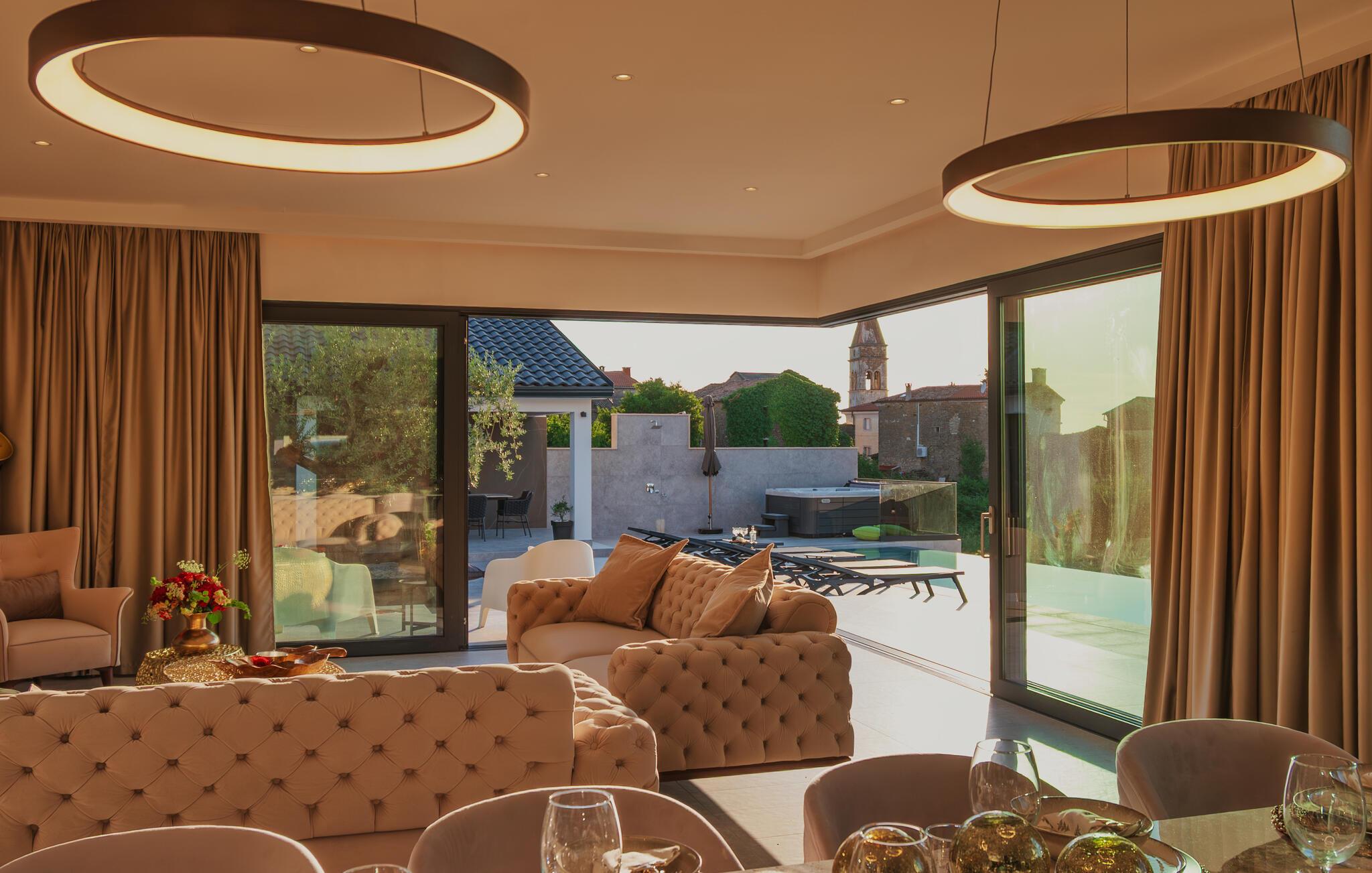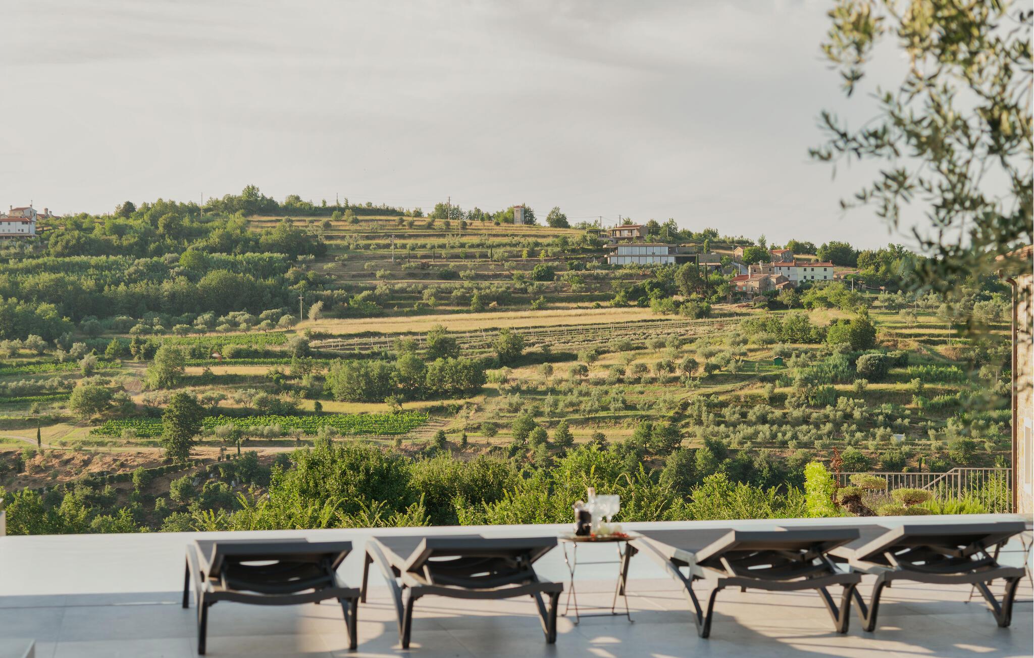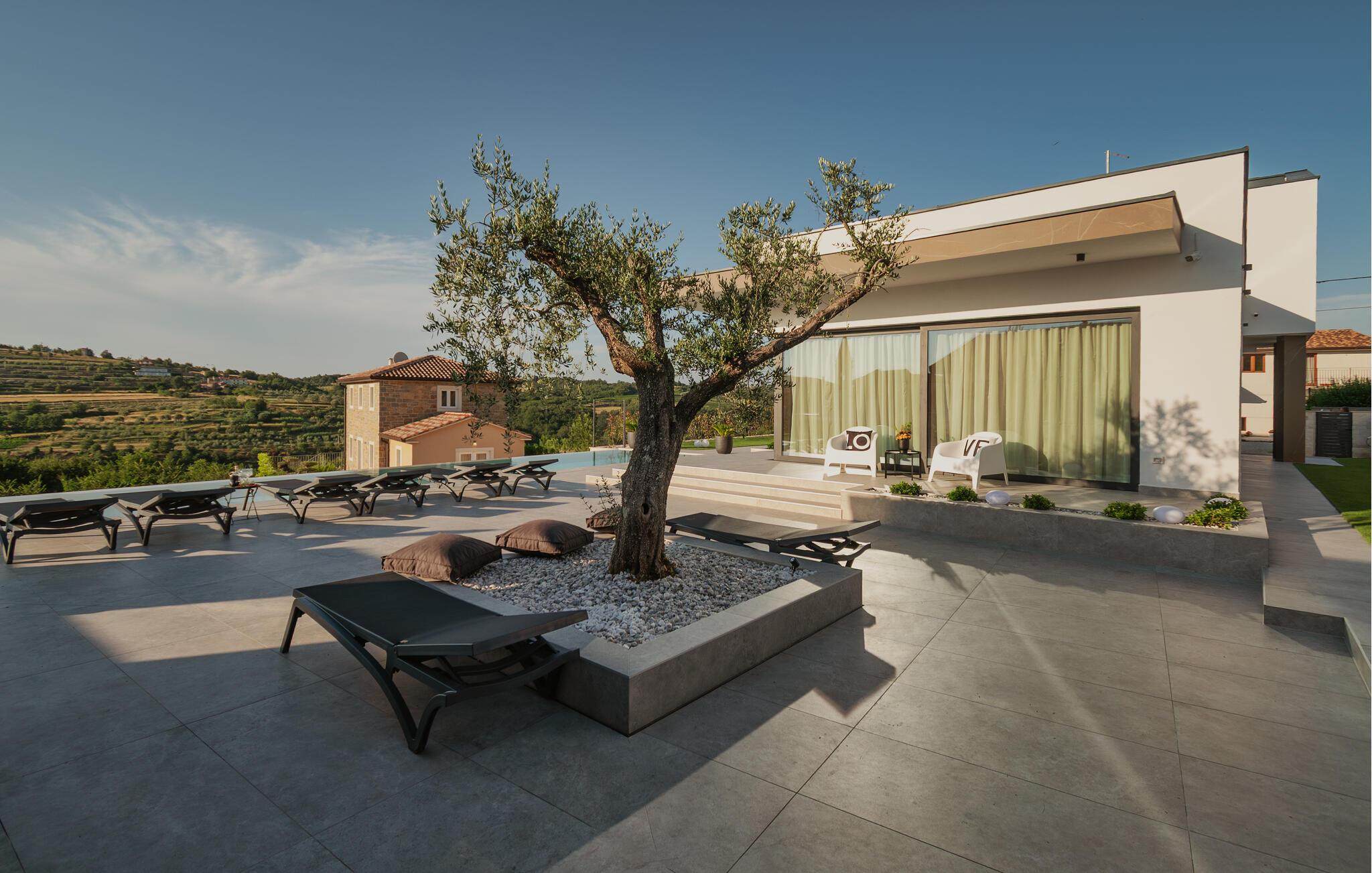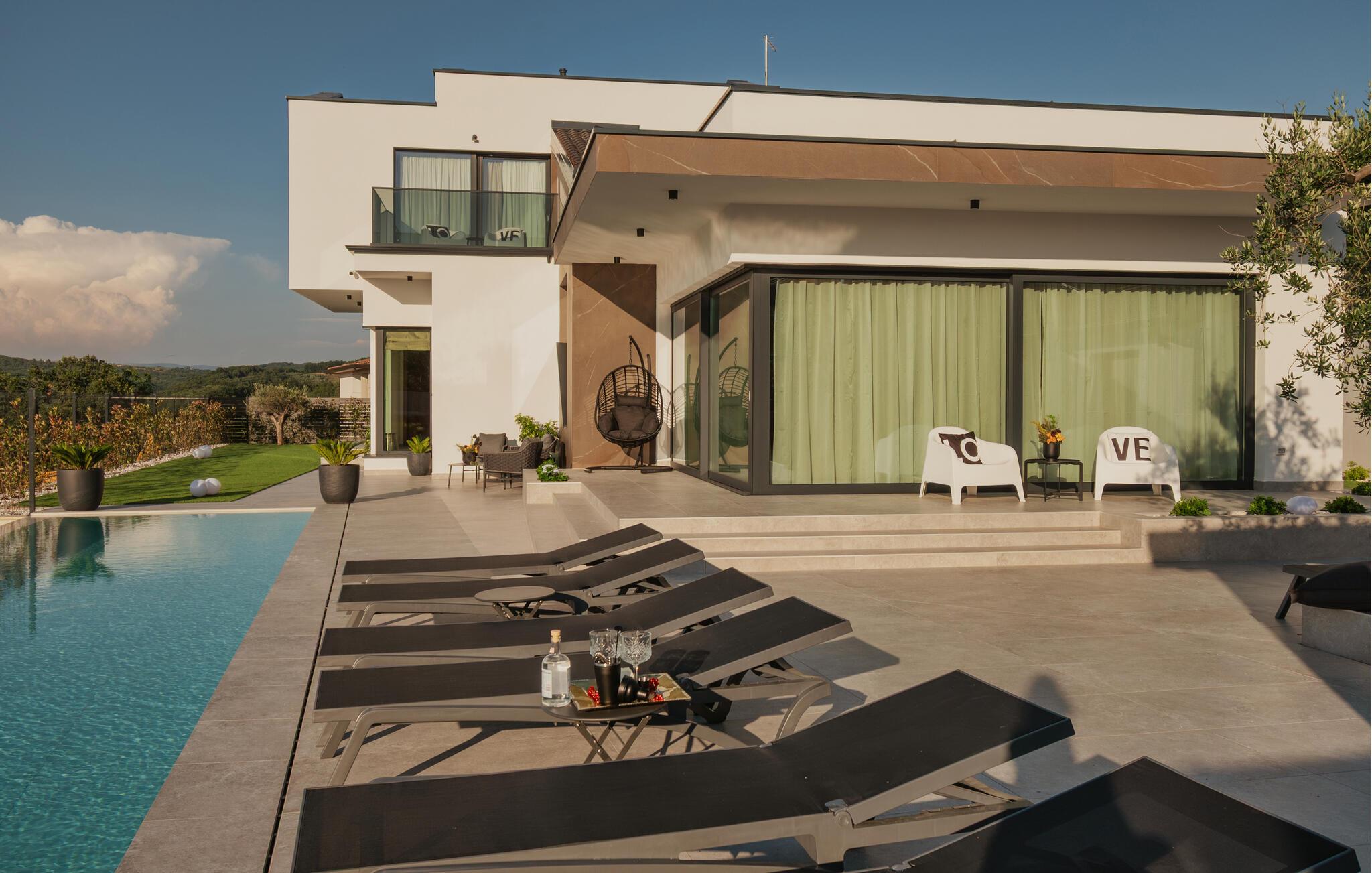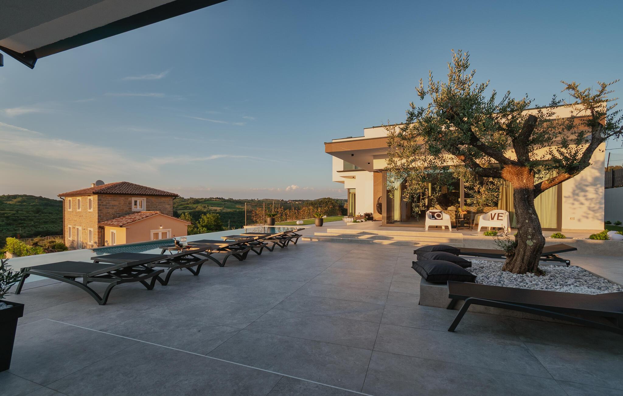 Von Ihrer schönen, weitläufigen Terrasse genießen Sie einen beruhigenden Blick auf die malerische Landschaft, den Sie beim Sonnenbaden am herrlichen Infinity-Pool oder im Whirlpool auf sich wirken lassen können. Entfachen Sie abends den Grill und freuen Sie sich auf eine stimmungsvolle Atmosphäre am beleuchteten Pool.