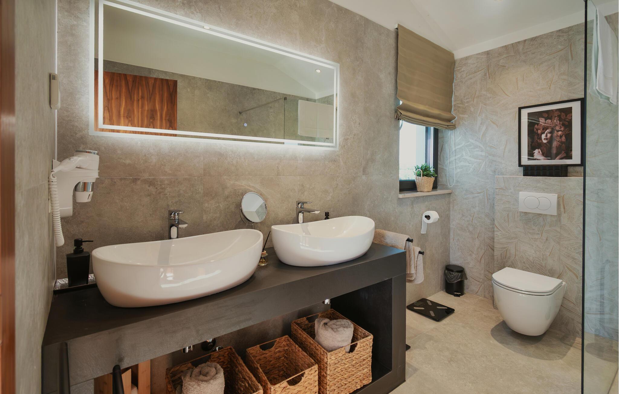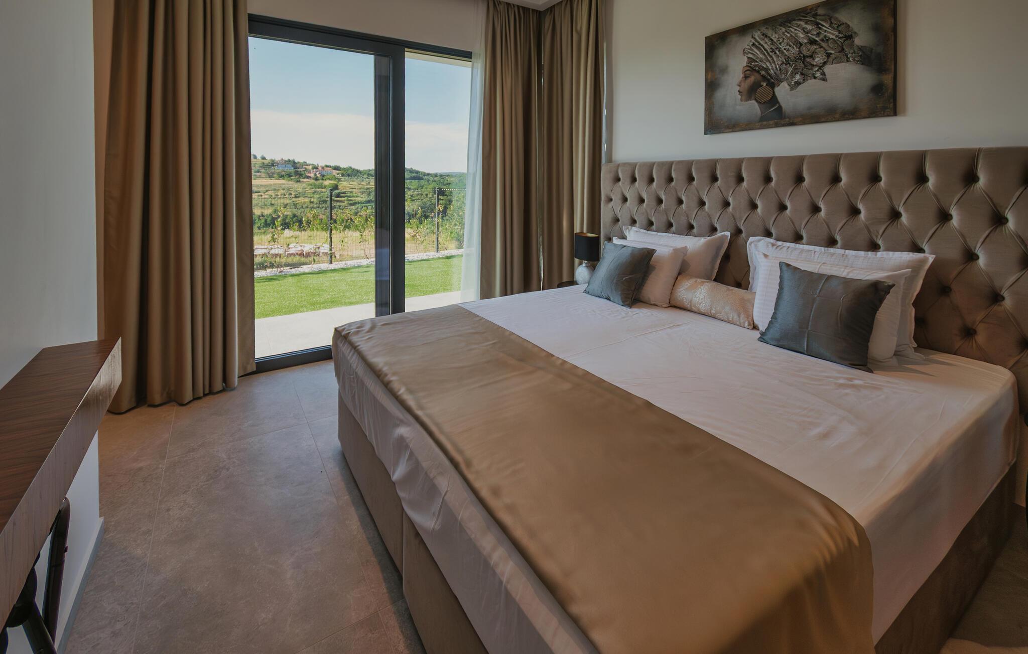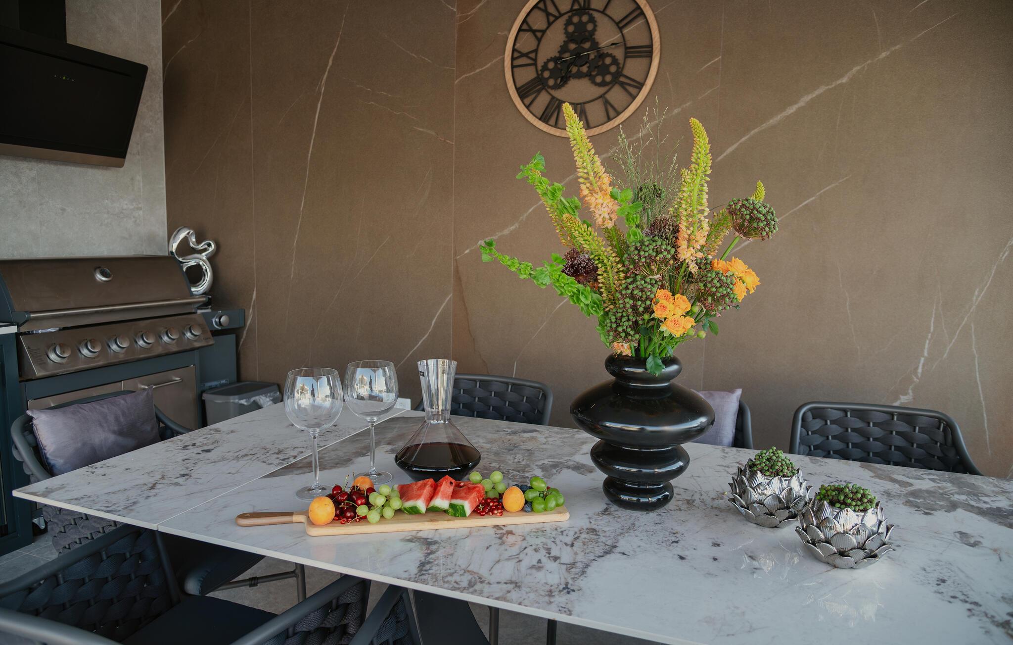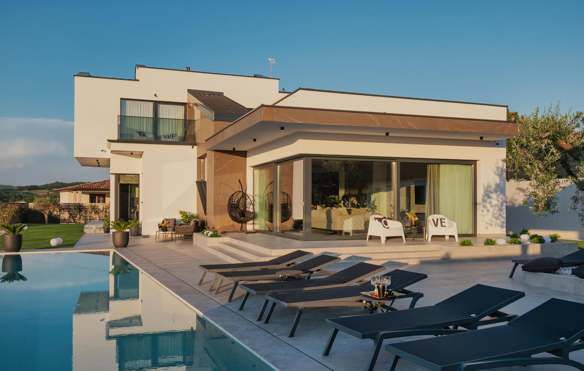 Von Ihrer schönen, weitläufigen Terrasse genießen Sie einen beruhigenden Blick auf die malerische Landschaft, den Sie beim Sonnenbaden am herrlichen Infinity-Pool oder im Whirlpool auf sich wirken lassen können. Entfachen Sie abends den Grill und freuen Sie sich auf eine stimmungsvolle Atmosphäre am beleuchteten Pool.