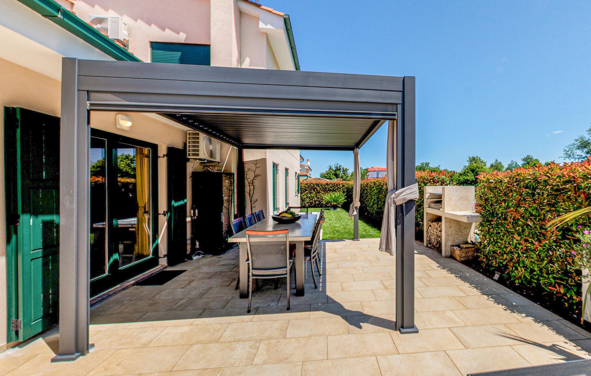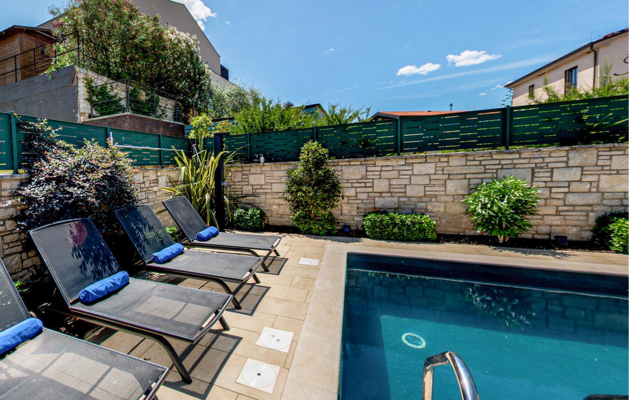 Treten Sie beim ersten Sonnenstrahl auf die großzügige Terrasse und genießen Sie die mediterrane Stimmung. Springen Sie in den Pool und nehmen Sie ein erfrischendes Bad, bevor Sie sich mit einem kühlen Getränk auf den Sonnenliegen entspannen.
