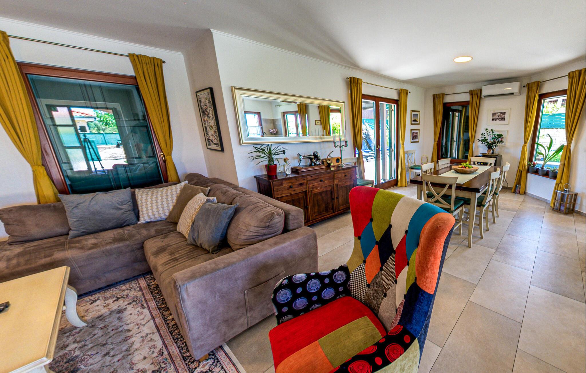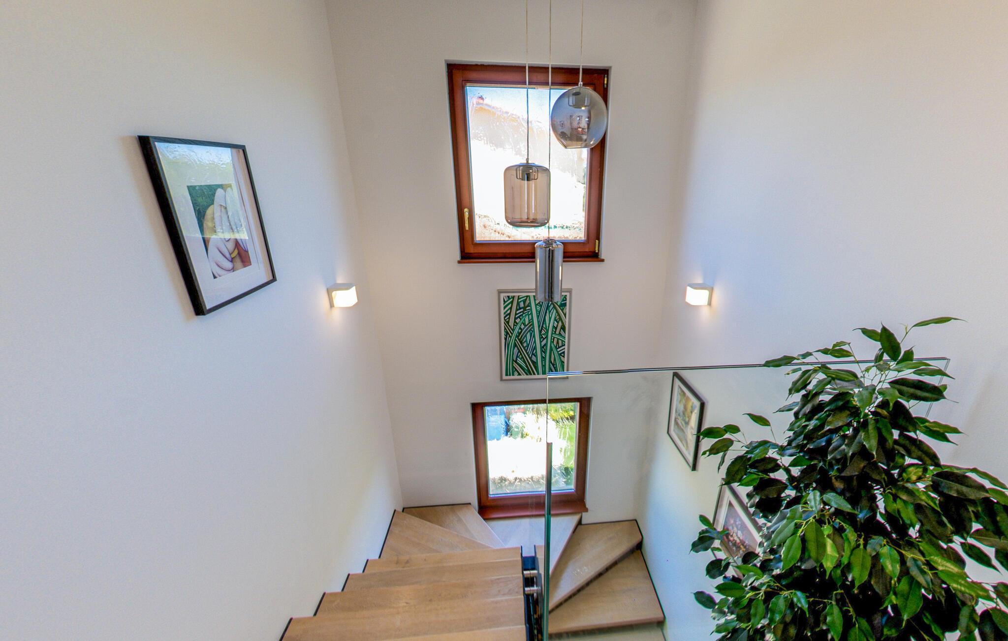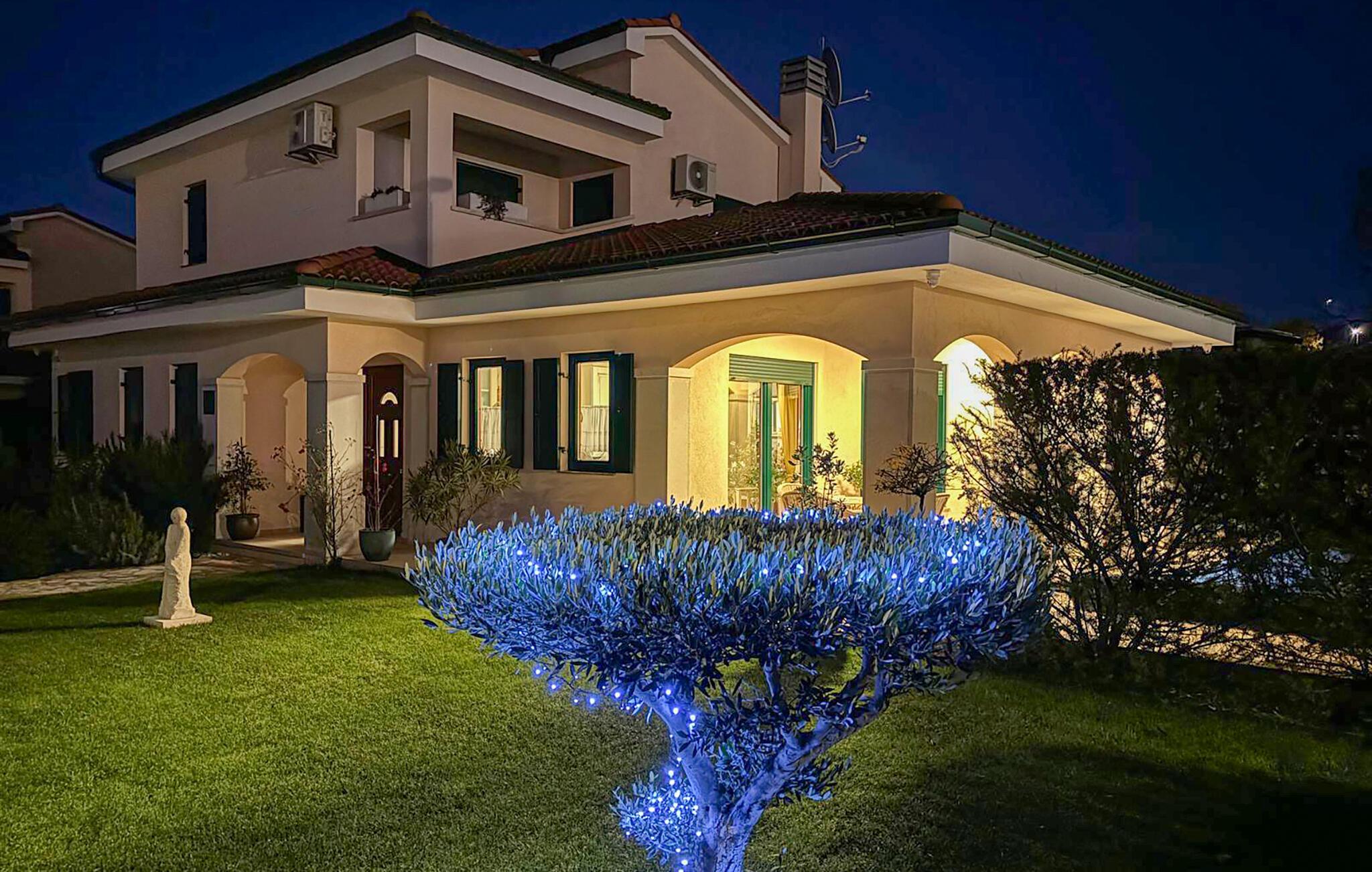 In diesem Ferienhaus schaffen Modernität und Gemütlichkeit eine ebenso einladende wie entspannte Atmosphäre. Helle, großzügige Räume, elegantes Mobiliar und liebevolle Details sorgen für ein Ambiente, in dem Sie schnell zur Ruhe kommen können. Vertiefen Sie sich auf dem bequemen Sofa in ein gutes Buch oder kochen Sie gemeinsam in der modernen Küche und lassen Sie den Abend bei einem Glas Wein ausklingen. Oder genießen Sie einfach den einzigartigen Blick auf das Meer und die Dolomiten sowie auf drei Länder: Kroatien, Slowenien und Italien.