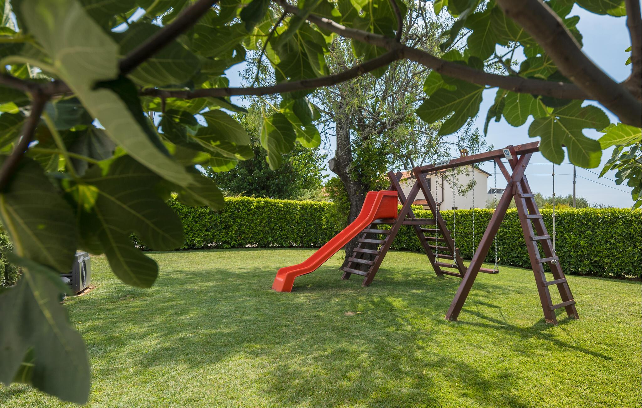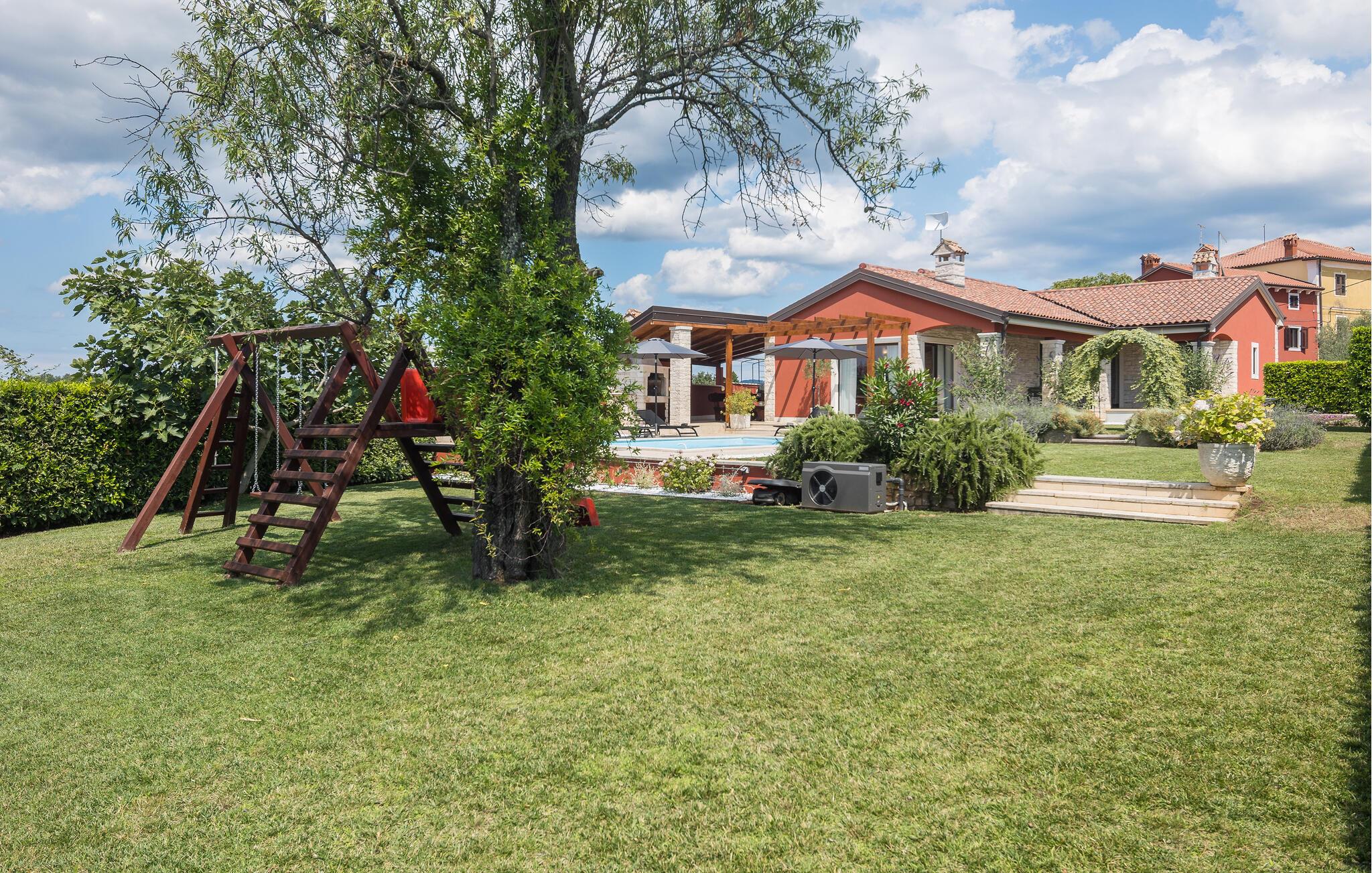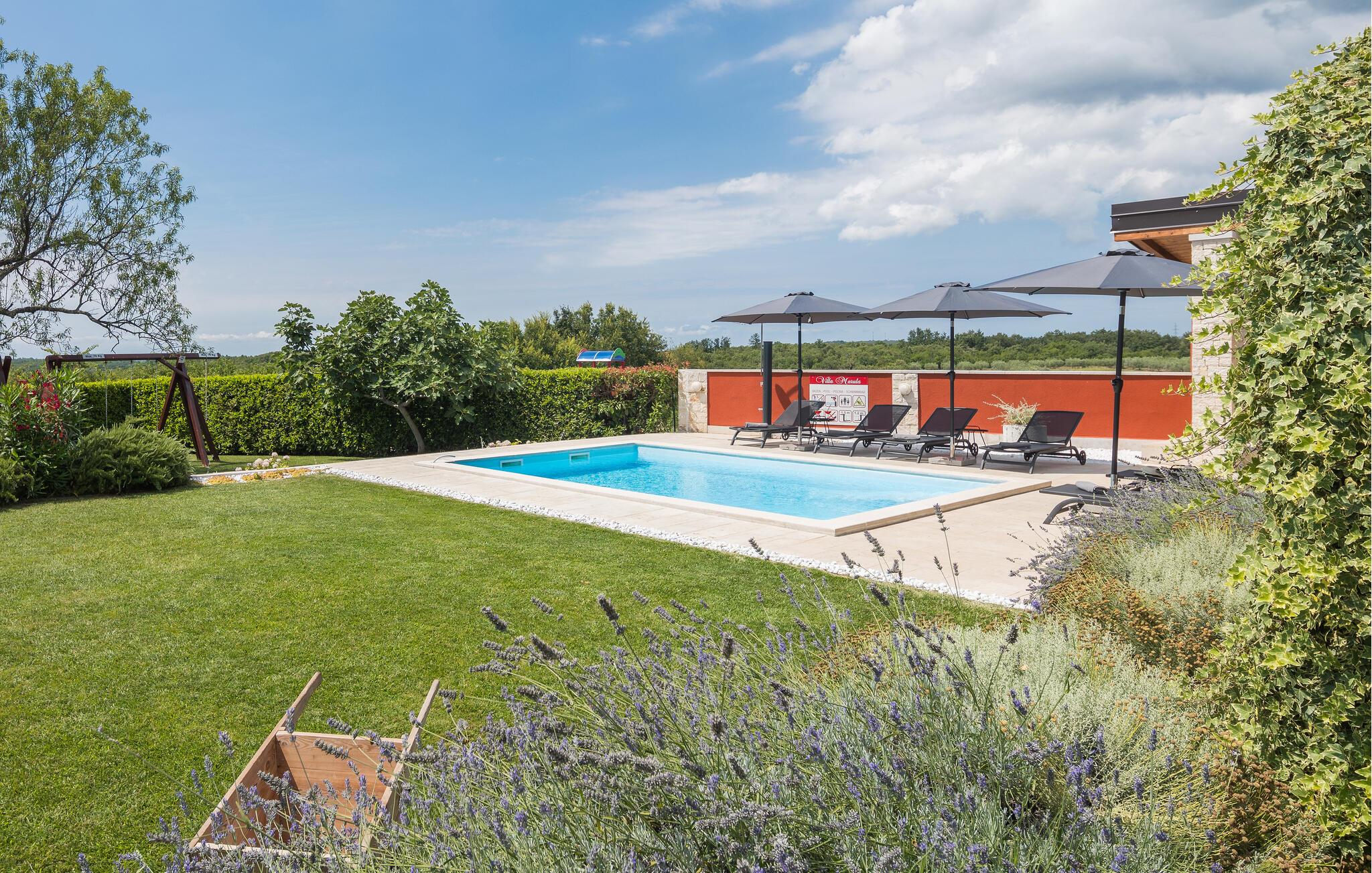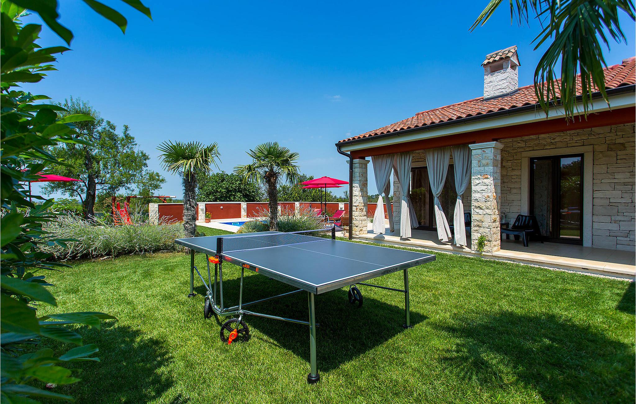 Verbringen Sie Ihren Urlaub in der Villa Marula, die viel Spaß für jede Generation garantiert. Während die Kinder auf dem Spielplatz Spaß haben, können Sie zwischen Tischtennis und Tischfußball wählen. Selbstverständlich steht Ihnen auch der private Pool zur Verfügung, in dem Sie entspannen können. Die Villa ist eine charmantes Landhaus mit offenem Grundriss, dank dessen sie noch gemütlicher und komfortabler wirkt. In der Villa findet man 4 Schlafzimmer und 3 Badezimmer. Da Villa Marula für Familien vorgesehen ist, können in der Villa bis zu 8 Personen beherbergt werden. Direkt aus dem Wohnzimmer hat man Zugang zu zwei Terrassen, die überdacht und ideal zum Entspannen im Schatten sind. Eine der Terrassen ist auch mit einem Steingrill und Gartenmöbeln aus massiven Holz ausgestattet. Besuchen Sie Istrien, die zu einer der schönsten Regionen Kroatiens zählt, und genießen Sie das sonnige Wetter, während die Luft nach Lavendel riecht und man hört nichts außer dem Vogelgesang.