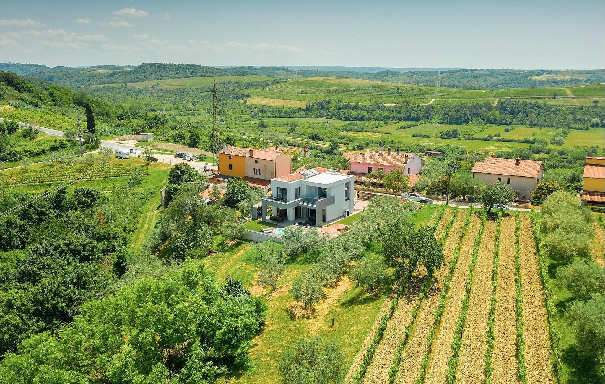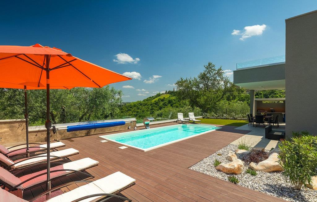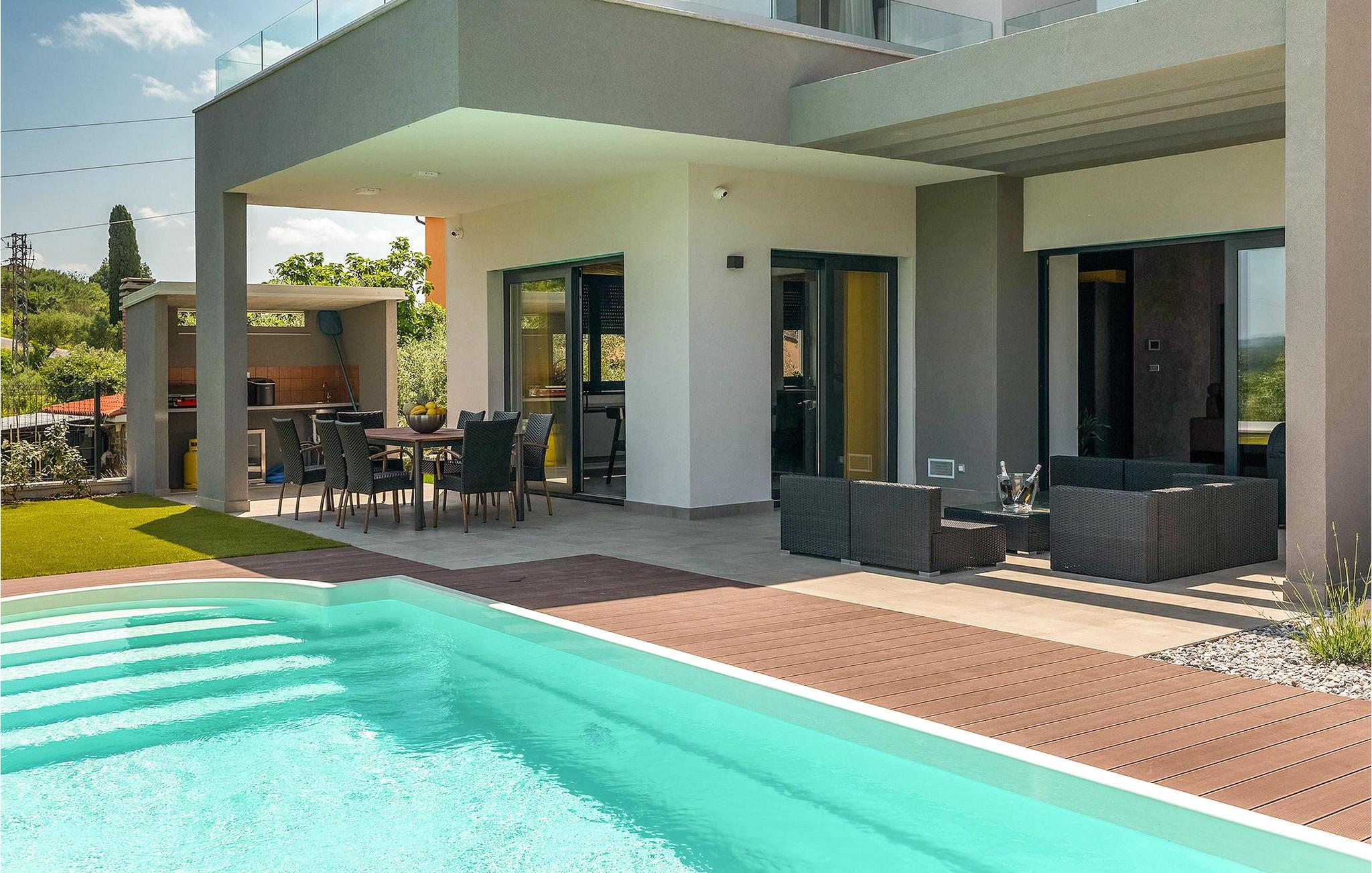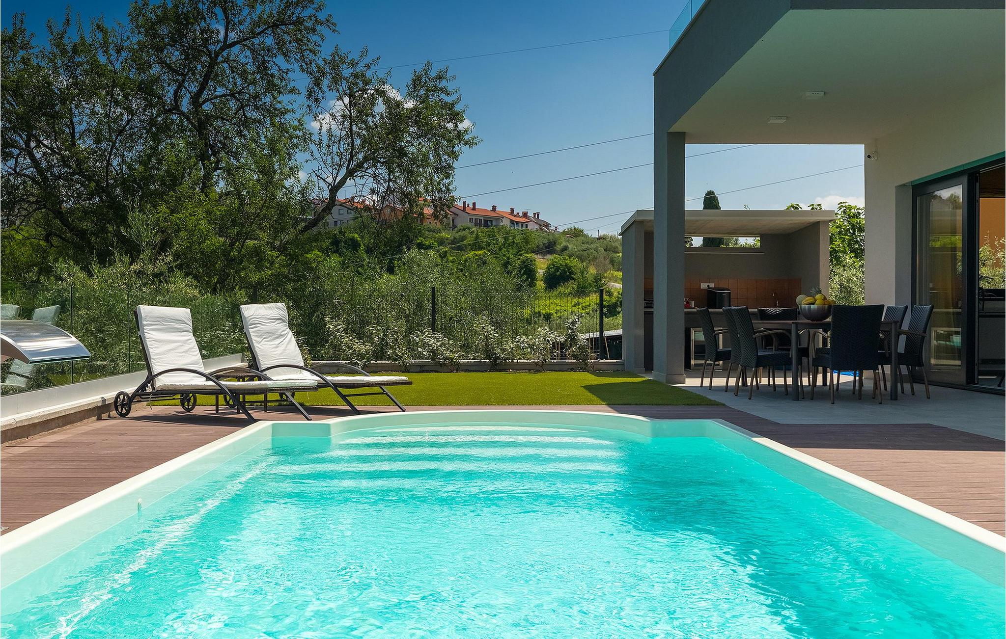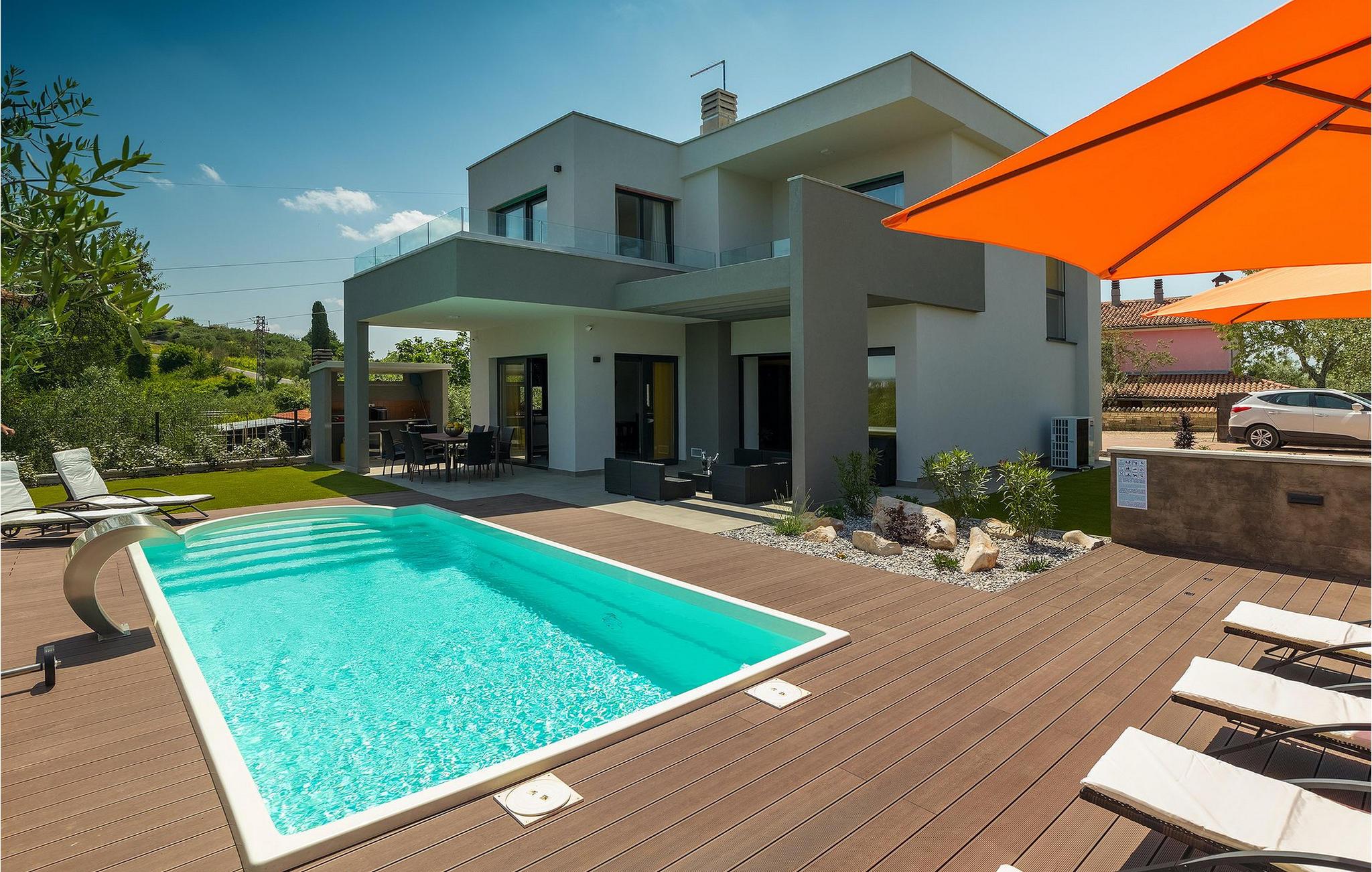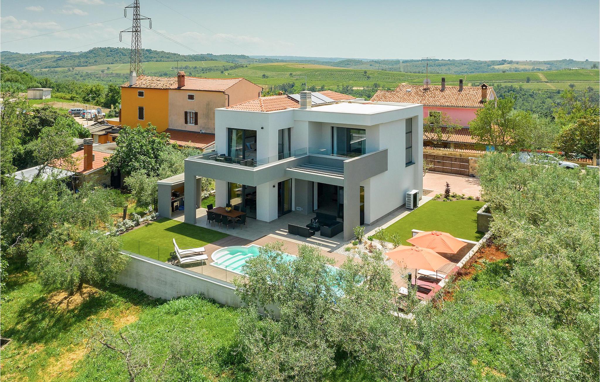 Dieses wunderschöne Anwesen befindet sich am Rande des schönen Buje in Istrien und ist eine moderne Villa mit 4 Schlafzimmern, die perfekt für 8 Personen geeignet ist. Sie befindet sich auf einem 615 m2 großen Grundstück und bietet einen privaten Parkplatz für 3 Autos und einen komplett umzäunten Garten. Im hinteren Teil des Gartens befindet sich der einladende private Pool, in dem Sie sich entspannen und den Blick auf die Altstadt von Buje und die Ruhe der umliegenden Natur genießen können. Im Poolbereich stehen Ihnen Liegestühle, eine Lounge zum Sitzen und Sonnenschirme zur Verfügung. Es gibt auch einen überdachten Teil auf der Terrasse mit einem Esstisch, an dem sich die ganze Gruppe versammeln und die Mahlzeiten auf dem Gasgrill im Freien genießen kann. Von dort haben Sie direkten Zugang zum Inneren der Villa. Hier befindet sich die völlig ausgestattete Küche mit Essbereich und das Wohnzimmer mit einem großen Sofa und Kamin. Ein Schlafzimmer und ein Badezimmer mit Dusche befinden sich im Erdgeschoss. Die restlichen 3 Schlafzimmer und 2 Badezimmer befinden sich in der oberen Etage und haben jeweils Zugang zur Terrasse - der perfekte Ort, um Ihren Tag mit Blick auf die grüne Umgebung zu beginnen! Alle Schlafzimmer sind klimatisiert und verfügen über ein Doppelbett. Die Villa ist in einem interessanten Stil mit viel Liebe zum Detail und einigen künstlerischen Gemälden an den Wänden eingerichtet. Dank der Lage der Villa, kann man Zentralistrien und die Küste Istriens leicht erreichen und erkunden. Kurz beschrieben, eine fablhafte Ferienvilla!Inmitten der bildschönen istrischen Landschaft, umgeben von zauberhafter Natur, befindet sich das historische Städtchen Buje, das schon in der Bronzezeit besiedelt wurde. Bereits vor ewigen Zeiten wurde dieses hügelige Gebiet mit Olivenfeldern bepflanzt, was bis heute unverändert geblieben ist. Die Lage, in der sich die Stadt befindet, garantiert eine ruhige und entspannende Atmosphäre, aber für diejenigen, die Lust haben, die Attraktionen nordwestlichen Istriens zu besichtigen, liegt Umag nur eine kurze Fahrt von Buje entfernt. Zahlreiche historische Sehenswürdigkeiten, 45km lange Küste, venezianische Häuser und barocke Kirchen sind nur ein Beispiel davon, was Umag seinen Besuchern bietet. In der Nähe von Novigrad und nur fünf Kilometer von der Küste entfernt, befindet sich der neueröffnete Aquapark Istralandia, der sowohl für Erwachsene als auch für Kinder geeignet ist. Zu den Highlights des Aquaparks zählen unterschiedliche Wasserrutschen, unter anderem die Free Fall Rutsche und die Familien Rafting Rutsche. Es ist unmöglich, in Istralandia nicht Spaß zu haben, da der Aquapark neben den Wasserrutschen auch Pools, Restaurants und verschiedene Animationsprogramme bietet.