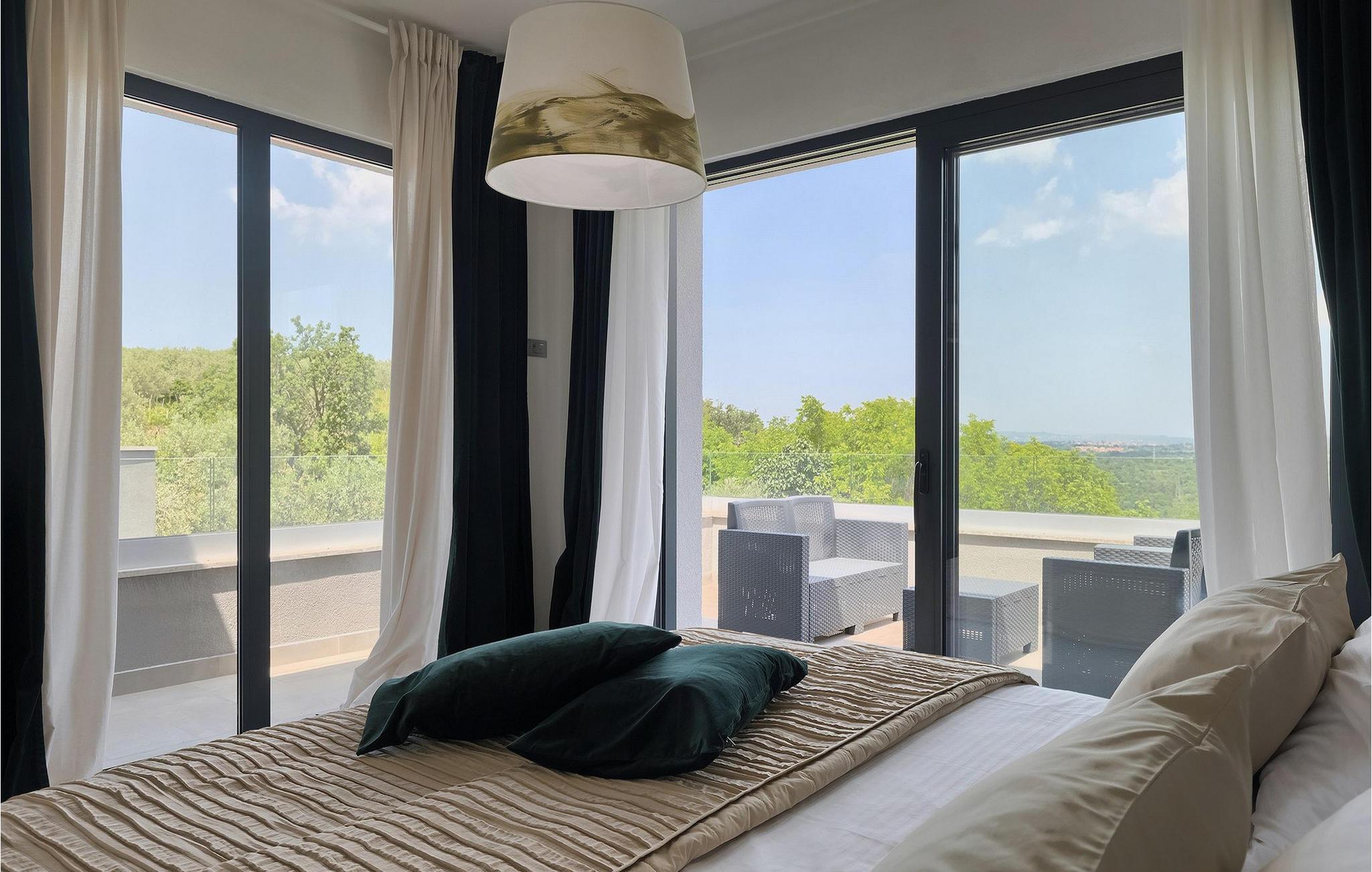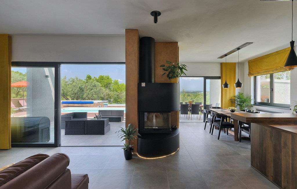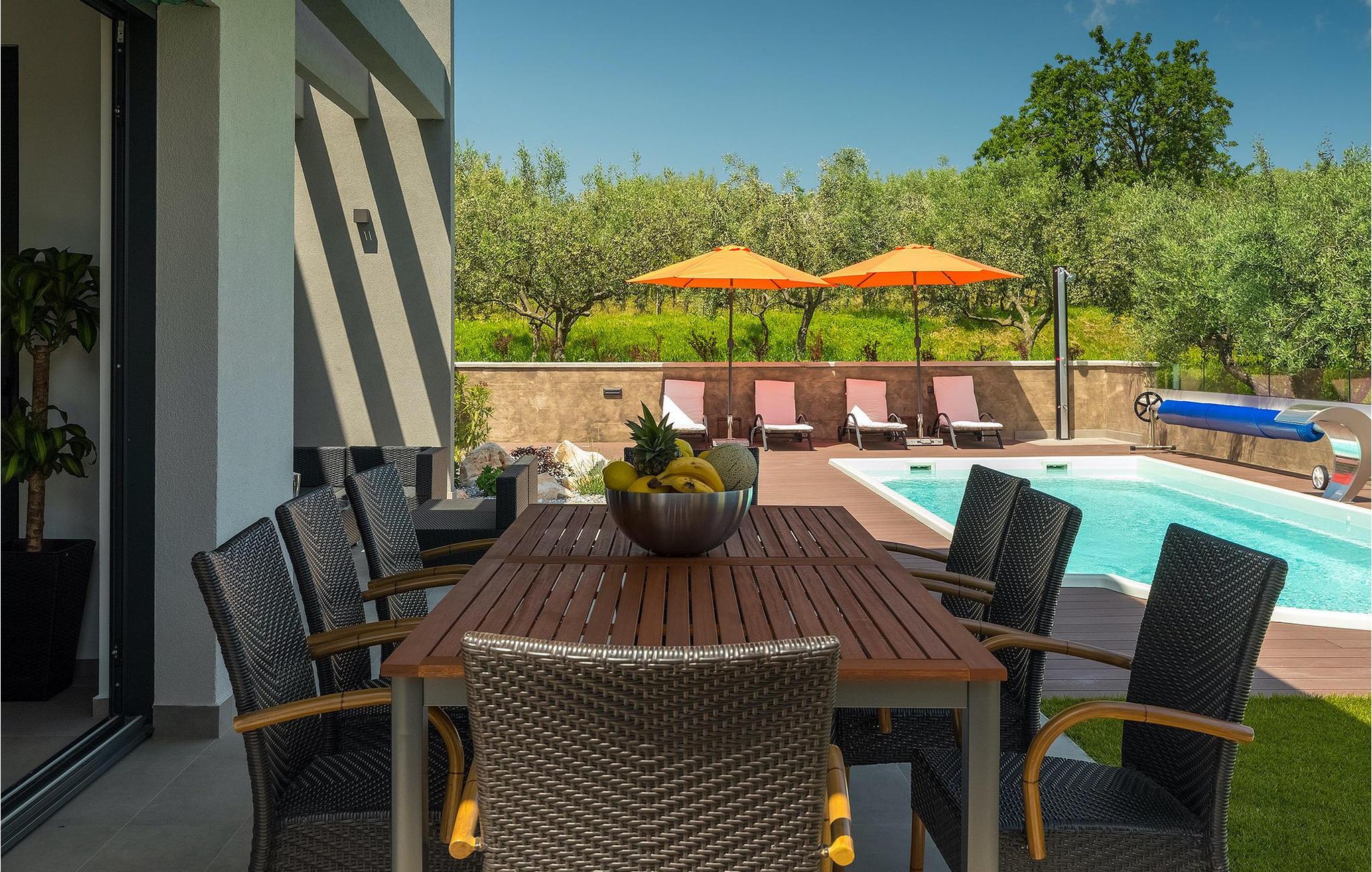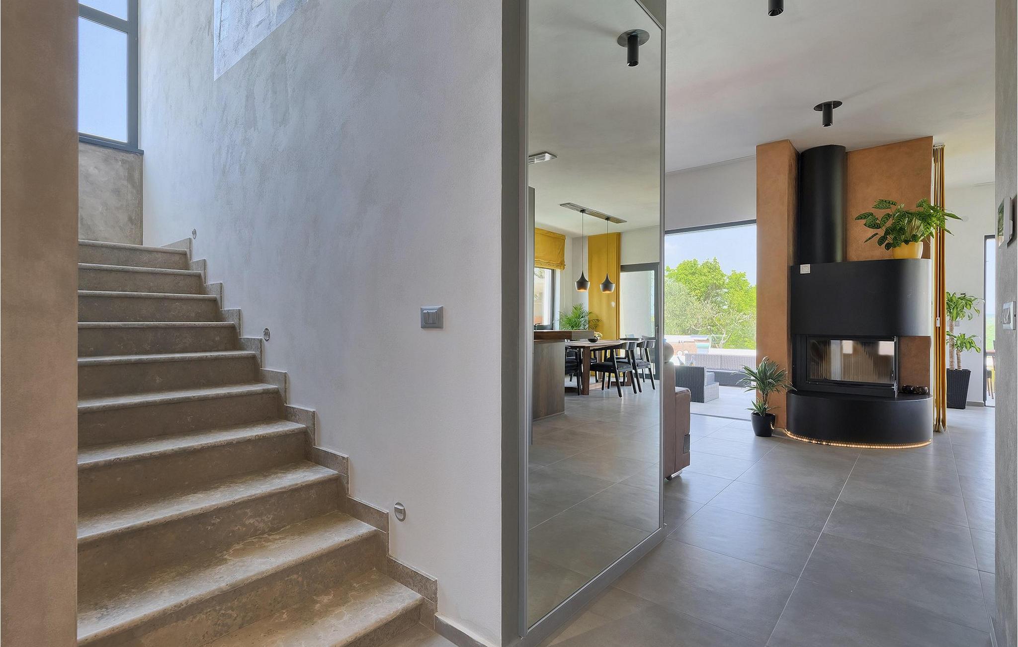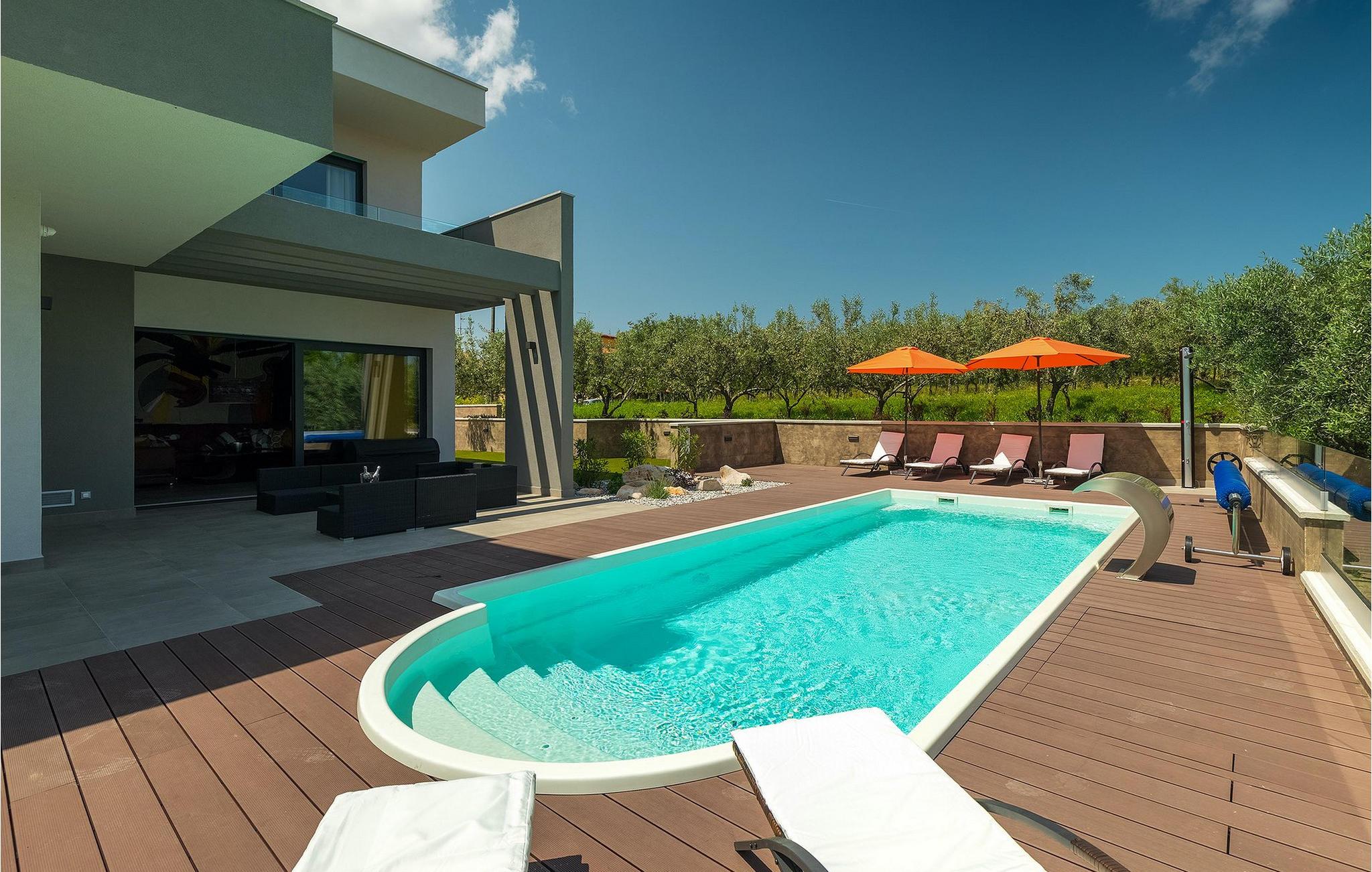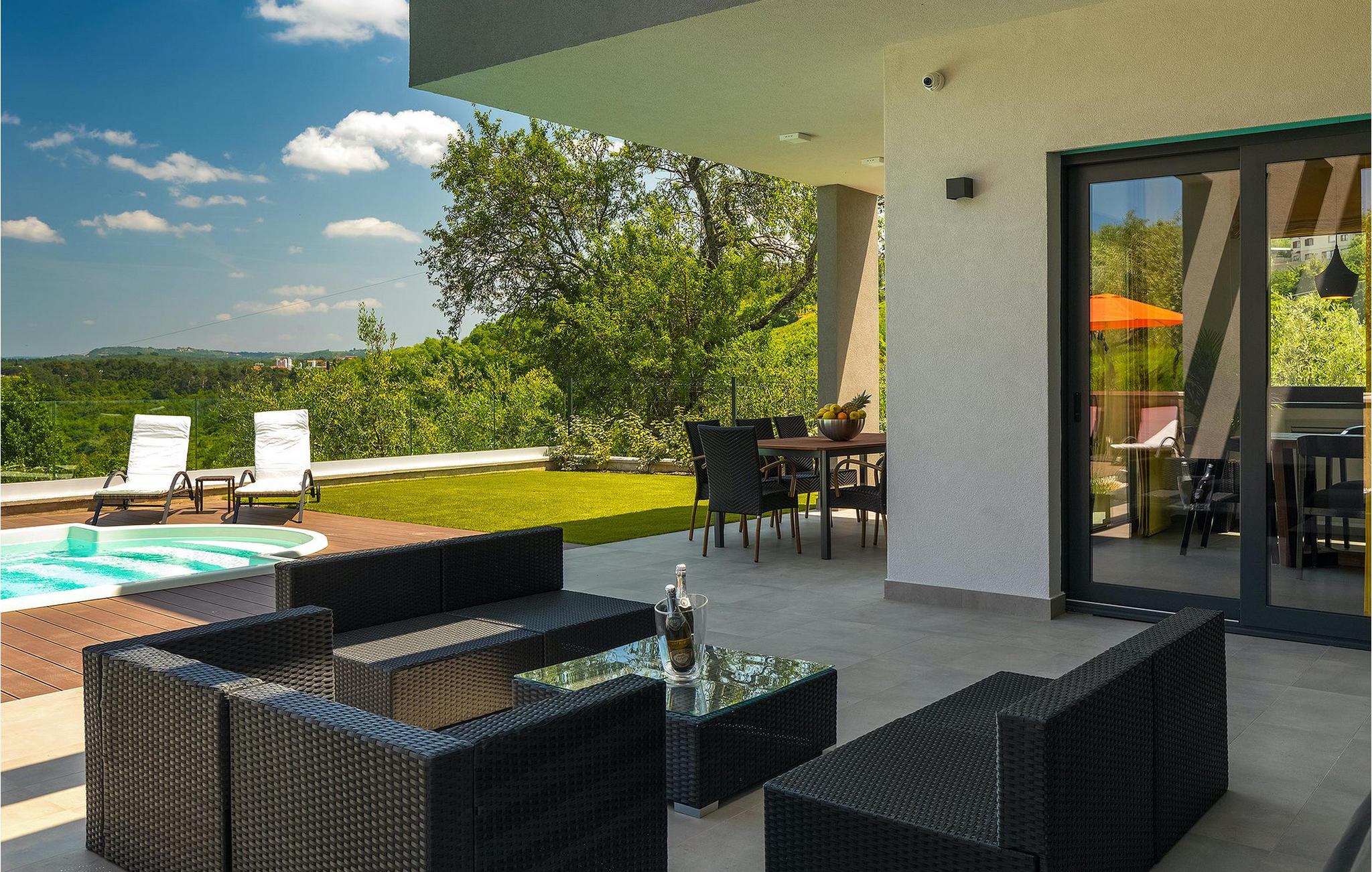 Dieses wunderschöne Anwesen befindet sich am Rande des schönen Buje in Istrien und ist eine moderne Villa mit 4 Schlafzimmern, die perfekt für 8 Personen geeignet ist. Sie befindet sich auf einem 615 m2 großen Grundstück und bietet einen privaten Parkplatz für 3 Autos und einen komplett umzäunten Garten. Im hinteren Teil des Gartens befindet sich der einladende private Pool, in dem Sie sich entspannen und den Blick auf die Altstadt von Buje und die Ruhe der umliegenden Natur genießen können. Im Poolbereich stehen Ihnen Liegestühle, eine Lounge zum Sitzen und Sonnenschirme zur Verfügung. Es gibt auch einen überdachten Teil auf der Terrasse mit einem Esstisch, an dem sich die ganze Gruppe versammeln und die Mahlzeiten auf dem Gasgrill im Freien genießen kann. Von dort haben Sie direkten Zugang zum Inneren der Villa. Hier befindet sich die völlig ausgestattete Küche mit Essbereich und das Wohnzimmer mit einem großen Sofa und Kamin. Ein Schlafzimmer und ein Badezimmer mit Dusche befinden sich im Erdgeschoss. Die restlichen 3 Schlafzimmer und 2 Badezimmer befinden sich in der oberen Etage und haben jeweils Zugang zur Terrasse - der perfekte Ort, um Ihren Tag mit Blick auf die grüne Umgebung zu beginnen! Alle Schlafzimmer sind klimatisiert und verfügen über ein Doppelbett. Die Villa ist in einem interessanten Stil mit viel Liebe zum Detail und einigen künstlerischen Gemälden an den Wänden eingerichtet. Dank der Lage der Villa, kann man Zentralistrien und die Küste Istriens leicht erreichen und erkunden. Kurz beschrieben, eine fablhafte Ferienvilla!Inmitten der bildschönen istrischen Landschaft, umgeben von zauberhafter Natur, befindet sich das historische Städtchen Buje, das schon in der Bronzezeit besiedelt wurde. Bereits vor ewigen Zeiten wurde dieses hügelige Gebiet mit Olivenfeldern bepflanzt, was bis heute unverändert geblieben ist. Die Lage, in der sich die Stadt befindet, garantiert eine ruhige und entspannende Atmosphäre, aber für diejenigen, die Lust haben, die Attraktionen nordwestlichen Istriens zu besichtigen, liegt Umag nur eine kurze Fahrt von Buje entfernt. Zahlreiche historische Sehenswürdigkeiten, 45km lange Küste, venezianische Häuser und barocke Kirchen sind nur ein Beispiel davon, was Umag seinen Besuchern bietet. In der Nähe von Novigrad und nur fünf Kilometer von der Küste entfernt, befindet sich der neueröffnete Aquapark Istralandia, der sowohl für Erwachsene als auch für Kinder geeignet ist. Zu den Highlights des Aquaparks zählen unterschiedliche Wasserrutschen, unter anderem die Free Fall Rutsche und die Familien Rafting Rutsche. Es ist unmöglich, in Istralandia nicht Spaß zu haben, da der Aquapark neben den Wasserrutschen auch Pools, Restaurants und verschiedene Animationsprogramme bietet.