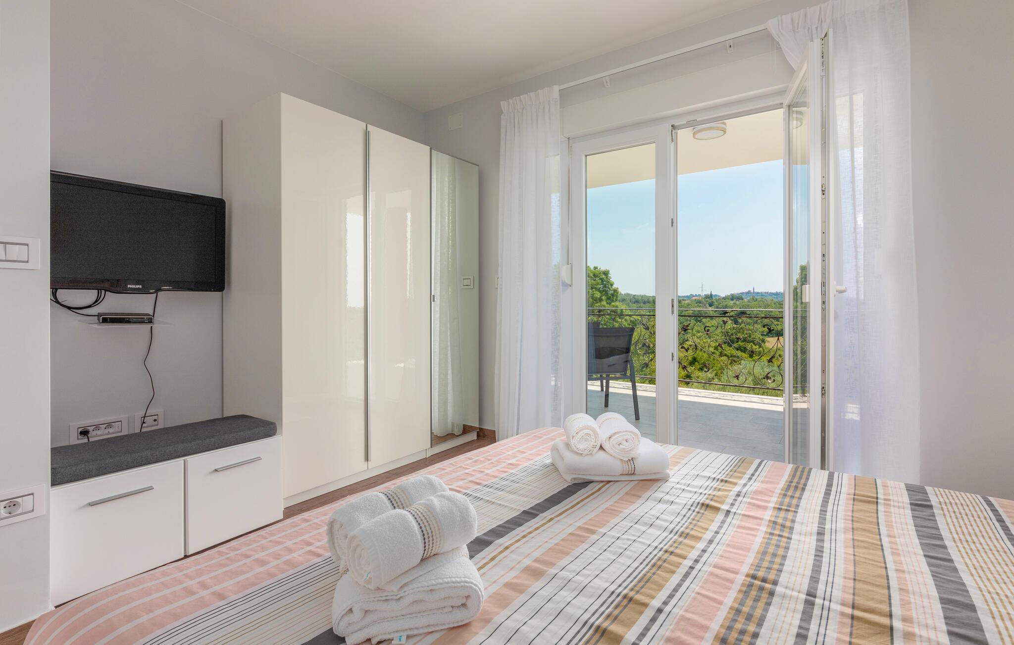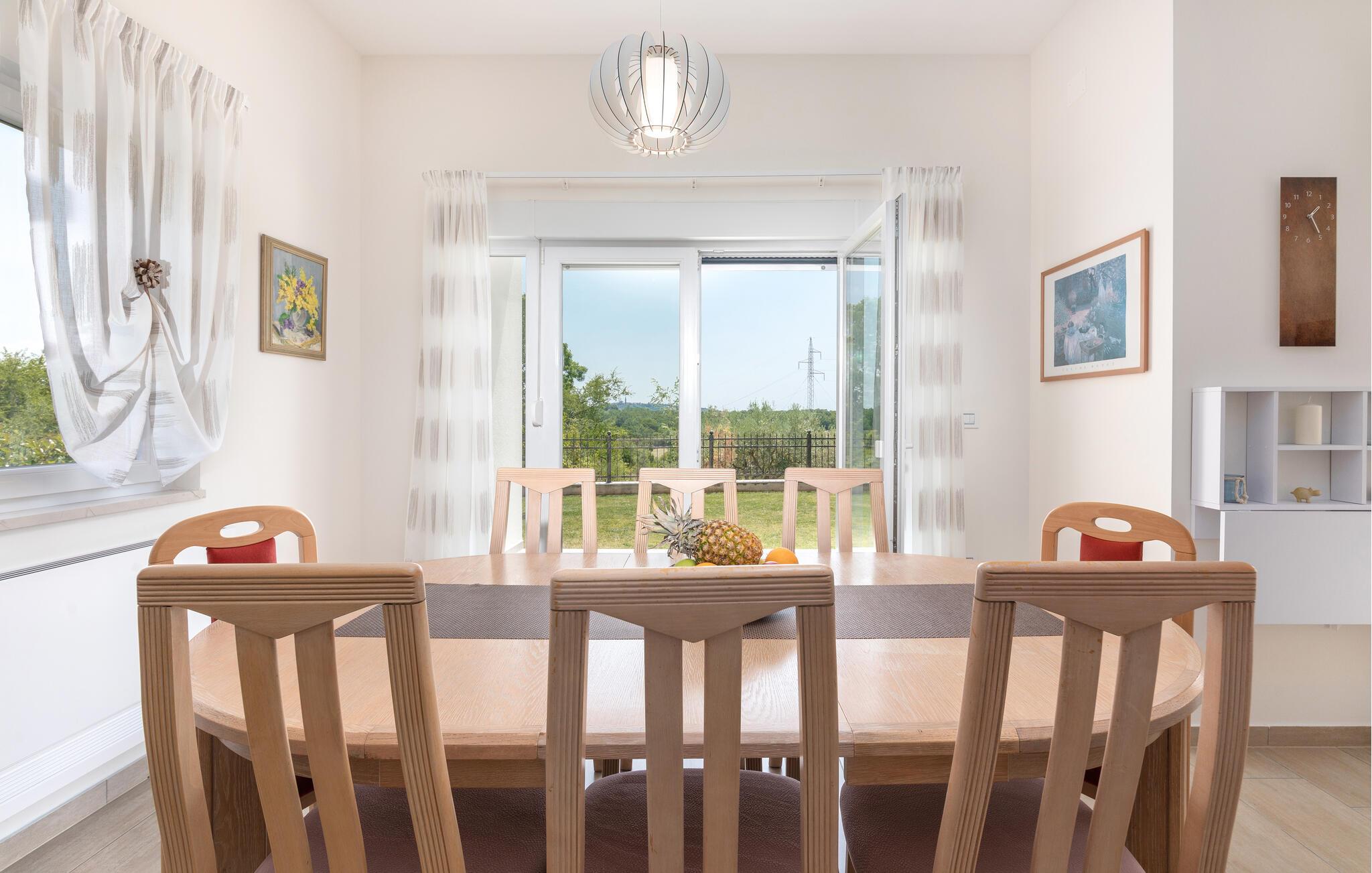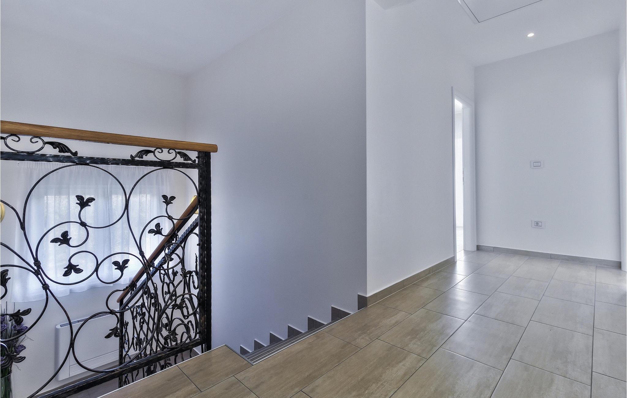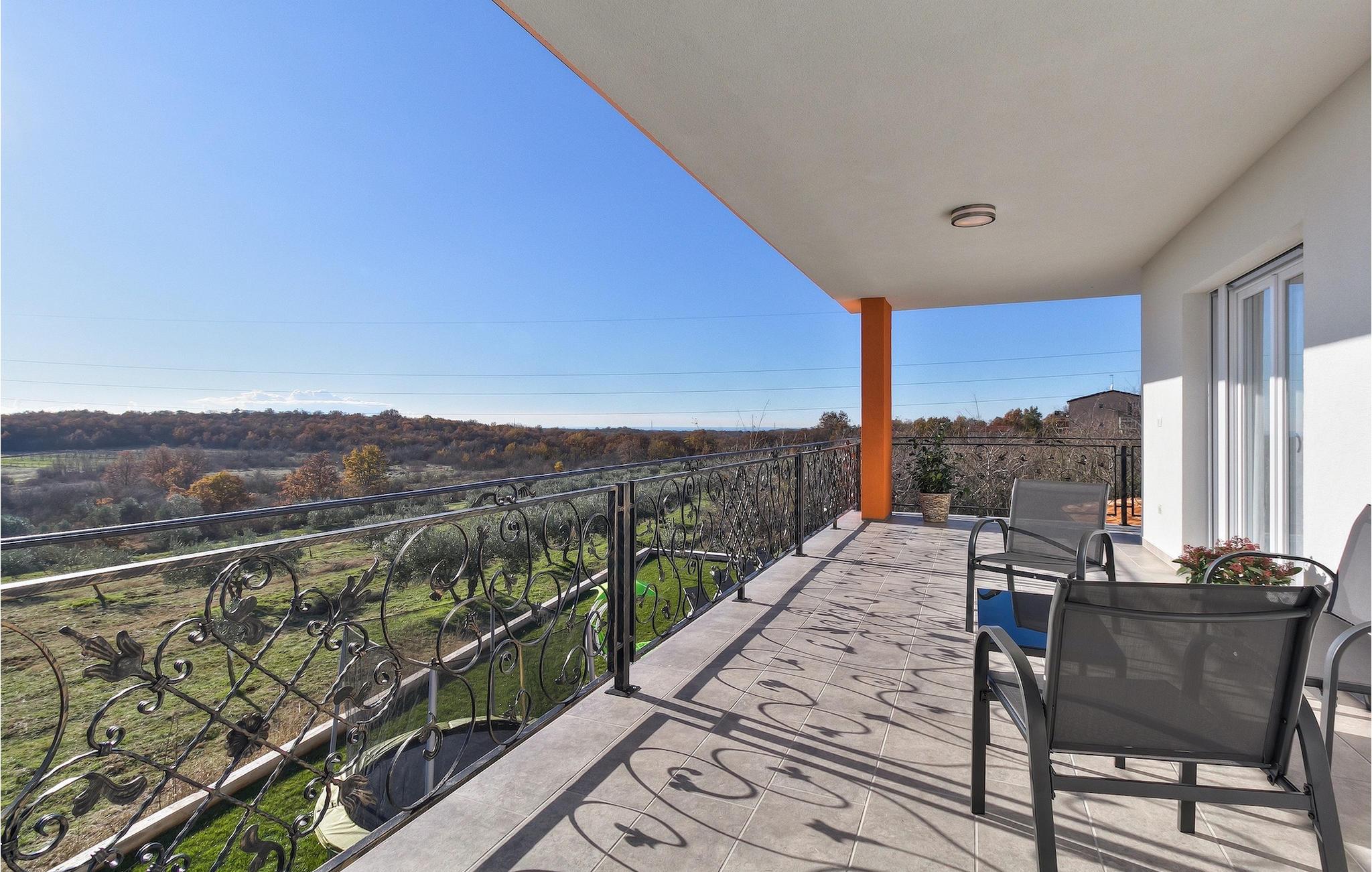 Das Interieur der Villa ist modern eingerichtet und bietet einen erholsamen, ruhigen Urlaub. Im ersten Stock befinden sich 3 gemütliche Schlafzimmer mit privaten Badezimmern. 2 Schlafzimmer verfügen über Doppelbetten und das dritte Schlafzimmer hat 2 Einzelbetten. Alle Räume werden mit der Klimaanlage geheizt und gekühlt. Aus den Zimmern auf der Etage kommt man zum großen gemeinsamen Balkon mit hervorragenden Blick auf die grüne istrische Landschaft. Genießen Sie Ihre Abende hier mit einem Glas lokalen istrischen Wein aus dieser Region, bekannt für Weinstraßen.Villa Eva befindet sich im kleinen Dorf Kaštel auf einem Hügel über dem Fluss Dragonja, der einen magischen Blick auf die Istrische Landschaft bietet. Kaštel liegt im nordwestlichen Teil der Halbinsel Istrien in der Nähe der schönen, kleinen Stadt Buje, die Sie unbedingt besuchen müssen. Nur 2 km von der Villa entfernt befindet sich die Stadt des Weins und Olivenöls, Buje. Hier können Sie viele gut erhaltene Kirchen bewundern, ein ethnographisches Museum besuchen oder sich nur entspannen und entlang der zahlreichen Weinstraßen spazieren und lokalen Wein oder Olivenöl kosten. Für die Liebhaber des aktiven Urlaubs gibt es in dieser Region auch viele Radwege. Erholen Sie sich in der wunderschönen Natur im Schatten der Kiefer neben den kristallklarem Meer am Strand Kanegra, nur 8,5 km entfernt von der Villa. Etwa 15 Autominuten entfernt befindet sich das Touristische Zentrum Umag. Umag bietet viele Sehenswürdigkeiten, Restaurants, Geschäfte, Café, Bars und Veranstaltungen. Eine von diesen ist der weltbekannte Tennis Cup ATP Croatia Open, der im Juli stattfindet.
