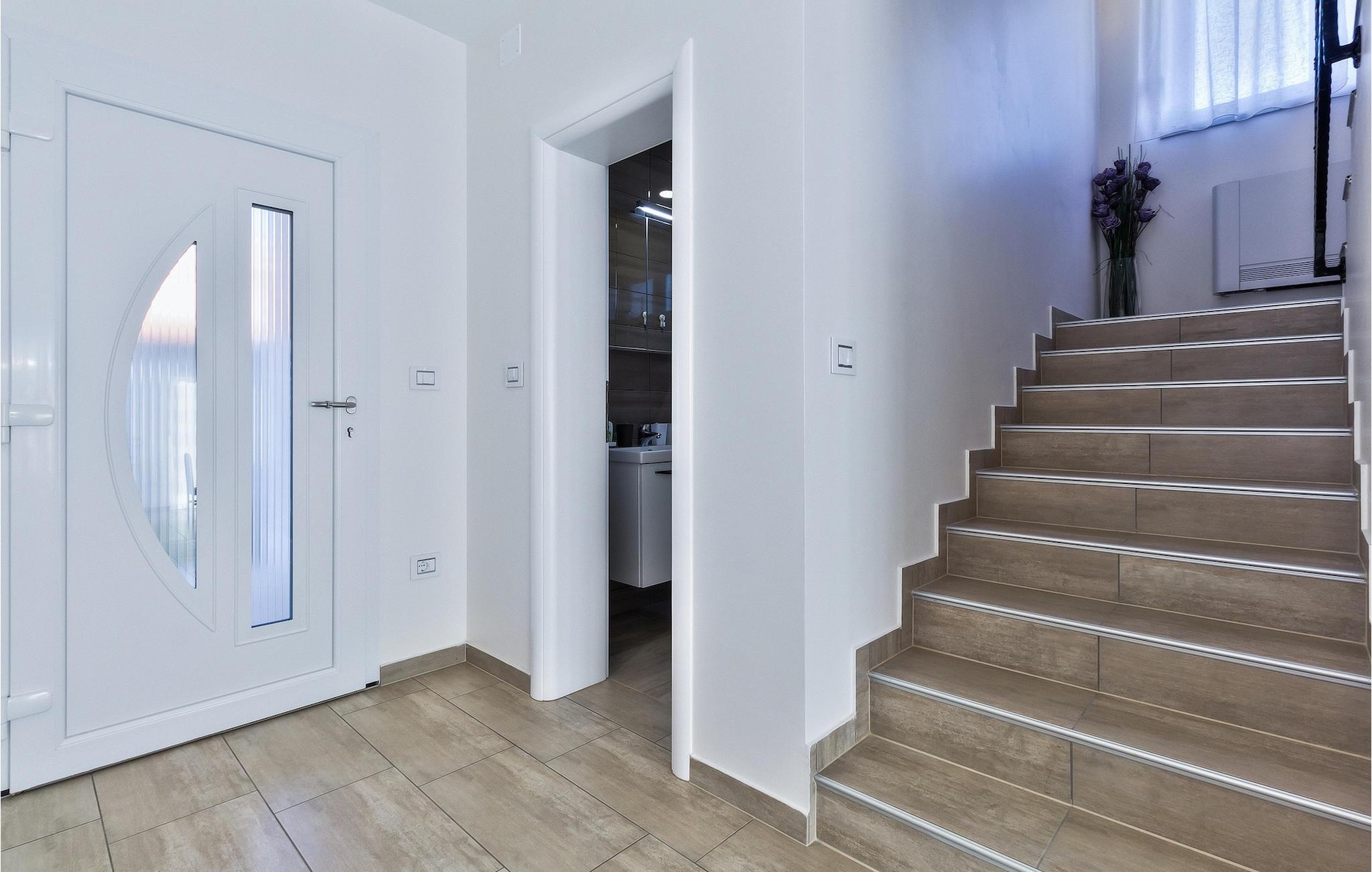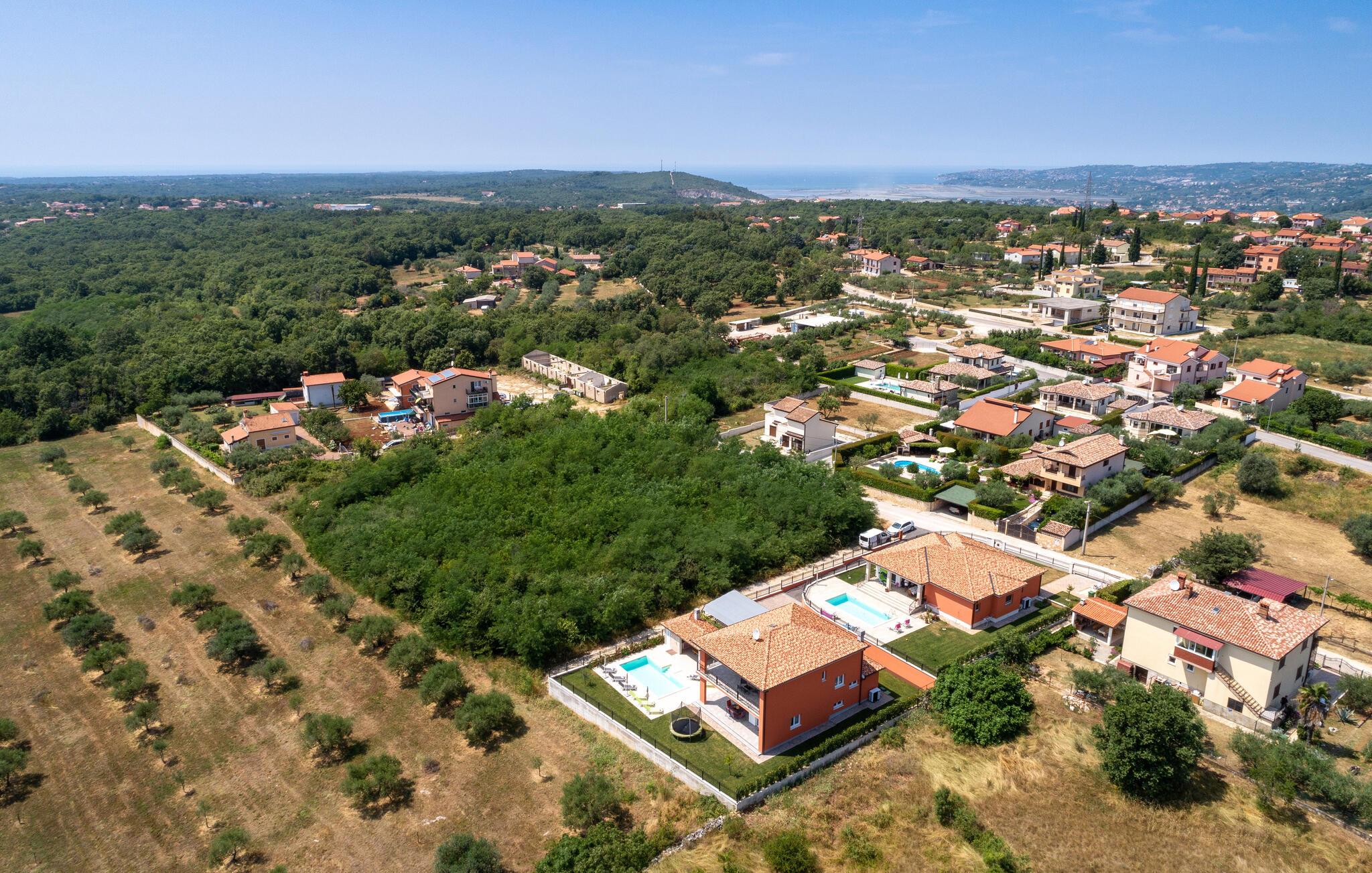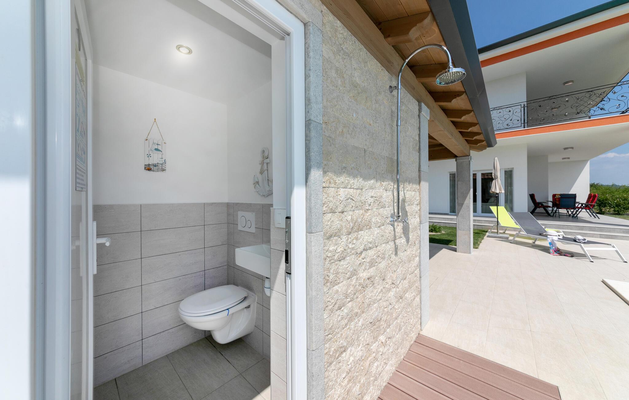 Das Interieur der Villa ist modern eingerichtet und bietet einen erholsamen, ruhigen Urlaub. Im ersten Stock befinden sich 3 gemütliche Schlafzimmer mit privaten Badezimmern. 2 Schlafzimmer verfügen über Doppelbetten und das dritte Schlafzimmer hat 2 Einzelbetten. Alle Räume werden mit der Klimaanlage geheizt und gekühlt. Aus den Zimmern auf der Etage kommt man zum großen gemeinsamen Balkon mit hervorragenden Blick auf die grüne istrische Landschaft. Genießen Sie Ihre Abende hier mit einem Glas lokalen istrischen Wein aus dieser Region, bekannt für Weinstraßen.Villa Eva befindet sich im kleinen Dorf Kaštel auf einem Hügel über dem Fluss Dragonja, der einen magischen Blick auf die Istrische Landschaft bietet. Kaštel liegt im nordwestlichen Teil der Halbinsel Istrien in der Nähe der schönen, kleinen Stadt Buje, die Sie unbedingt besuchen müssen. Nur 2 km von der Villa entfernt befindet sich die Stadt des Weins und Olivenöls, Buje. Hier können Sie viele gut erhaltene Kirchen bewundern, ein ethnographisches Museum besuchen oder sich nur entspannen und entlang der zahlreichen Weinstraßen spazieren und lokalen Wein oder Olivenöl kosten. Für die Liebhaber des aktiven Urlaubs gibt es in dieser Region auch viele Radwege. Erholen Sie sich in der wunderschönen Natur im Schatten der Kiefer neben den kristallklarem Meer am Strand Kanegra, nur 8,5 km entfernt von der Villa. Etwa 15 Autominuten entfernt befindet sich das Touristische Zentrum Umag. Umag bietet viele Sehenswürdigkeiten, Restaurants, Geschäfte, Café, Bars und Veranstaltungen. Eine von diesen ist der weltbekannte Tennis Cup ATP Croatia Open, der im Juli stattfindet.