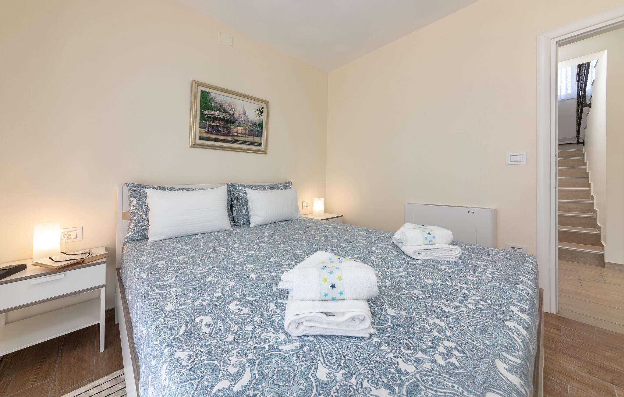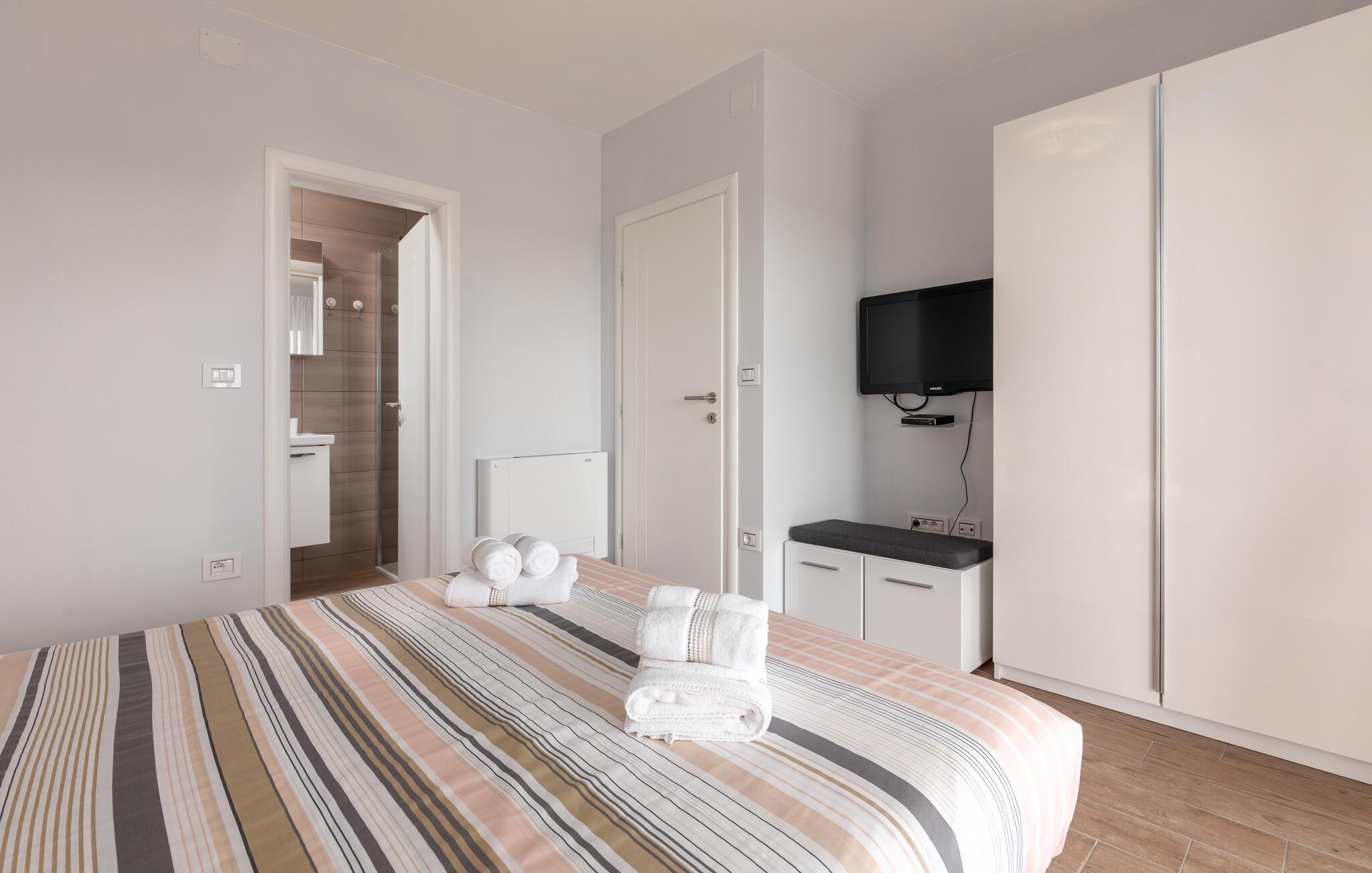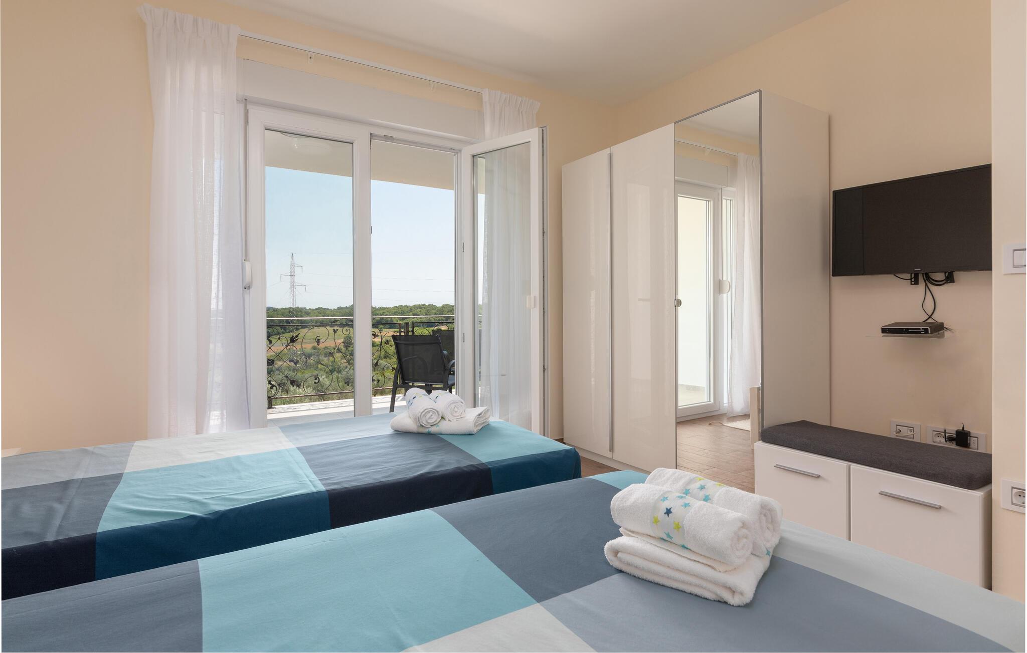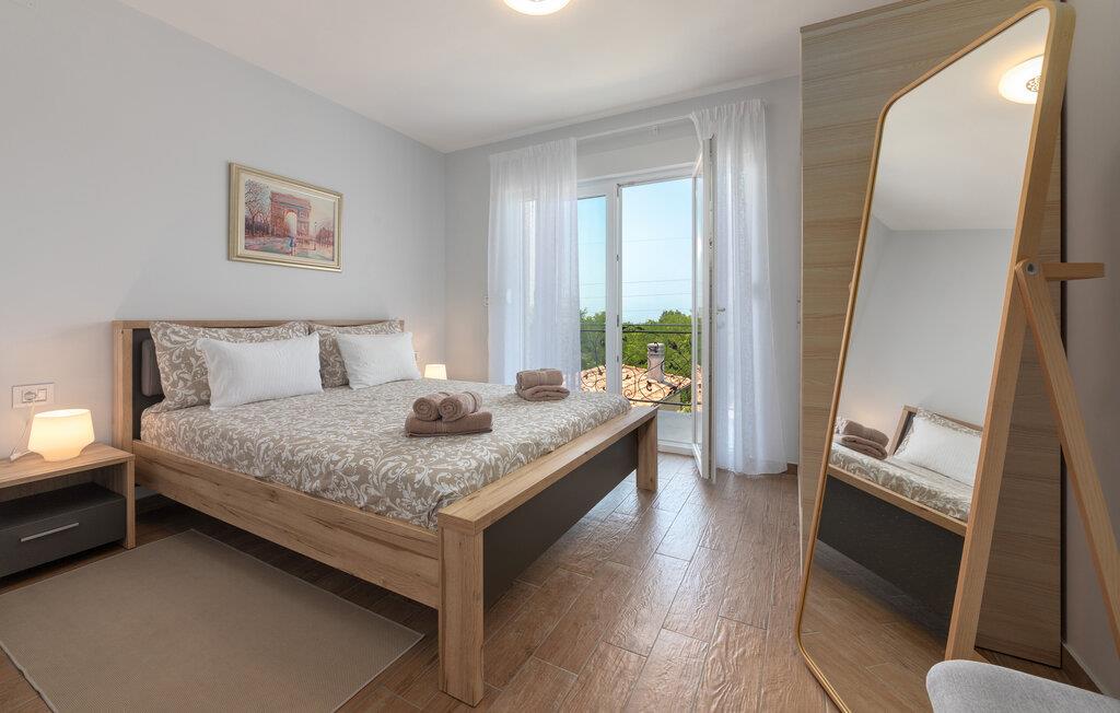 Das Interieur der Villa ist modern eingerichtet und bietet einen erholsamen, ruhigen Urlaub. Im ersten Stock befinden sich 3 gemütliche Schlafzimmer mit privaten Badezimmern. 2 Schlafzimmer verfügen über Doppelbetten und das dritte Schlafzimmer hat 2 Einzelbetten. Alle Räume werden mit der Klimaanlage geheizt und gekühlt. Aus den Zimmern auf der Etage kommt man zum großen gemeinsamen Balkon mit hervorragenden Blick auf die grüne istrische Landschaft. Genießen Sie Ihre Abende hier mit einem Glas lokalen istrischen Wein aus dieser Region, bekannt für Weinstraßen.Villa Eva befindet sich im kleinen Dorf Kaštel auf einem Hügel über dem Fluss Dragonja, der einen magischen Blick auf die Istrische Landschaft bietet. Kaštel liegt im nordwestlichen Teil der Halbinsel Istrien in der Nähe der schönen, kleinen Stadt Buje, die Sie unbedingt besuchen müssen. Nur 2 km von der Villa entfernt befindet sich die Stadt des Weins und Olivenöls, Buje. Hier können Sie viele gut erhaltene Kirchen bewundern, ein ethnographisches Museum besuchen oder sich nur entspannen und entlang der zahlreichen Weinstraßen spazieren und lokalen Wein oder Olivenöl kosten. Für die Liebhaber des aktiven Urlaubs gibt es in dieser Region auch viele Radwege. Erholen Sie sich in der wunderschönen Natur im Schatten der Kiefer neben den kristallklarem Meer am Strand Kanegra, nur 8,5 km entfernt von der Villa. Etwa 15 Autominuten entfernt befindet sich das Touristische Zentrum Umag. Umag bietet viele Sehenswürdigkeiten, Restaurants, Geschäfte, Café, Bars und Veranstaltungen. Eine von diesen ist der weltbekannte Tennis Cup ATP Croatia Open, der im Juli stattfindet.
