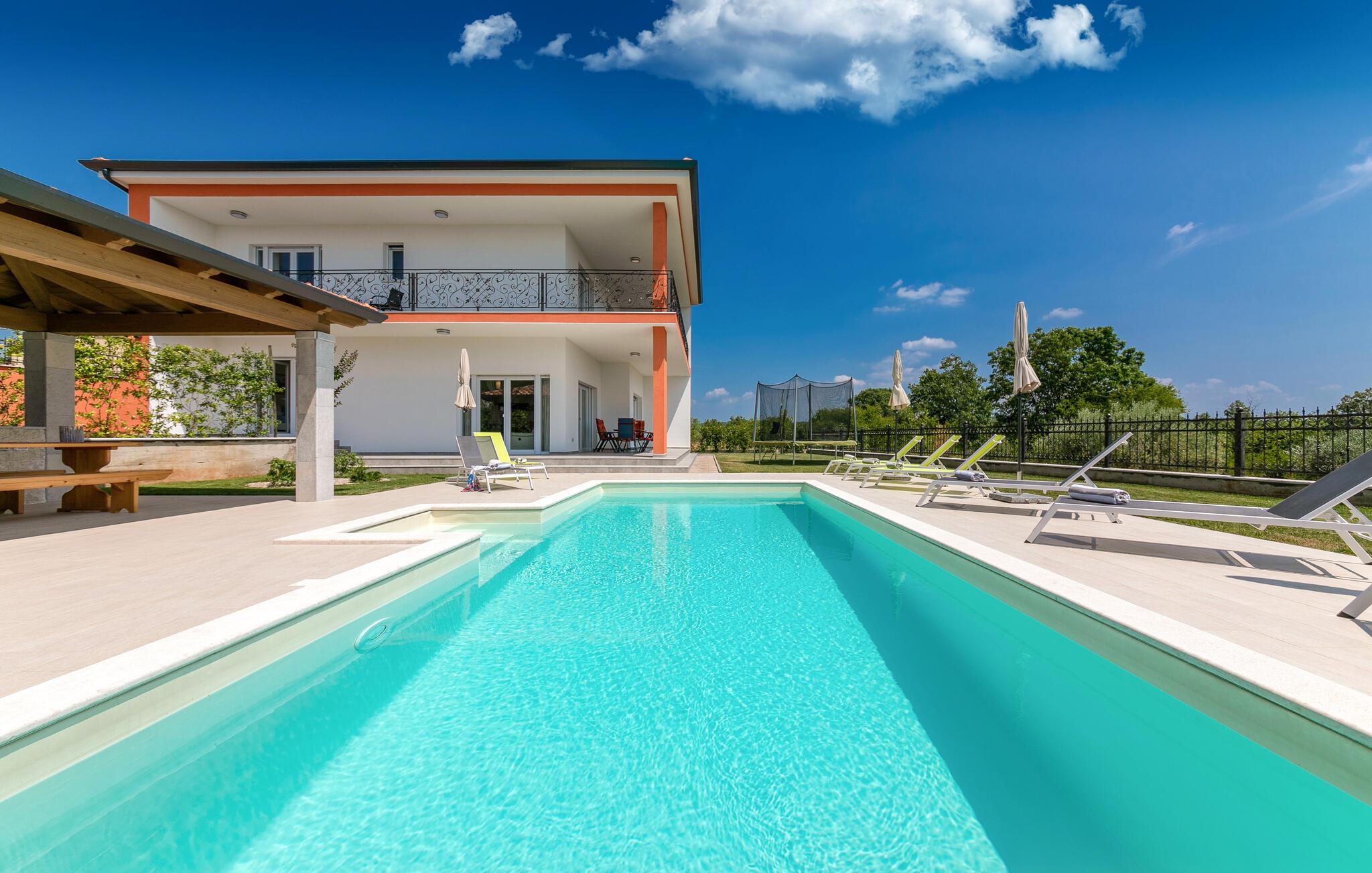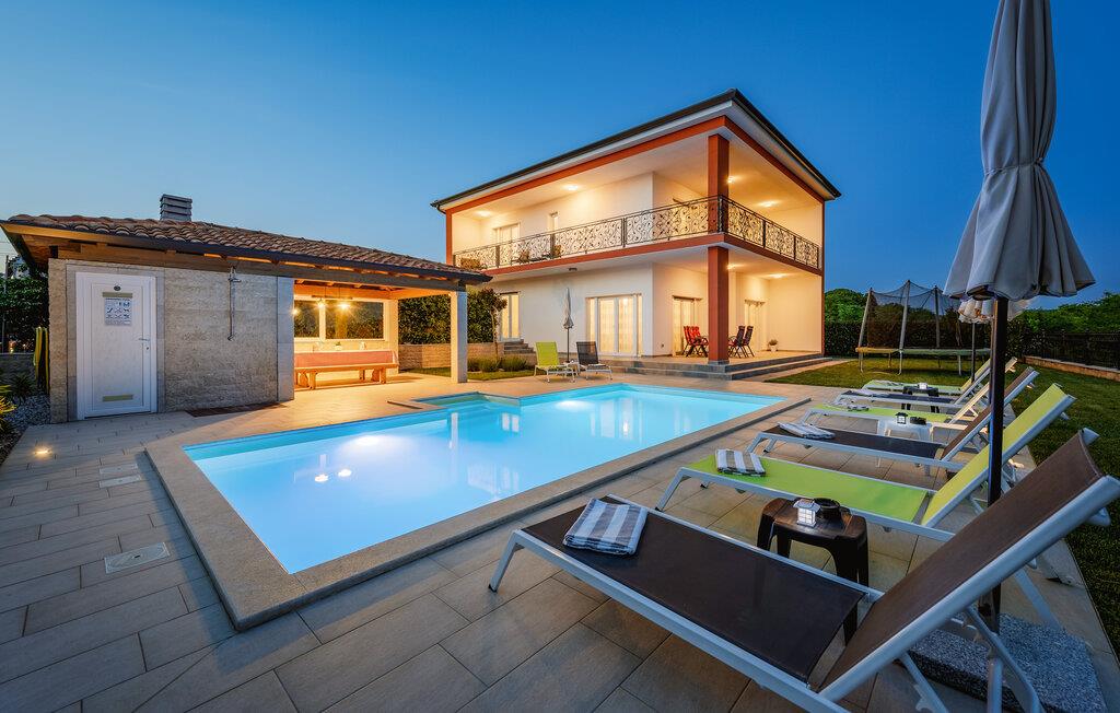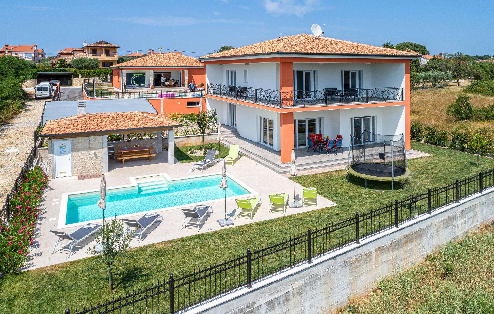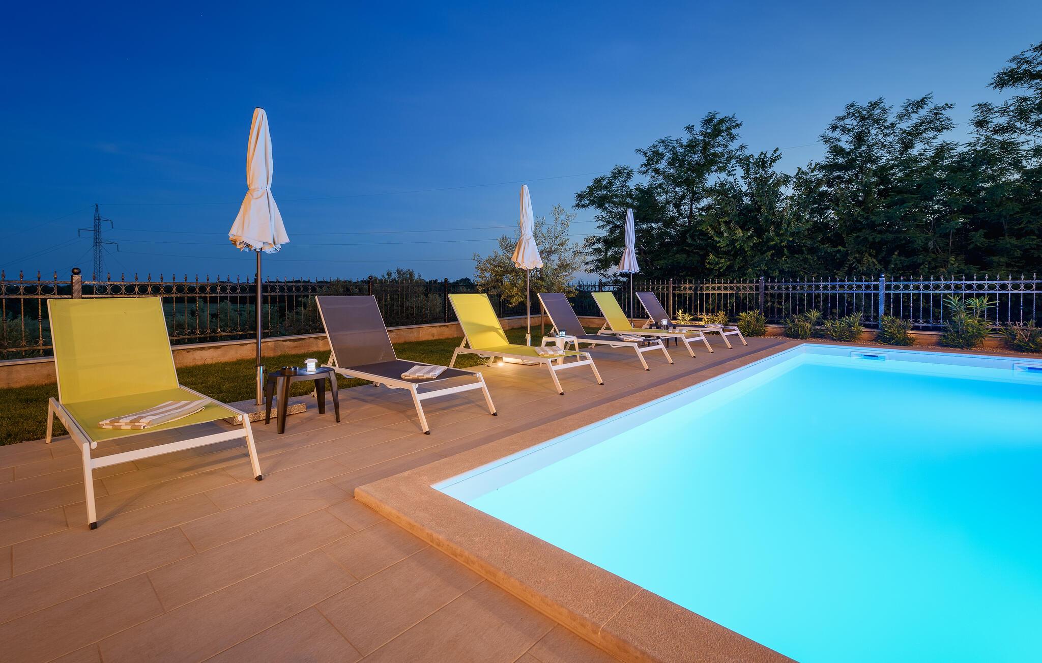 Auf 186 m2 bietet Villa Eva Platz für 8 Personen in insgesamt 4 Schlafzimmern. Eines der Schlafzimmer mit Doppelbett befindet sich am Treppengang neben dem kleinem Bad mit Dusche im Erdgeschoss, wo noch ein helles, modernes Wohnzimmer mit Essbereich und komplett ausgestatteter Küche im offenen Konzept auf Sie wartet. Aus diesen angenehmen Bereich, durchflutet mit natürlichen Licht durch die gläsernen französischen Türen, kommt man zum wunderschönen Pool und dem Essbereich im Offenen. Während die Kinder auf dem Trampolin toben, können Sie sich im Pool abkühlen, auf den Liegestühlen sonnen oder köstliche Gerichte vorbereiten und speisen am Kamin-Grill.