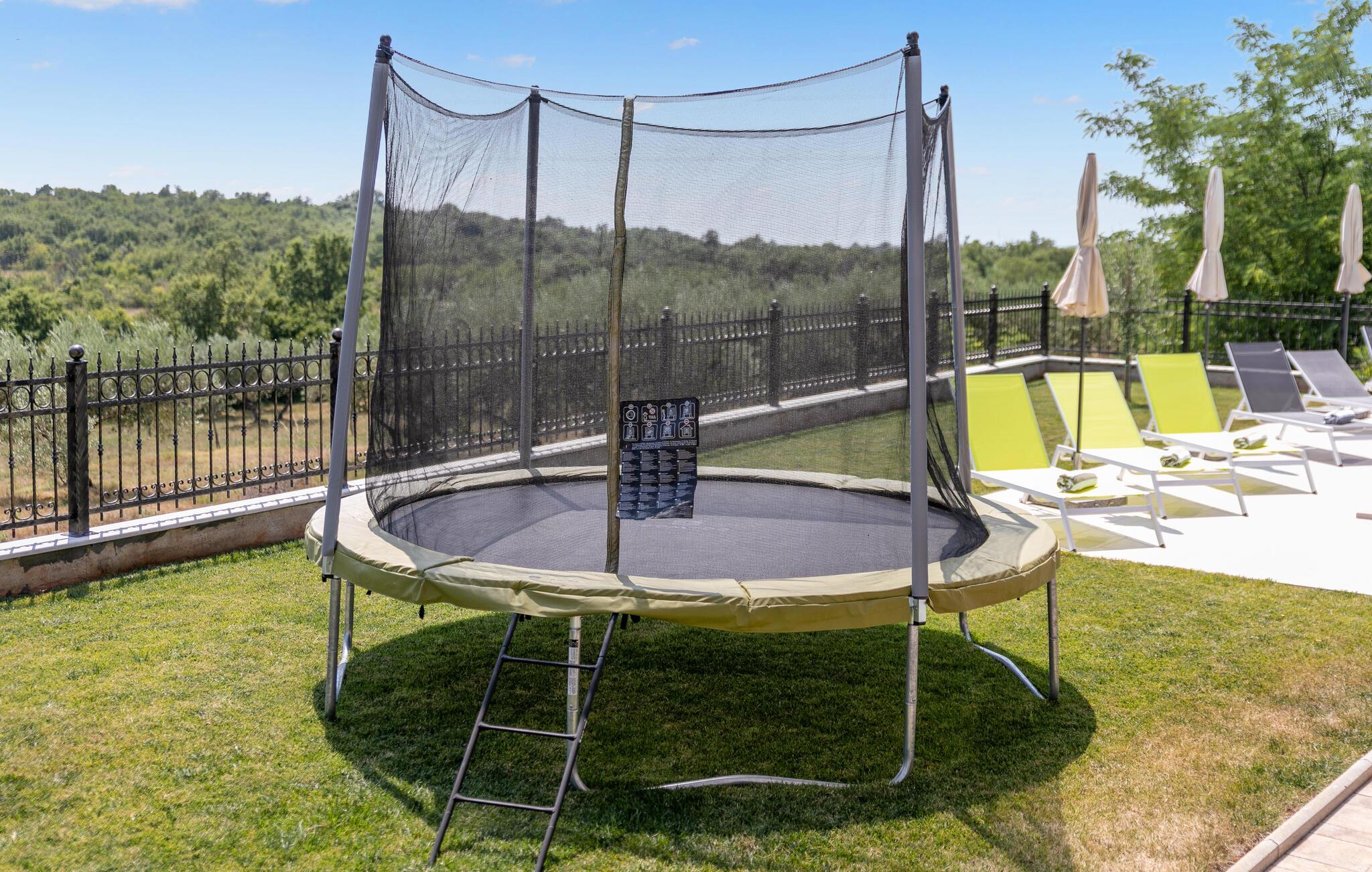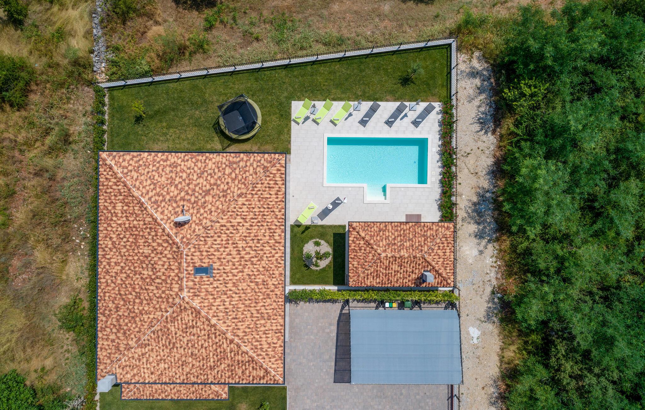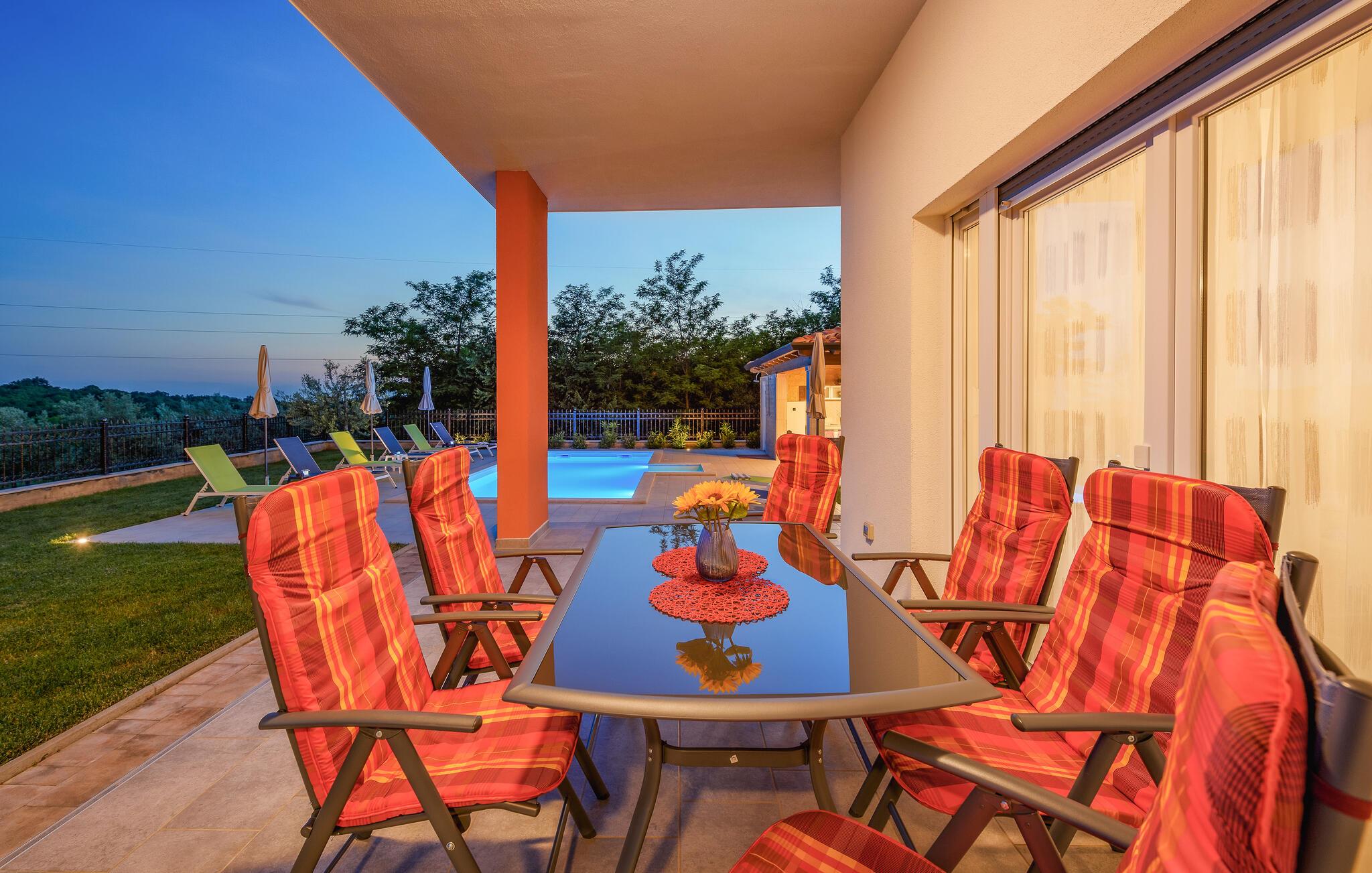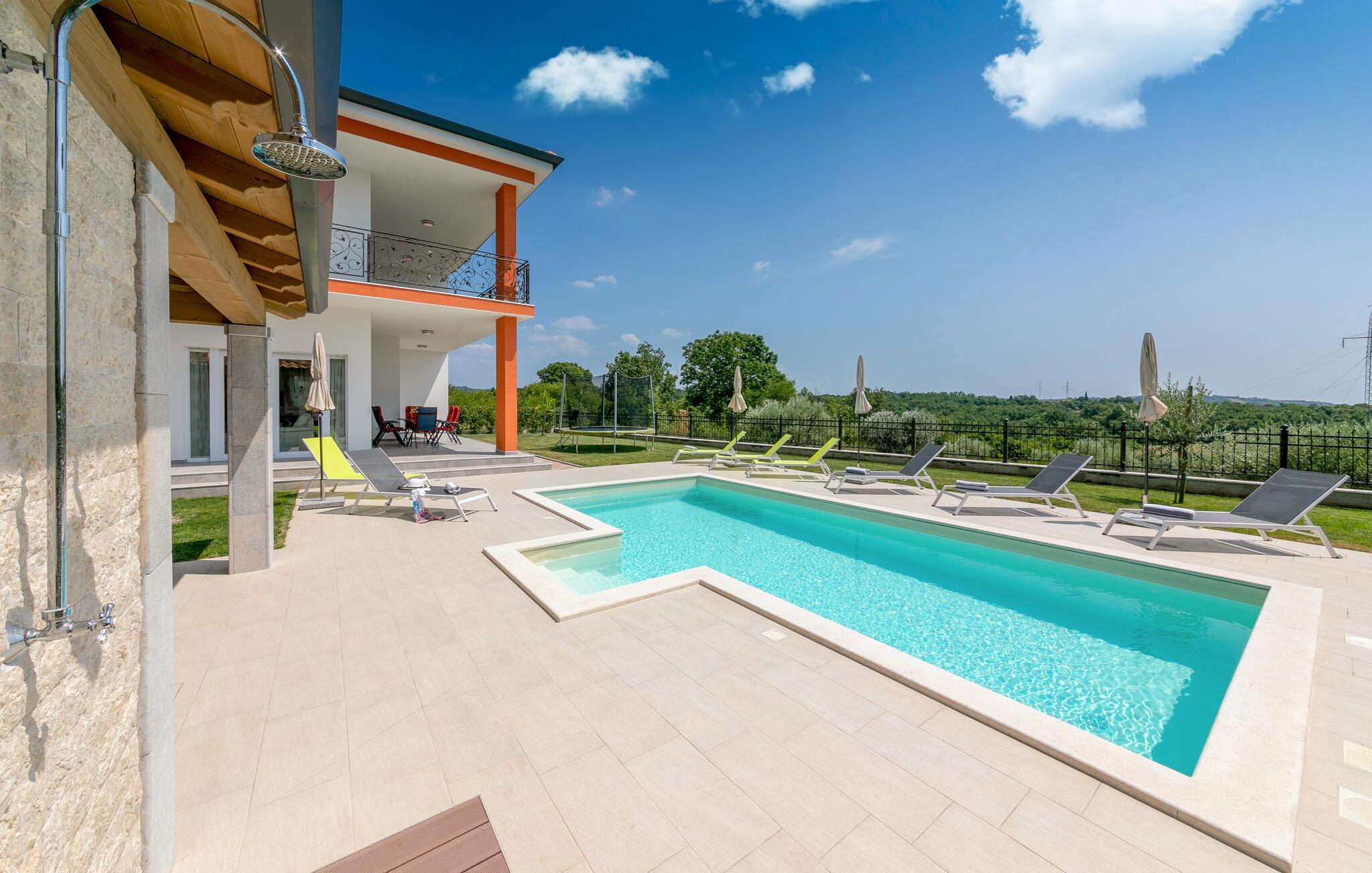 Auf 186 m2 bietet Villa Eva Platz für 8 Personen in insgesamt 4 Schlafzimmern. Eines der Schlafzimmer mit Doppelbett befindet sich am Treppengang neben dem kleinem Bad mit Dusche im Erdgeschoss, wo noch ein helles, modernes Wohnzimmer mit Essbereich und komplett ausgestatteter Küche im offenen Konzept auf Sie wartet. Aus diesen angenehmen Bereich, durchflutet mit natürlichen Licht durch die gläsernen französischen Türen, kommt man zum wunderschönen Pool und dem Essbereich im Offenen. Während die Kinder auf dem Trampolin toben, können Sie sich im Pool abkühlen, auf den Liegestühlen sonnen oder köstliche Gerichte vorbereiten und speisen am Kamin-Grill.