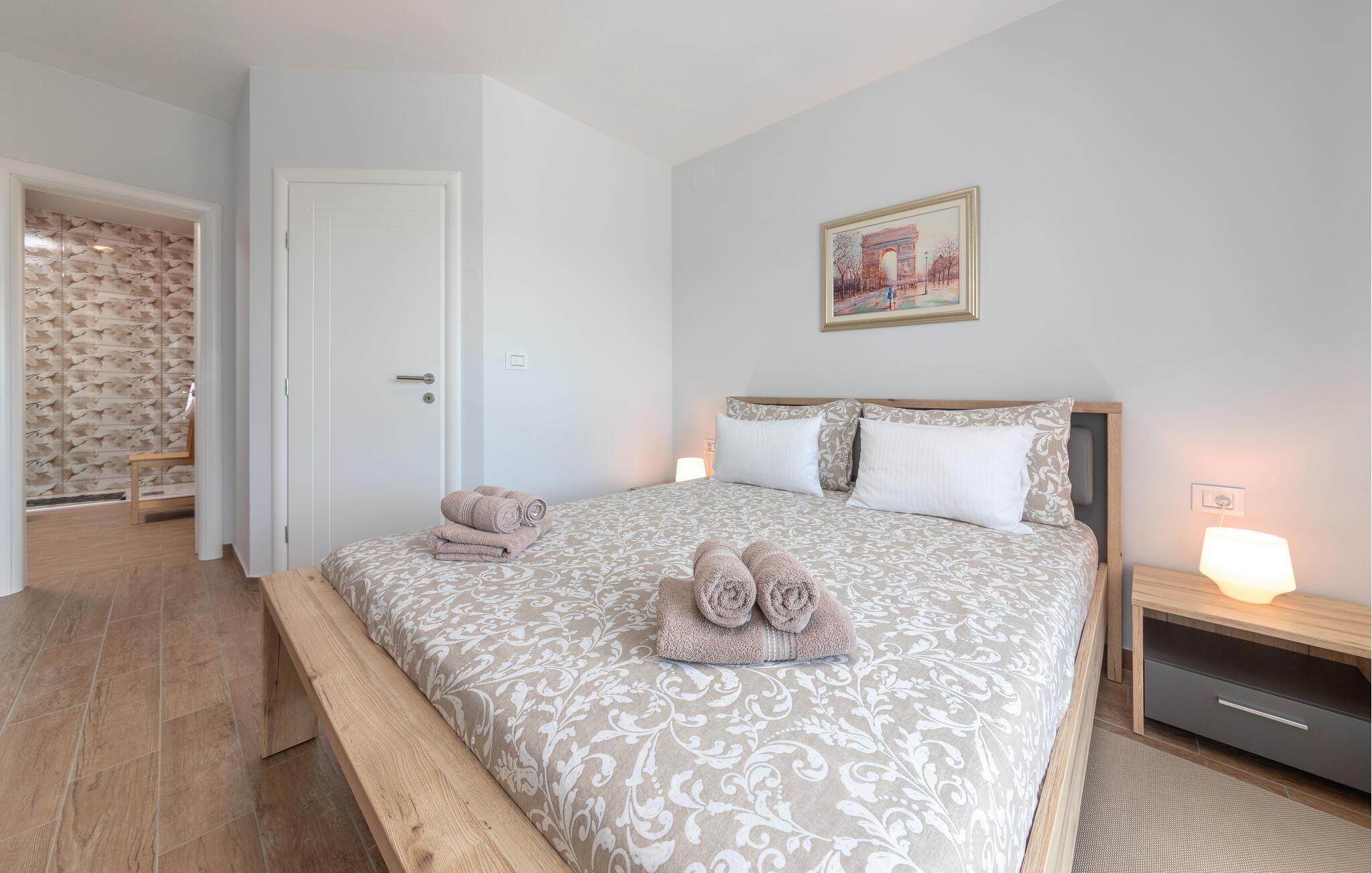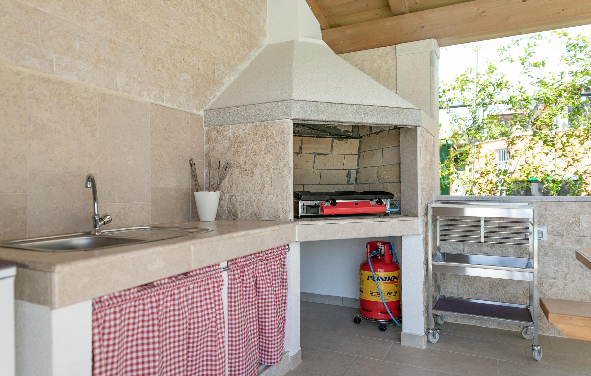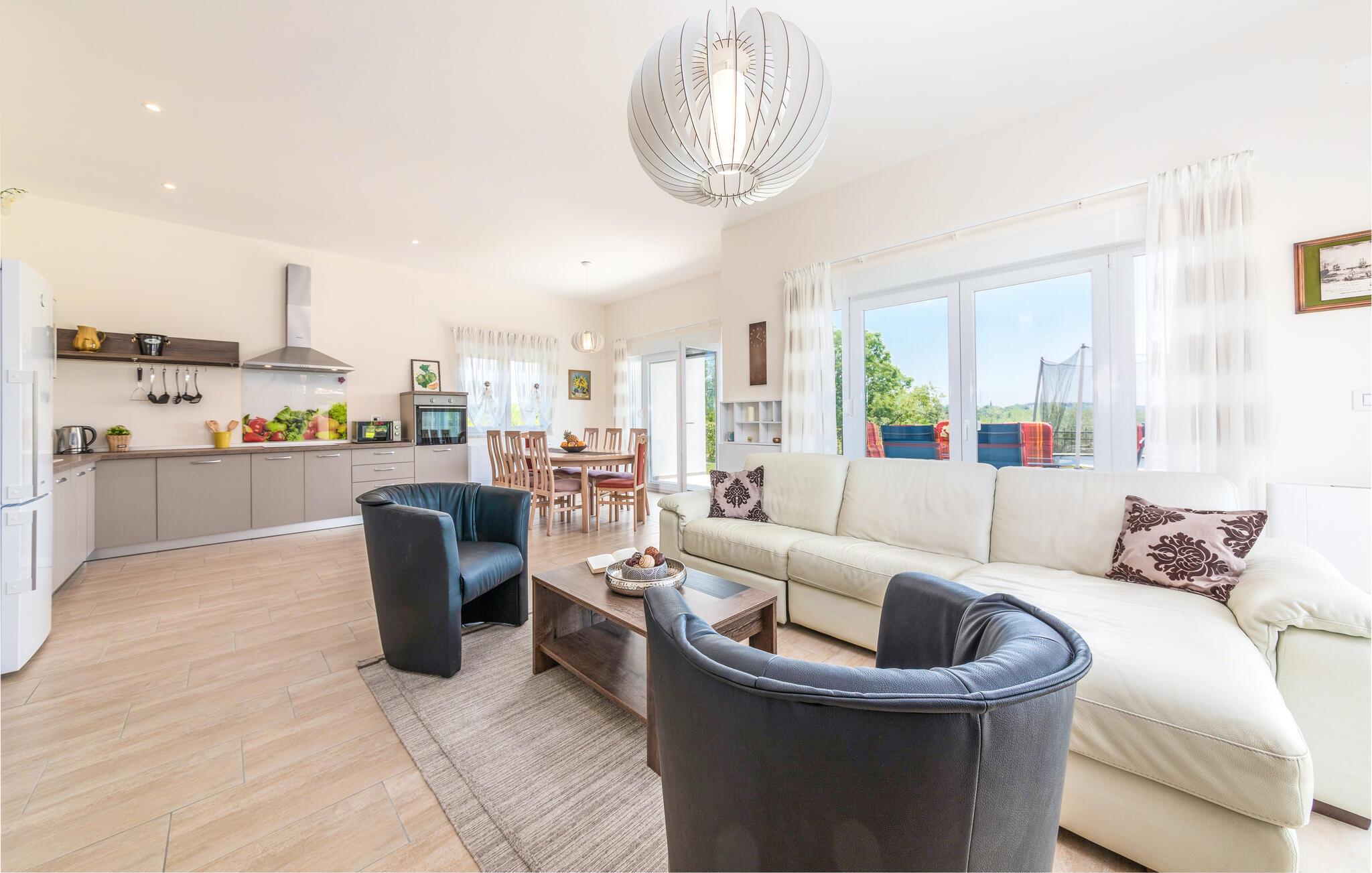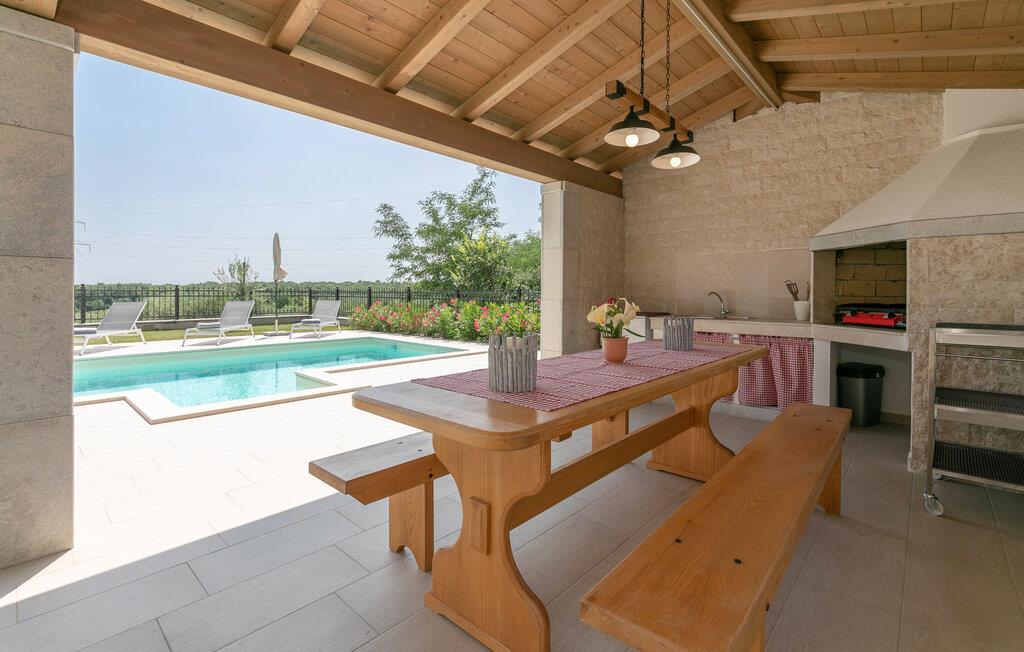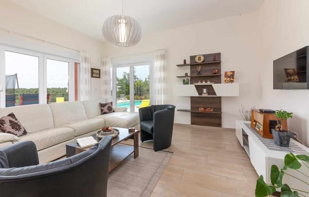 Auf 186 m2 bietet Villa Eva Platz für 8 Personen in insgesamt 4 Schlafzimmern. Eines der Schlafzimmer mit Doppelbett befindet sich am Treppengang neben dem kleinem Bad mit Dusche im Erdgeschoss, wo noch ein helles, modernes Wohnzimmer mit Essbereich und komplett ausgestatteter Küche im offenen Konzept auf Sie wartet. Aus diesen angenehmen Bereich, durchflutet mit natürlichen Licht durch die gläsernen französischen Türen, kommt man zum wunderschönen Pool und dem Essbereich im Offenen. Während die Kinder auf dem Trampolin toben, können Sie sich im Pool abkühlen, auf den Liegestühlen sonnen oder köstliche Gerichte vorbereiten und speisen am Kamin-Grill.
