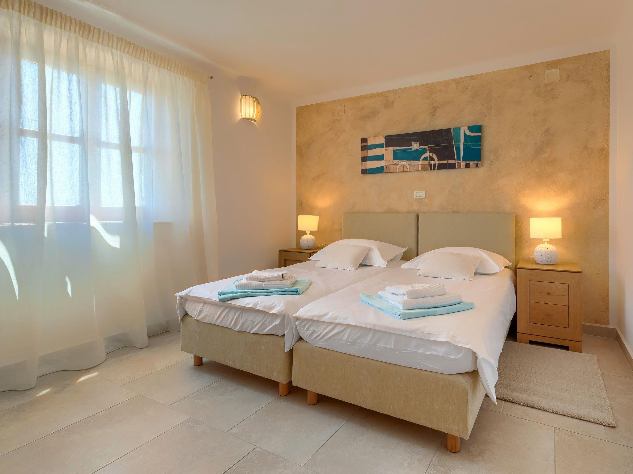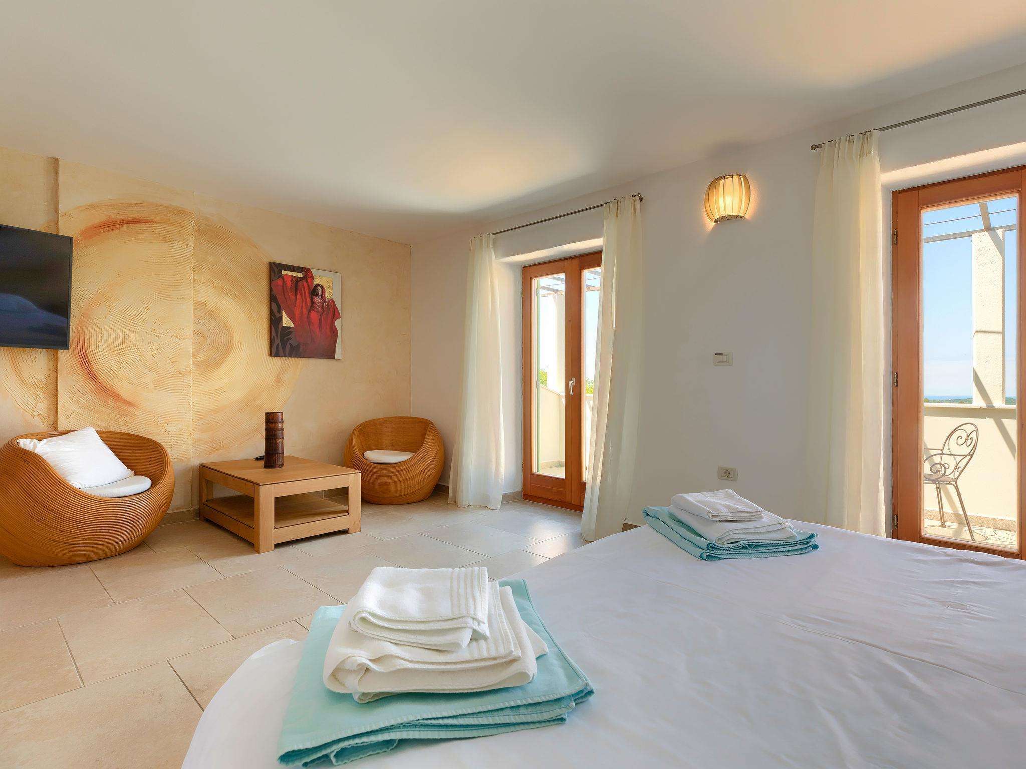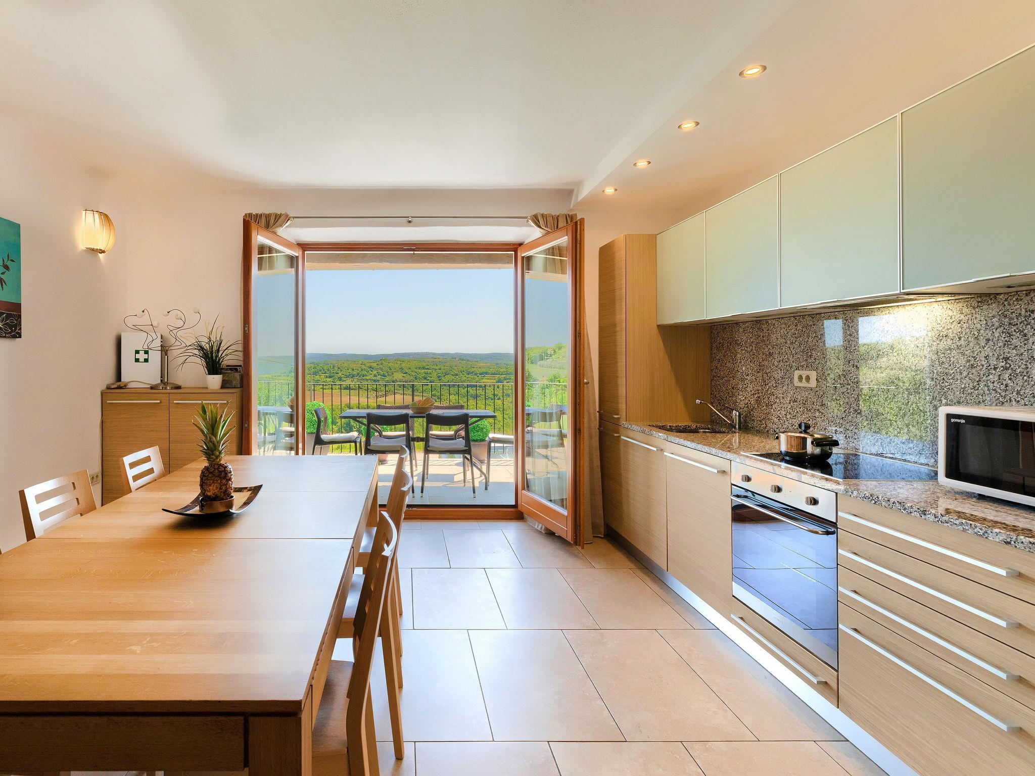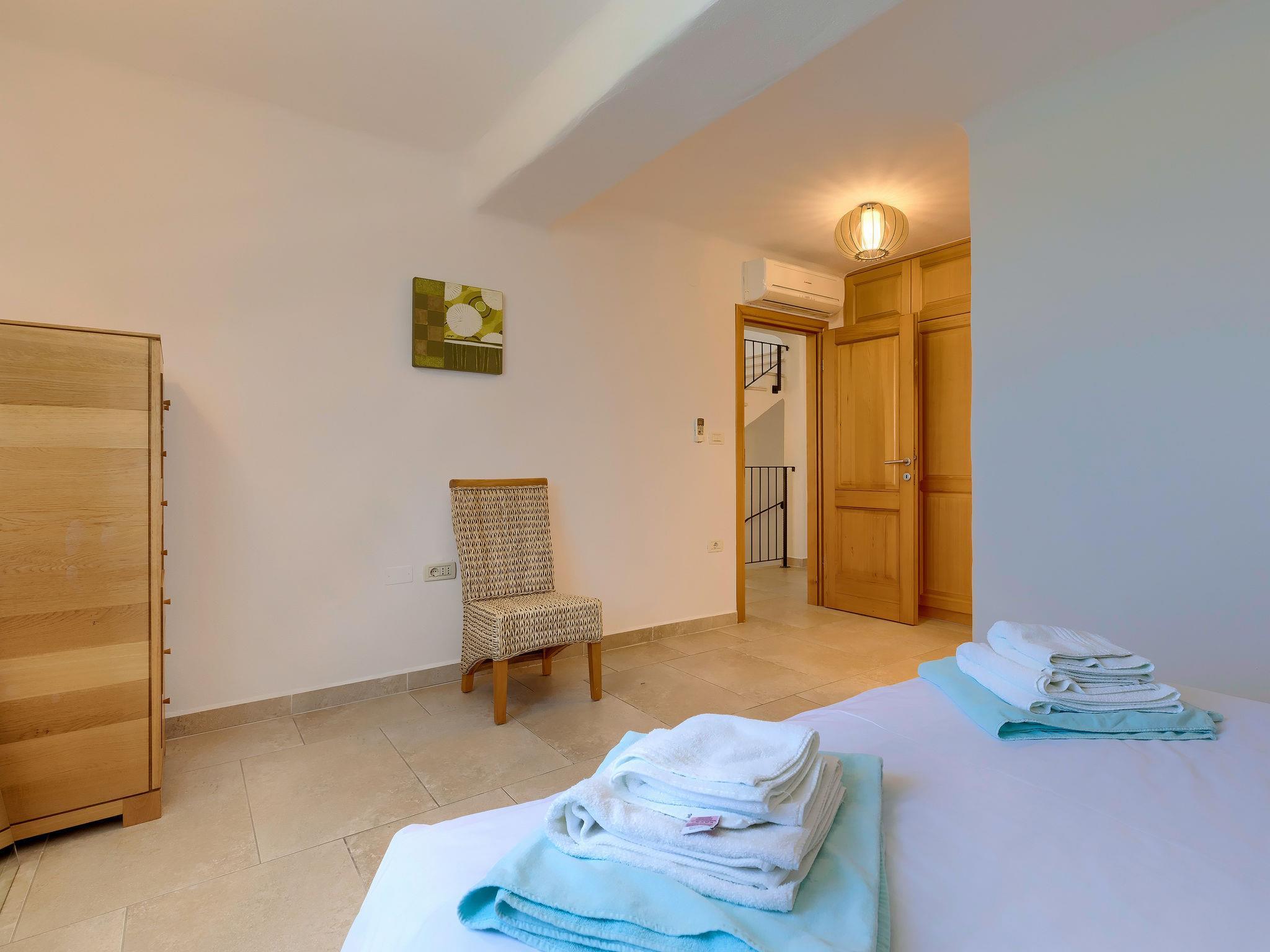 "Istriana", 4-room terraced house 145 m2 on 3 levels. Beautiful and cosy furnishings: living/dining room 45 m2 with satellite TV (flat screen), DVD and air conditioning. Exit to the garden, to the terrace. Open kitchen (oven, dishwasher, 4 ceramic glass hob hotplates, microwave, freezer, electric coffee machine). Exit to the terrace. Sep. WC. Upper floor: 1 room with Dressing room with 2 beds (90 cm, length 200 cm), bath/WC and air conditioning. 1 room with 1 french bed (160 cm, length 200 cm), shower/WC and air conditioning. 2nd upper floor: 1 room 25 m2 with 1 french bed (160 cm, length 200 cm), bath/bidet/WC and air conditioning. Exit to the terrace. Floor heating. Terrace 10 m2, roofed, terrace 15 m2 partly roofed, garden 20 m2, lawn. Terrace furniture, barbecue (portable), deck chairs. Marvellous view of the countryside. Facilities: washing machine. Internet (WiFi, free). Terrace 20 m2.