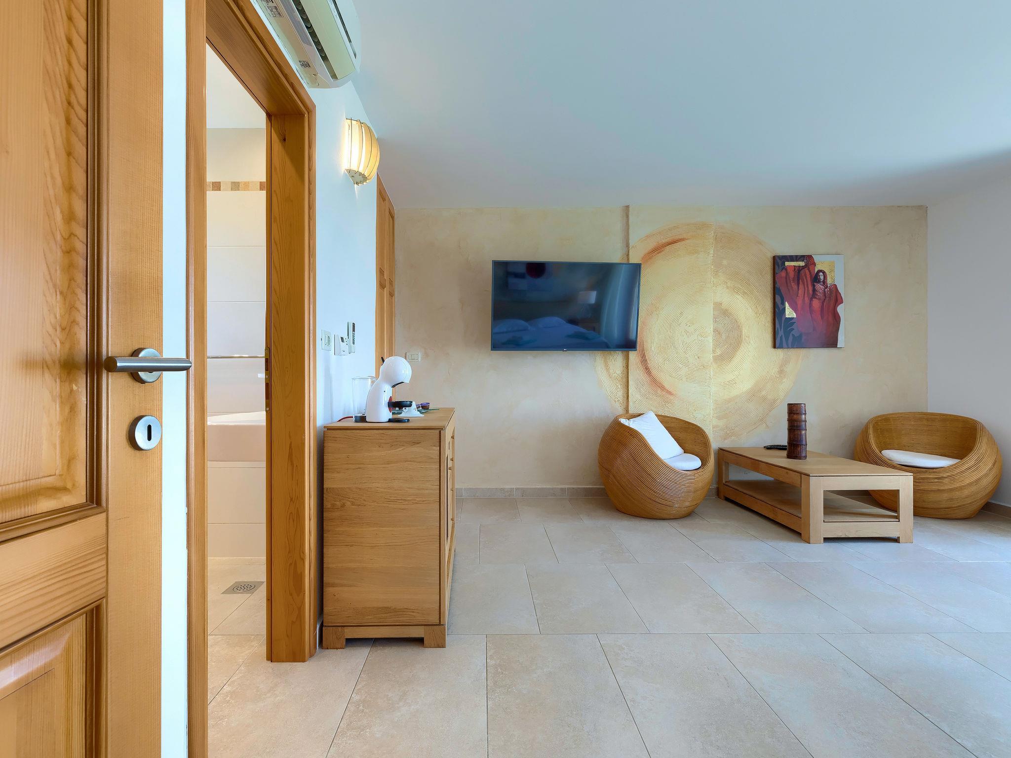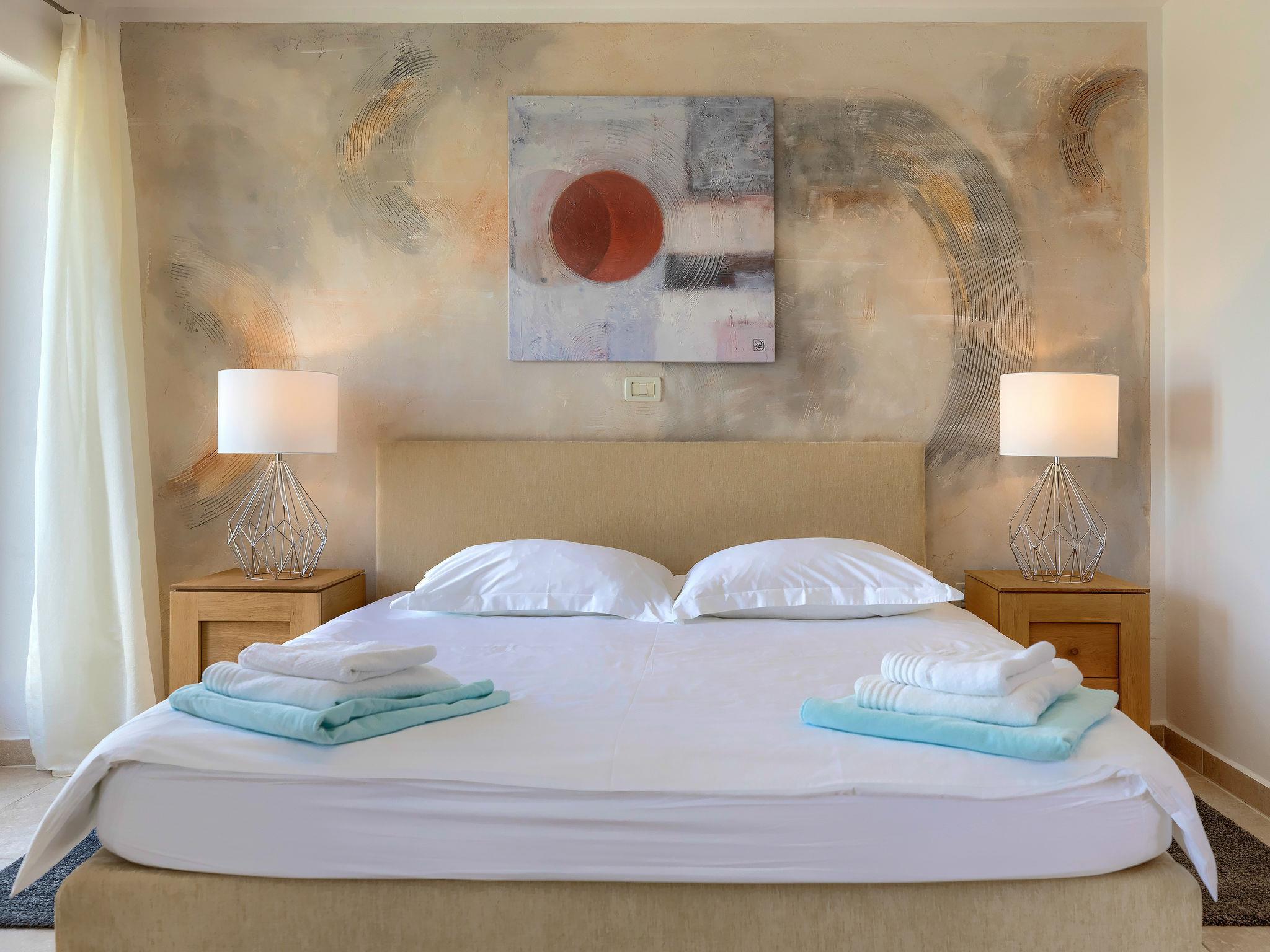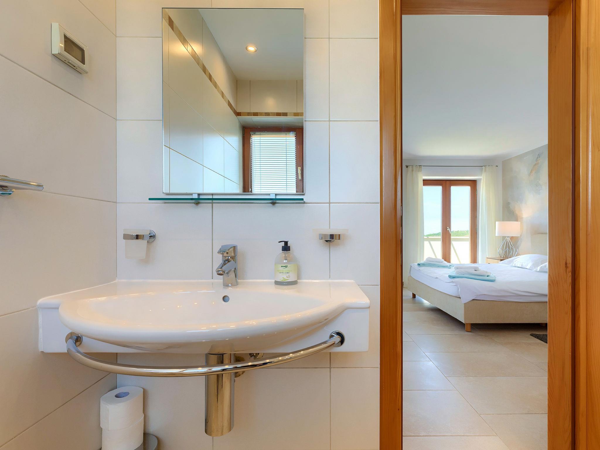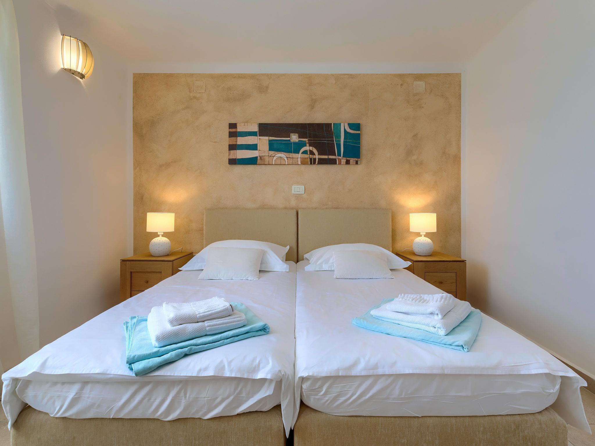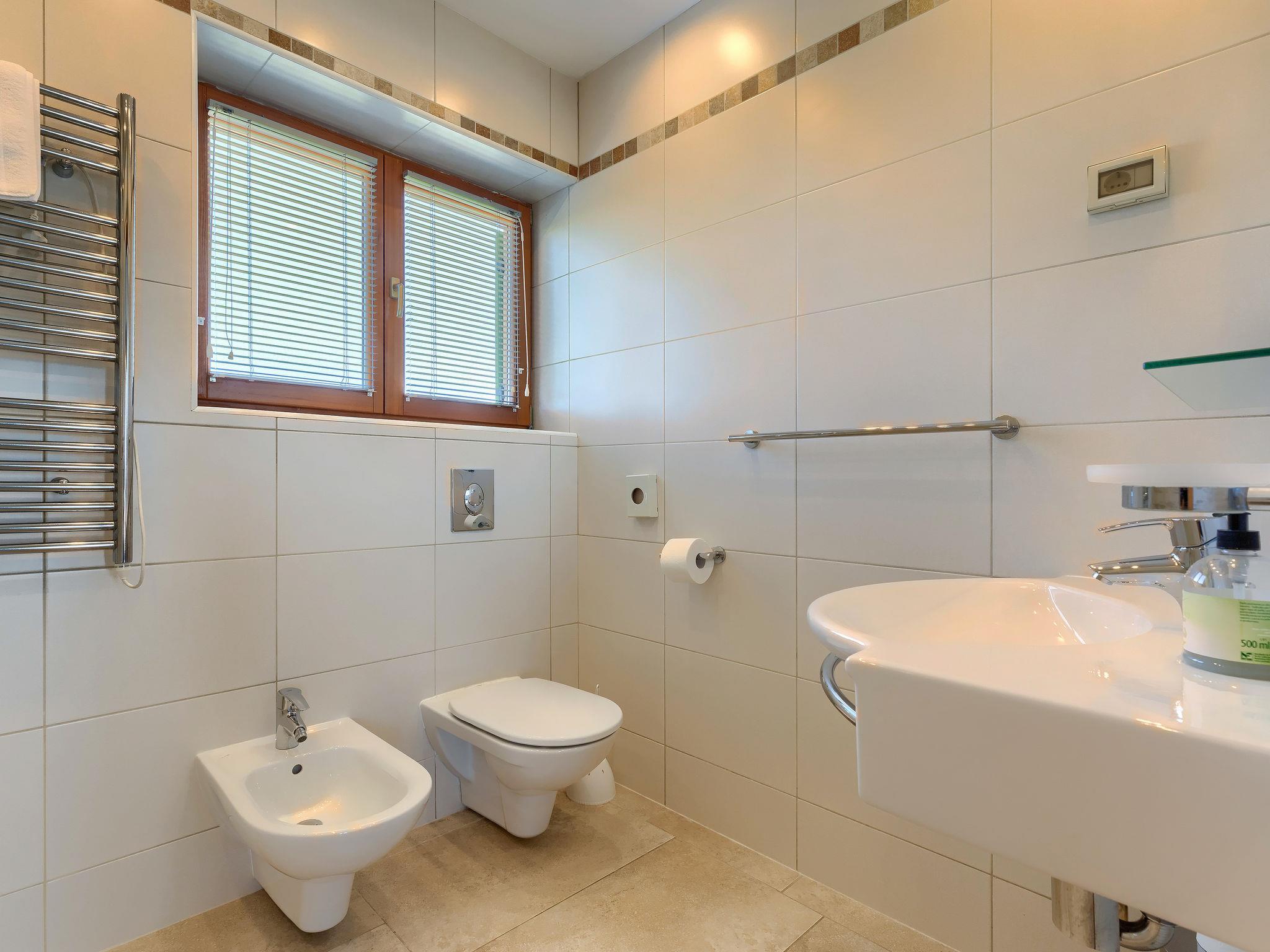 "Istriana", 4-room terraced house 145 m2 on 3 levels. Beautiful and cosy furnishings: living/dining room 45 m2 with satellite TV (flat screen), DVD and air conditioning. Exit to the garden, to the terrace. Open kitchen (oven, dishwasher, 4 ceramic glass hob hotplates, microwave, freezer, electric coffee machine). Exit to the terrace. Sep. WC. Upper floor: 1 room with Dressing room with 2 beds (90 cm, length 200 cm), bath/WC and air conditioning. 1 room with 1 french bed (160 cm, length 200 cm), shower/WC and air conditioning. 2nd upper floor: 1 room 25 m2 with 1 french bed (160 cm, length 200 cm), bath/bidet/WC and air conditioning. Exit to the terrace. Floor heating. Terrace 10 m2, roofed, terrace 15 m2 partly roofed, garden 20 m2, lawn. Terrace furniture, barbecue (portable), deck chairs. Marvellous view of the countryside. Facilities: washing machine. Internet (WiFi, free). Terrace 20 m2.