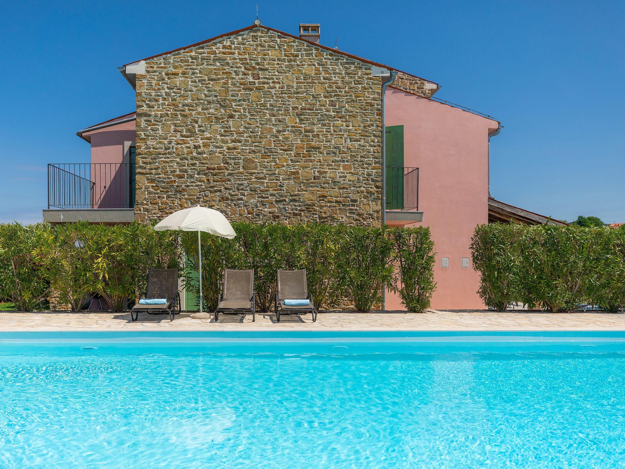 Beautiful terraced house. In the hamlet Baredine 4 km from the centre of Buje, in a quiet, sunny, elevated position, 17 km from the sea. For shared use: property 500 m2, garden, swimming pool angular (11 x 8 m, depth 100 - 150 cm, seasonal availability: 15.May. - 15.Sep.) with internal staircase. Outdoor shower, barbecue. In the house: internet access. Parking at the house on the premises. Shop 4 km, restaurant 1 km, bus stop 4 km, railway station 33 km, pebble beach 17 km. Tennis 16 km, sports centre 16 km, walking paths from the house 1 km, cycle lane 1 km. Nearby attractions: Aquapark 19 km.