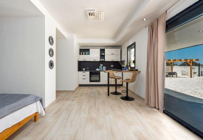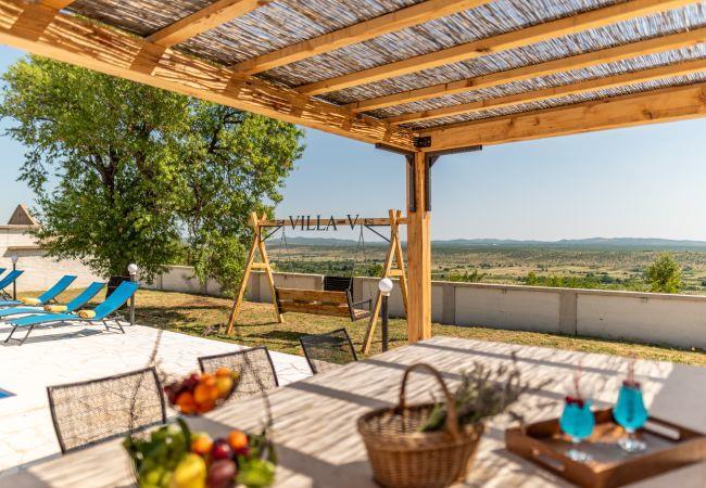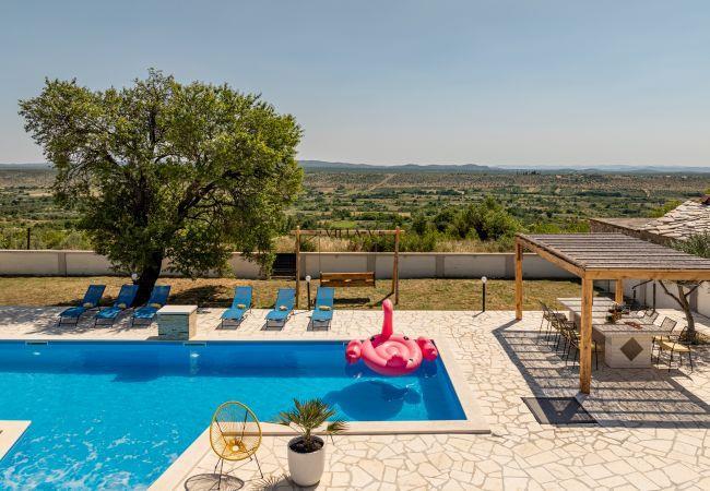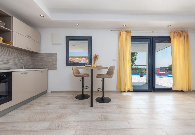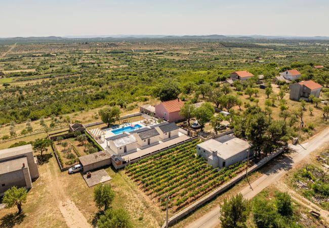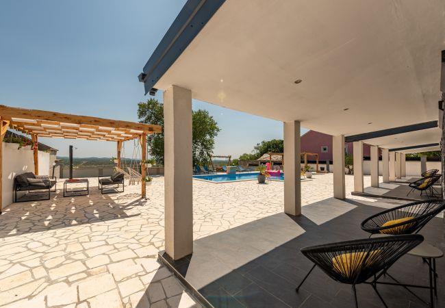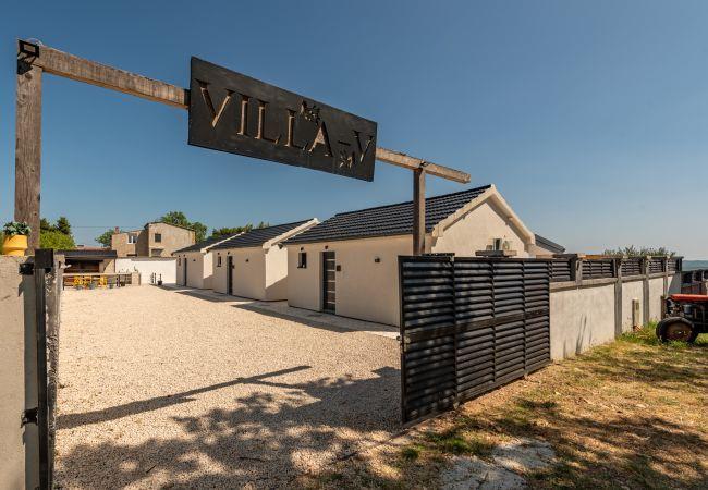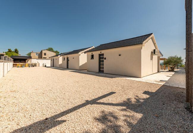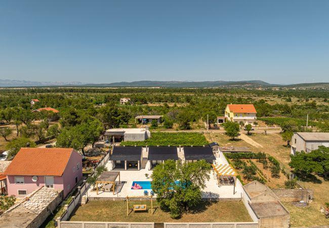 This charming 3-unit Villa is located in Bukovic, a part of the town of Benkovac, which is 36 kilometers away from the historical town of Zadar. The property consists of three units and their communal area, the beautiful terrace and large swimming pool. Each of the units at the property offer a double bed and one additional single bed, if neccessary, making it perfect place for 9 guests who appreciate a dose of privacy in their accommodation. The perfect place to gather is the terrace and pool area, where you can enjoy refresments and activities, all in the peaceful sorroundings of this property that guarantee tranquil vacations, peace and calm. The guests also have BBQ facilities at their disposal and a children`s playground only 200 meters away.