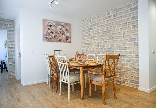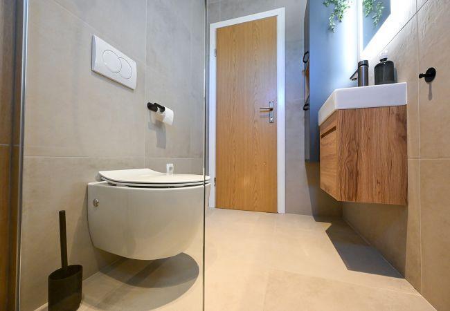 The house includes two bathrooms with showers, a fully equipped kitchen, a dining room with a dining table, and a spacious living room with a TV. The entire space is heated via underfloor heating, and the living room and one double bedroom are air-conditioned. Right next to the house is a large children's playground with one goal and a playhouse with swings, seesaws, and a slide, making this property particularly suitable for families with children. Guests have access to a swimming pool with sun loungers and an outdoor shower. There is also a hydromassage function built into the pool steps. A spacious terrace with outdoor seating is perfect for relaxing outdoors. One garage parking space and three additional parking spaces in the courtyard are available.