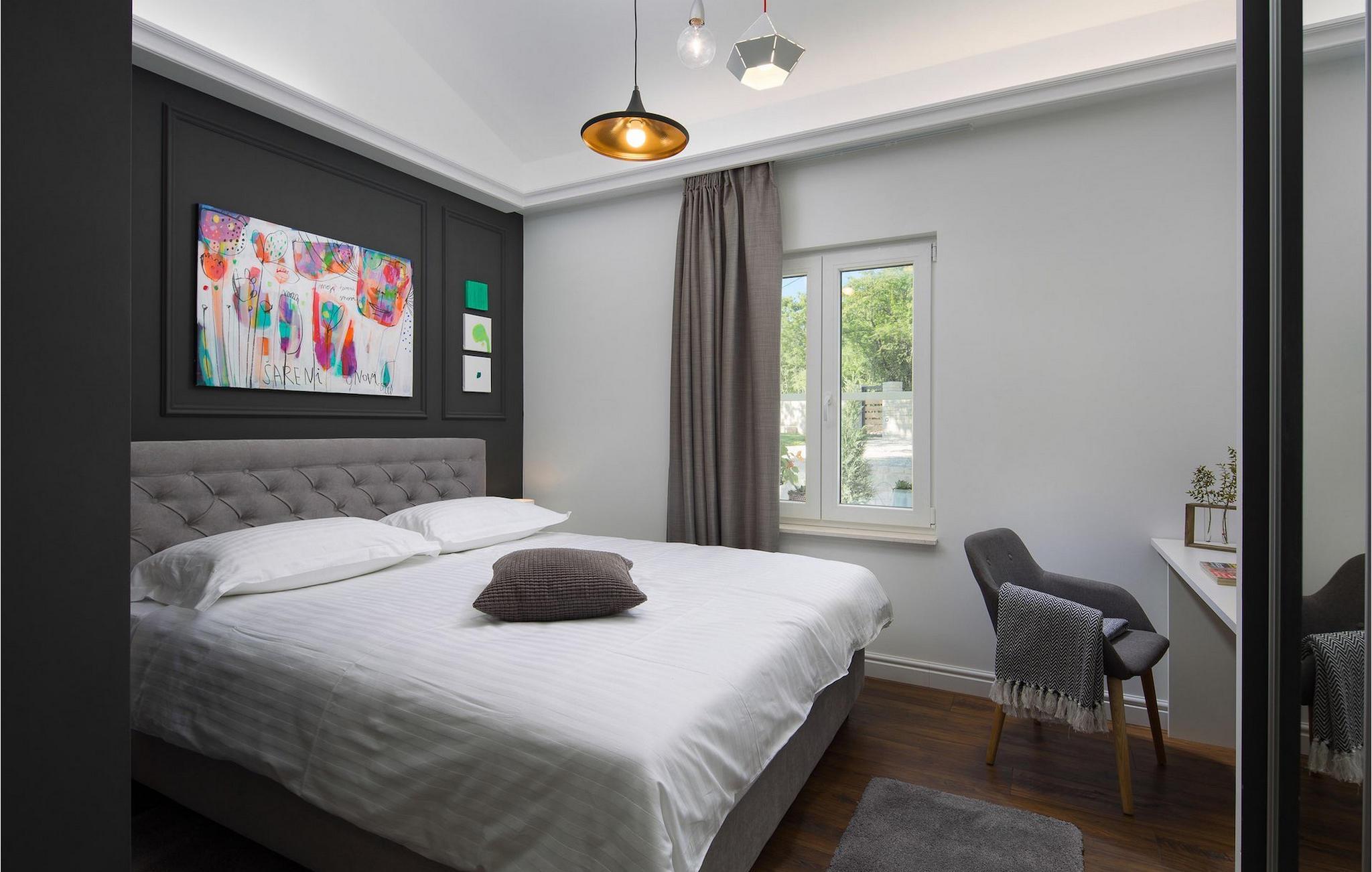 Der Innenbereich ist genauso bezaubernd wie der Außenbereich. Aus diesem Grund wurde das Haus auch dank seines heruasstechendes Designs mit einem Award ausgzeichnet. Im stilvoll eingerichteten Erdgeschoss finden Sie eine komplett ausgestattete Küche mit Essbereich, ein helles Wohnzimmer, welches direkten Zugang zur sonnigen Terrasse hat, eine separate Toilette, Wellness sowie ein Schlafzimmer mit Doppelbett und ensuite Bad. Die Villa bietet einen Weinkühlschrank an - Lehnen Sie sich in der bequemen Lounge zurück und genießen Sie atemberaubende Sonnenuntergänge mit einem der besten istrischen Getränke in der Hand, welches Sie in der Bar zu einem guten Preis erhalten können.