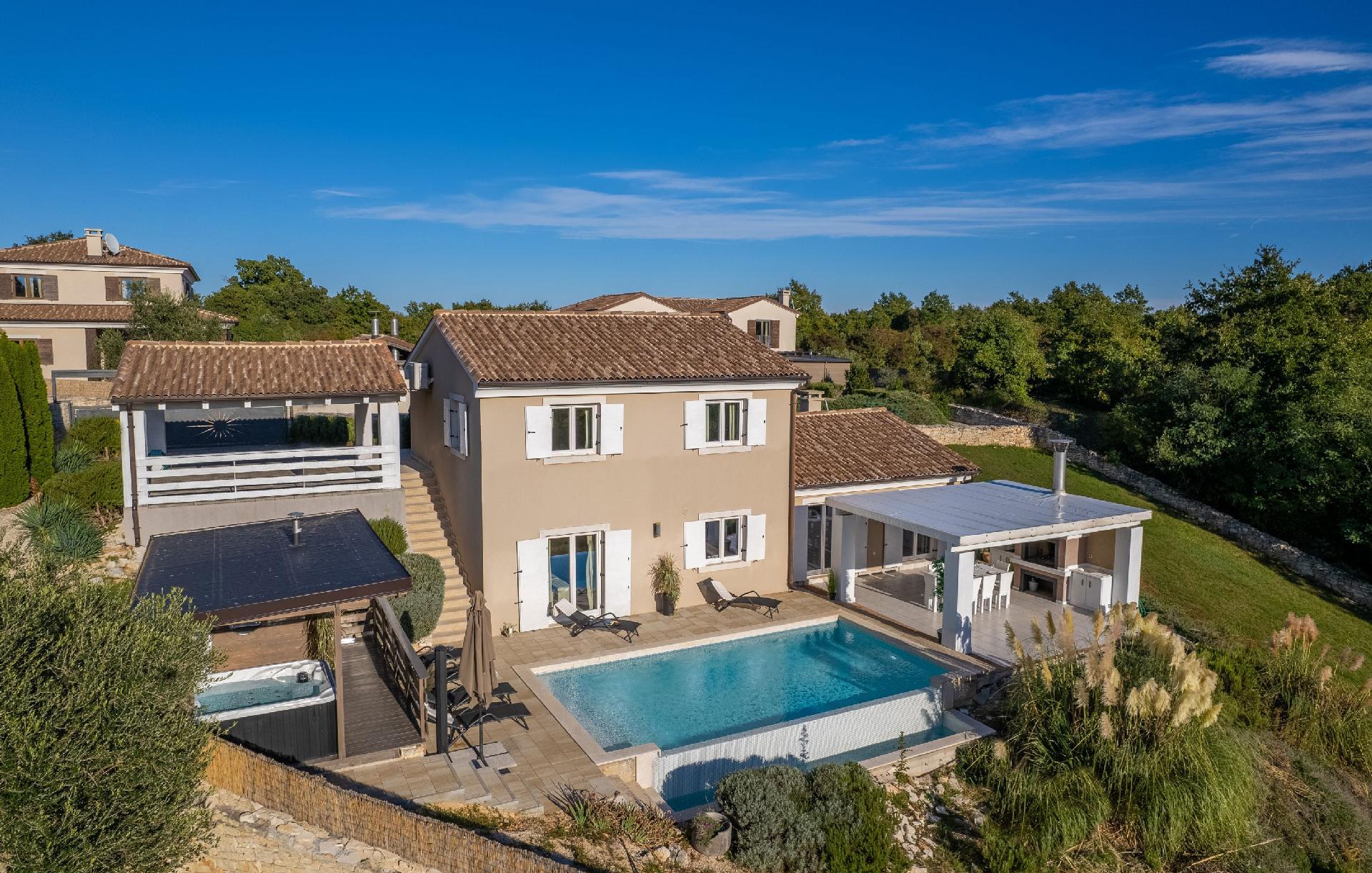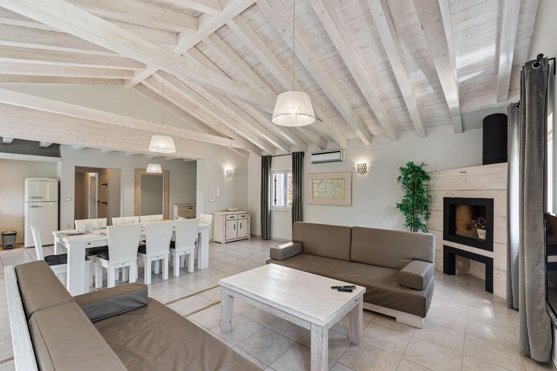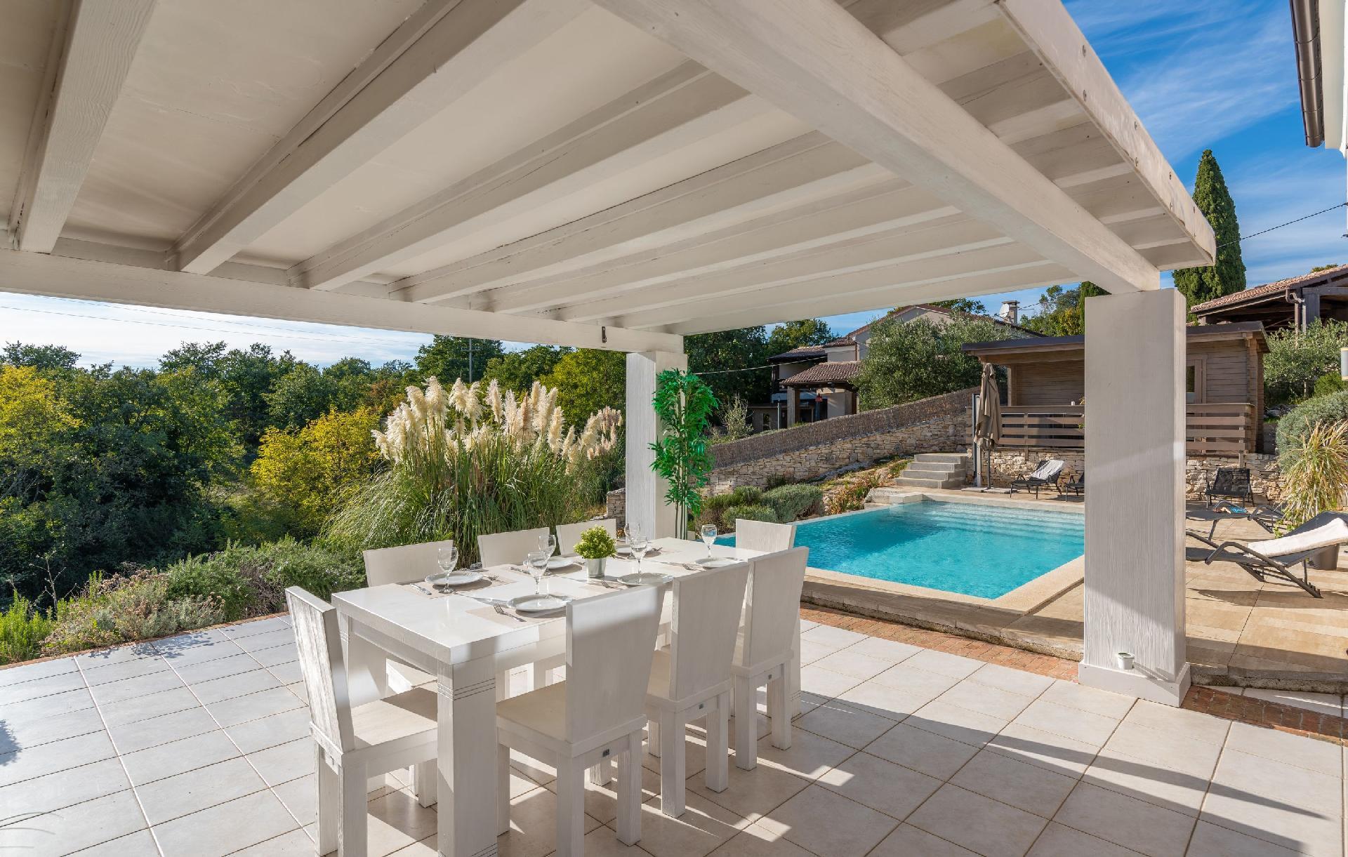 The outdoor area is an oasis of relaxation with a spacious sunbathing terrace, a pastel blue pool and a stone terrace with a rustic dining area for unforgettable evening barbecues. The outdoor kitchen and barbecue, the illuminated pool atmosphere and the summery lanterns create the perfect holiday feeling. In addition, the solid window and door shutters exude Mediterranean flair and emphasise the character of the villa.