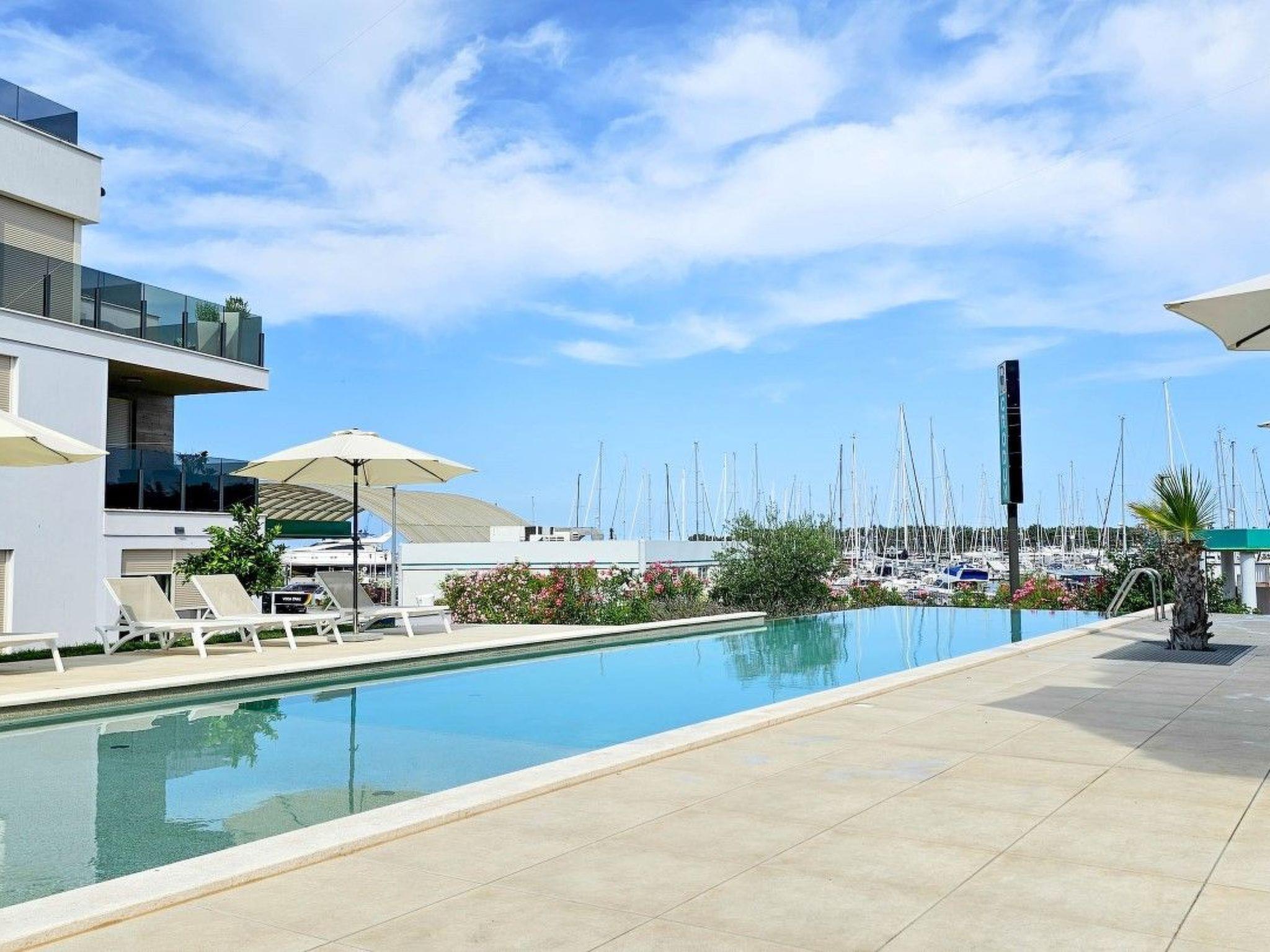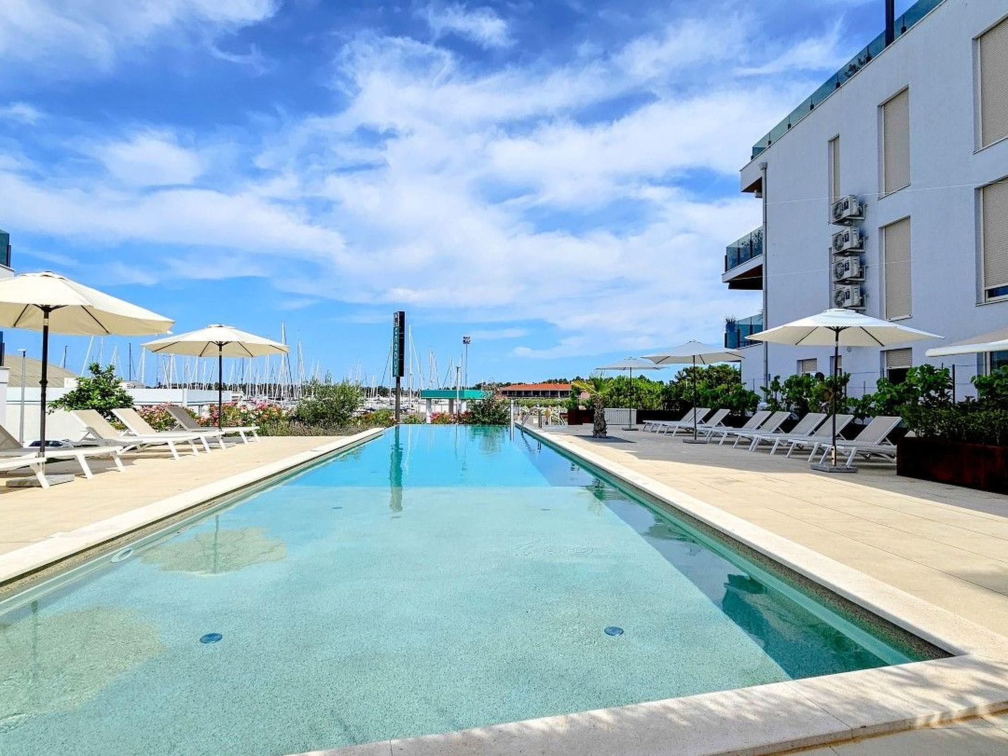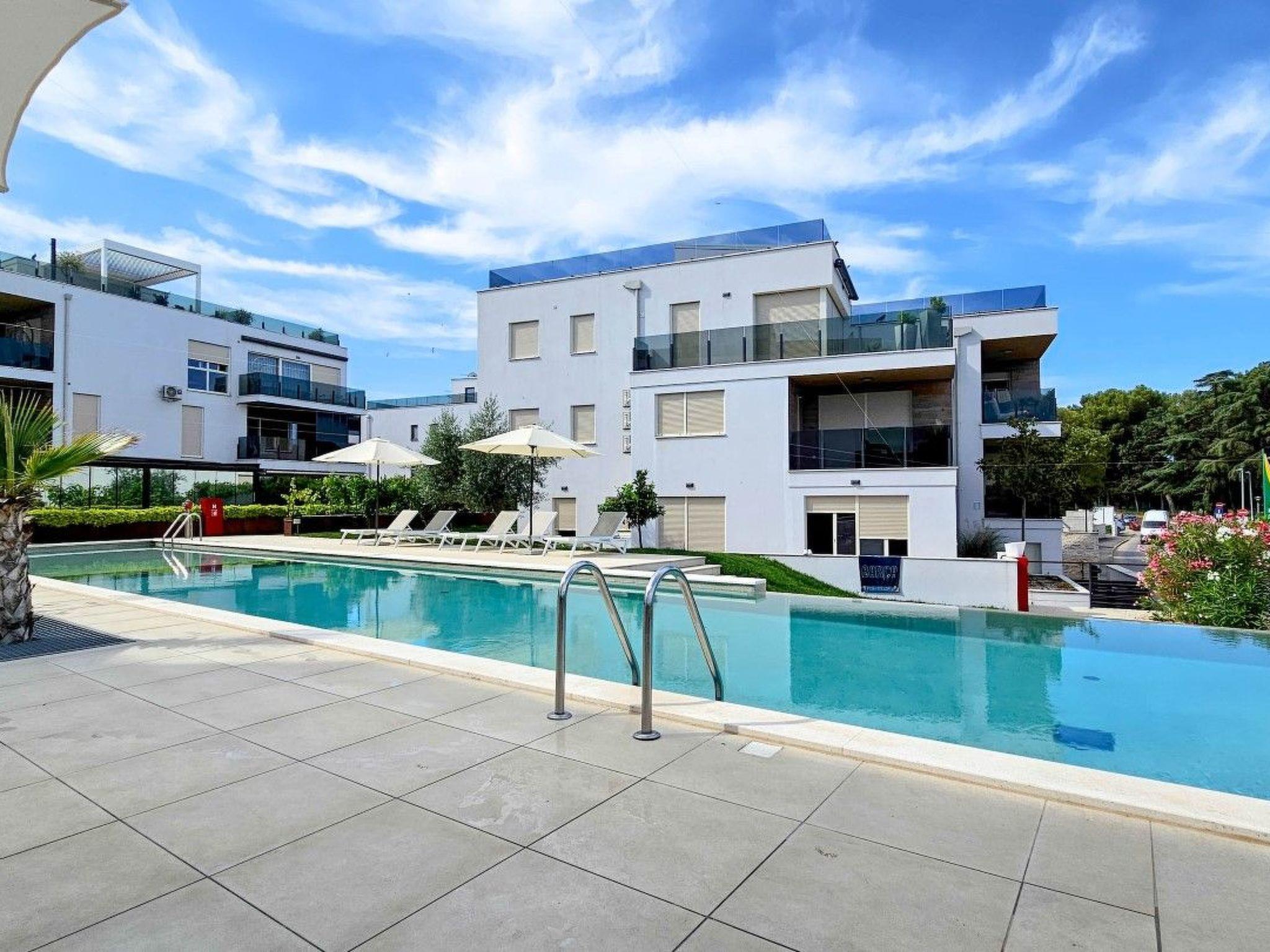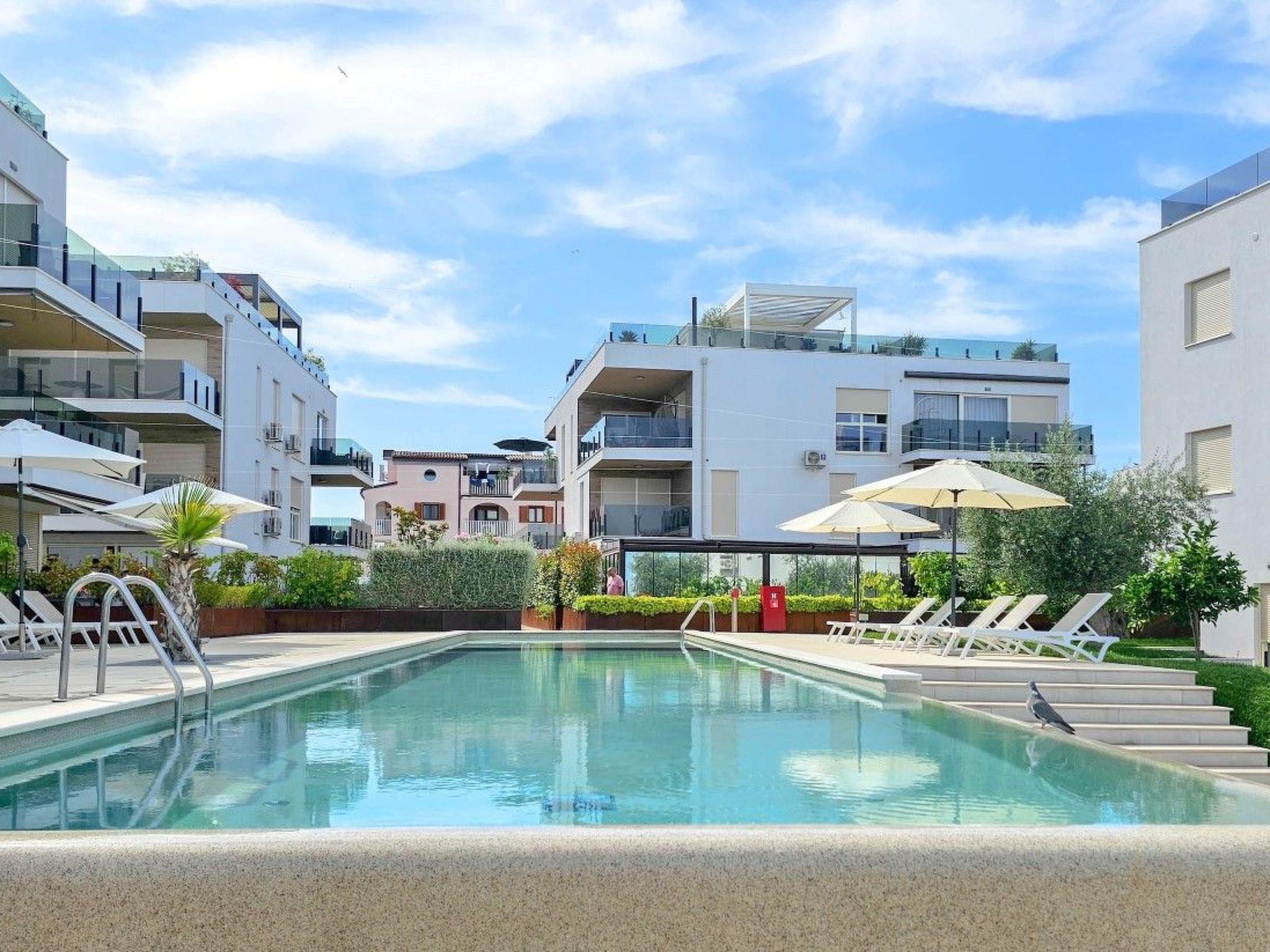 Apartment Green Oasis B7 is located in a modern building complex, next to a shared outdoor pool equipped with sun loungers and parasols.
