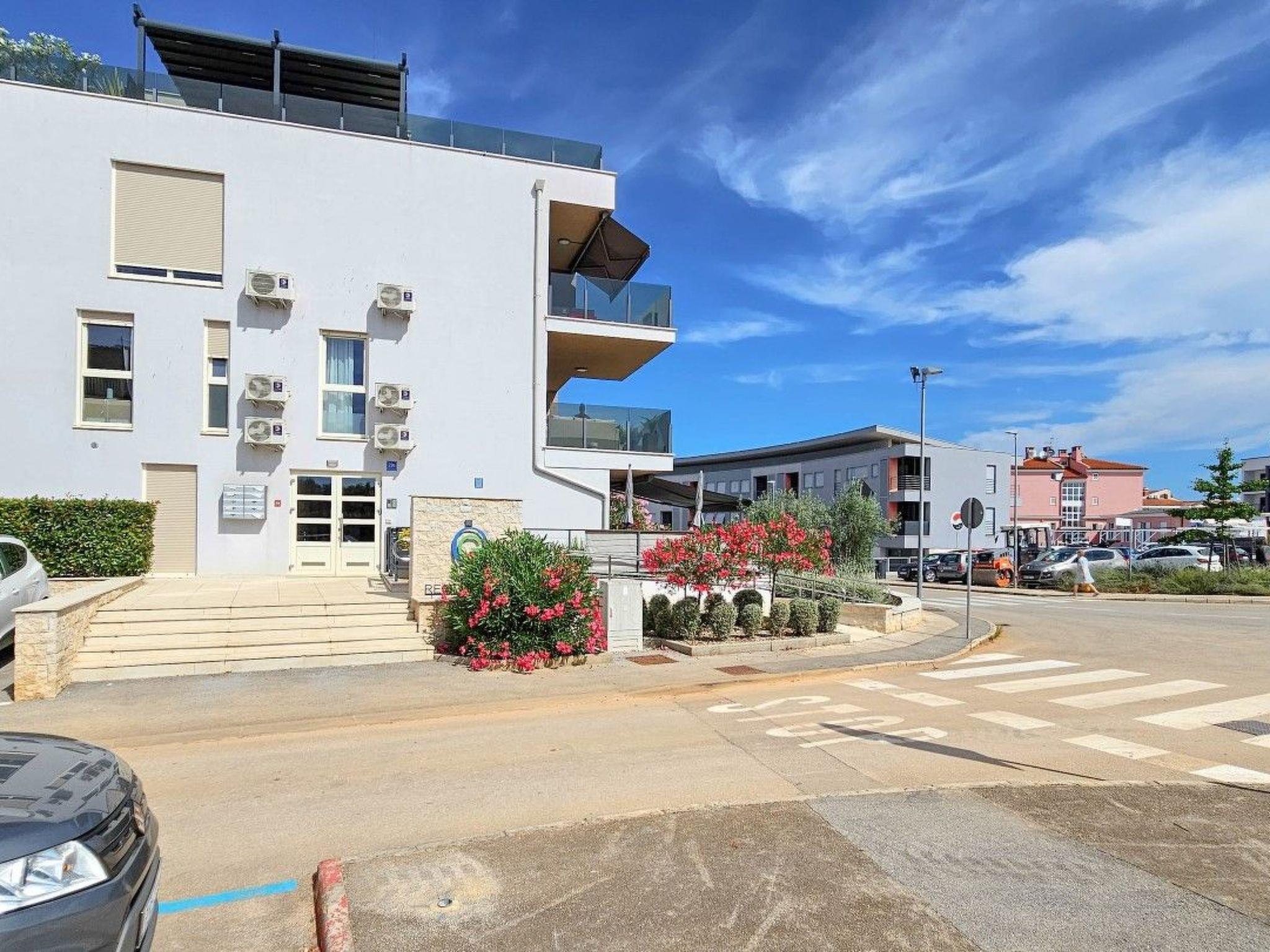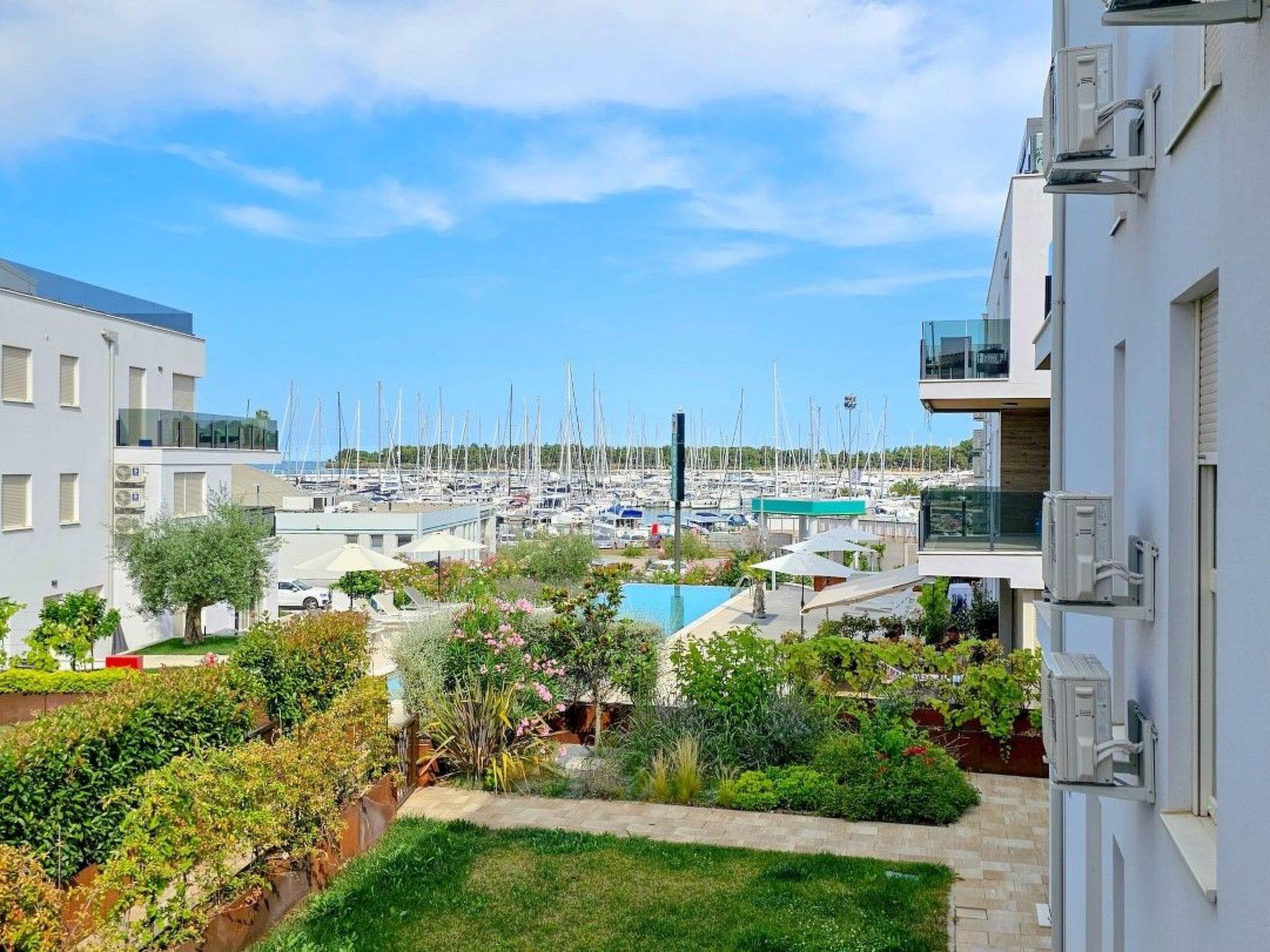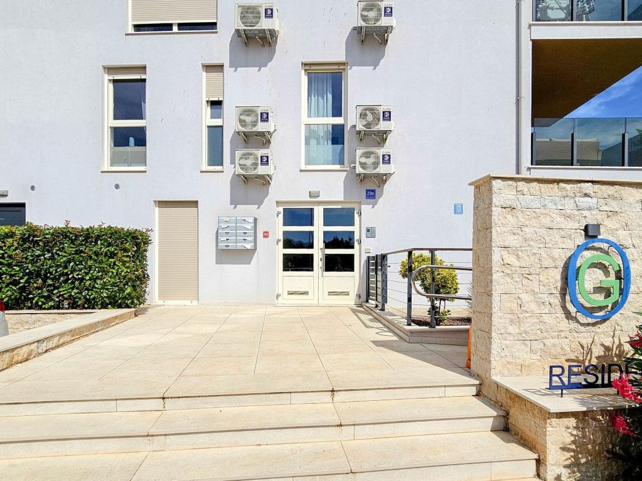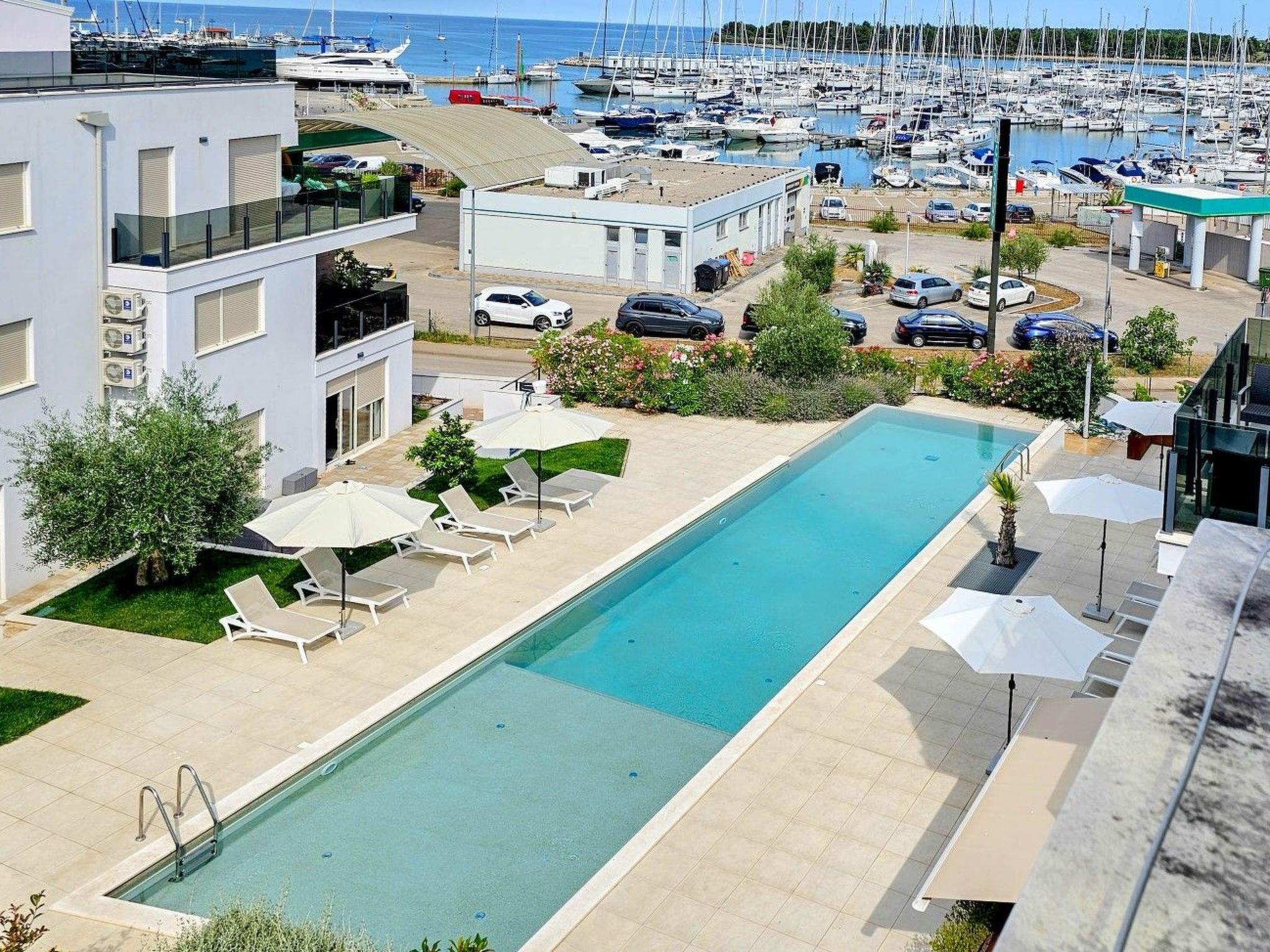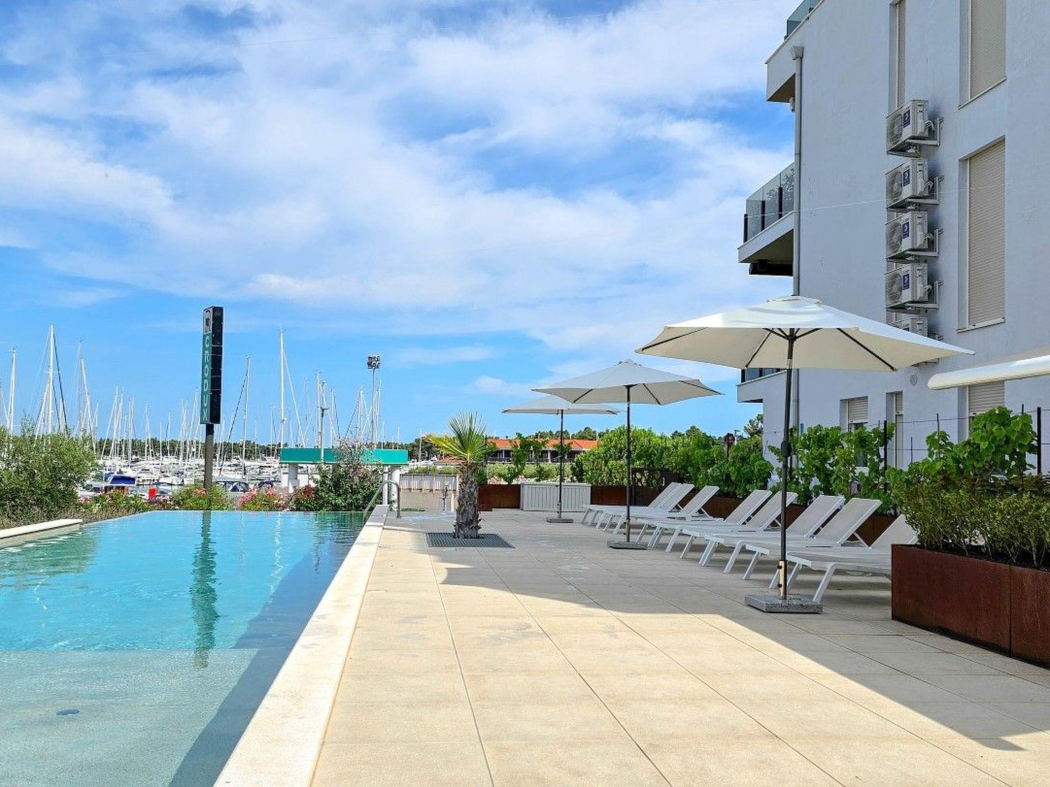 Apartment Green Oasis B7 is located in a modern building complex, next to a shared outdoor pool equipped with sun loungers and parasols.