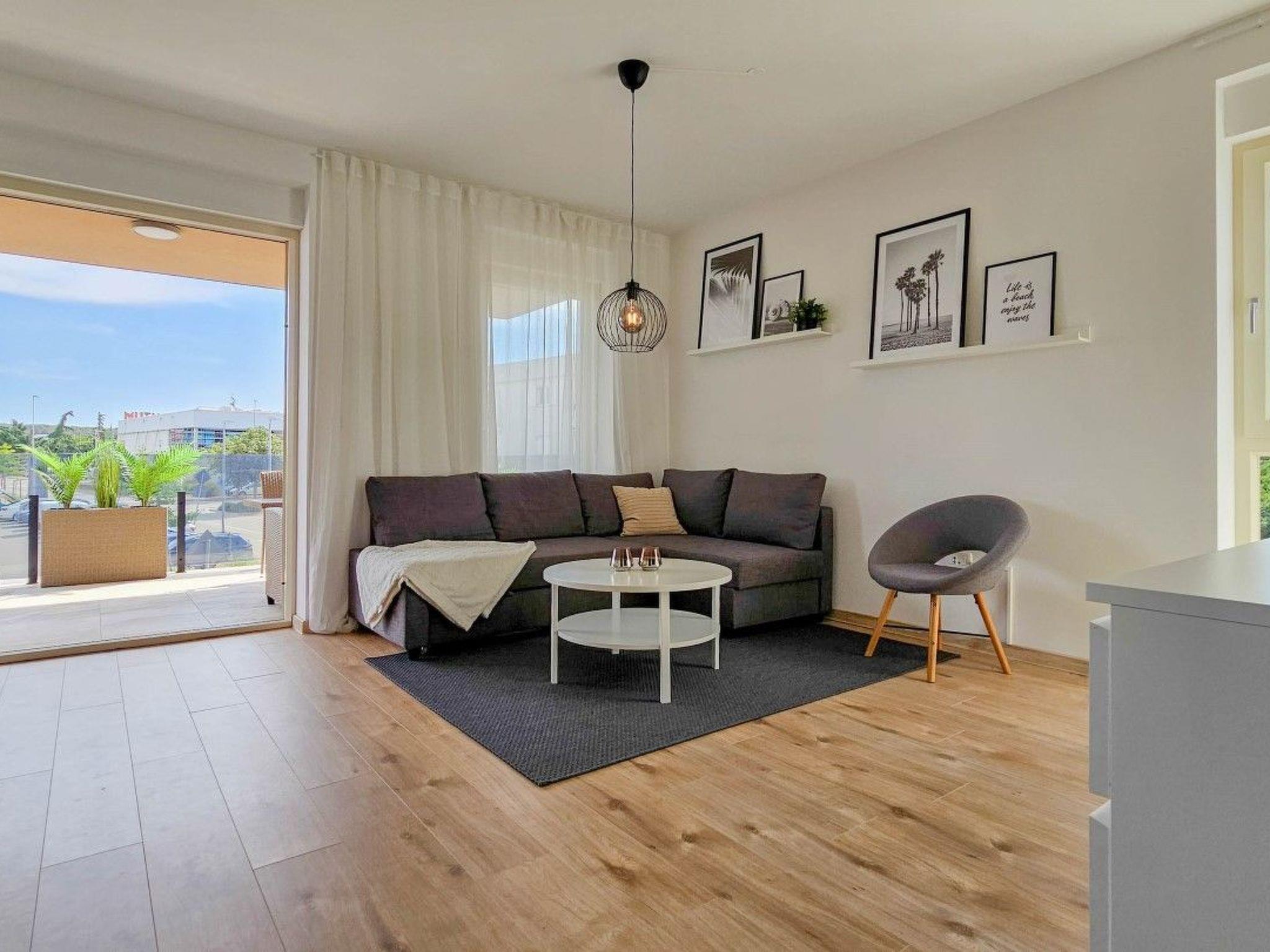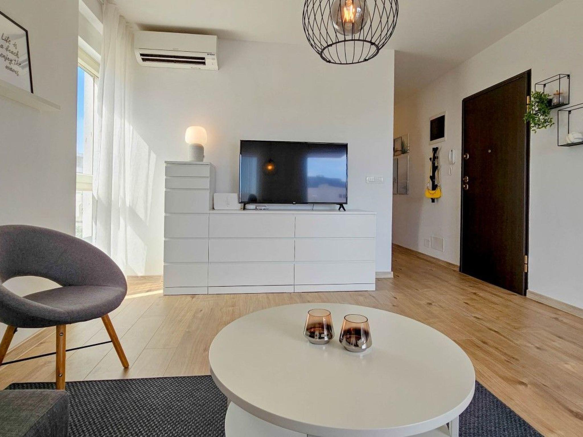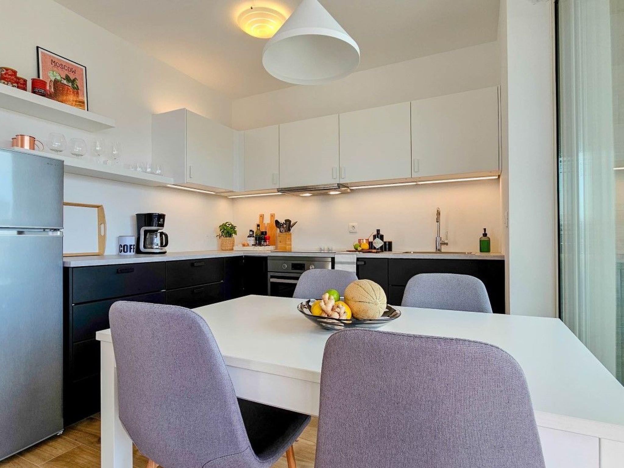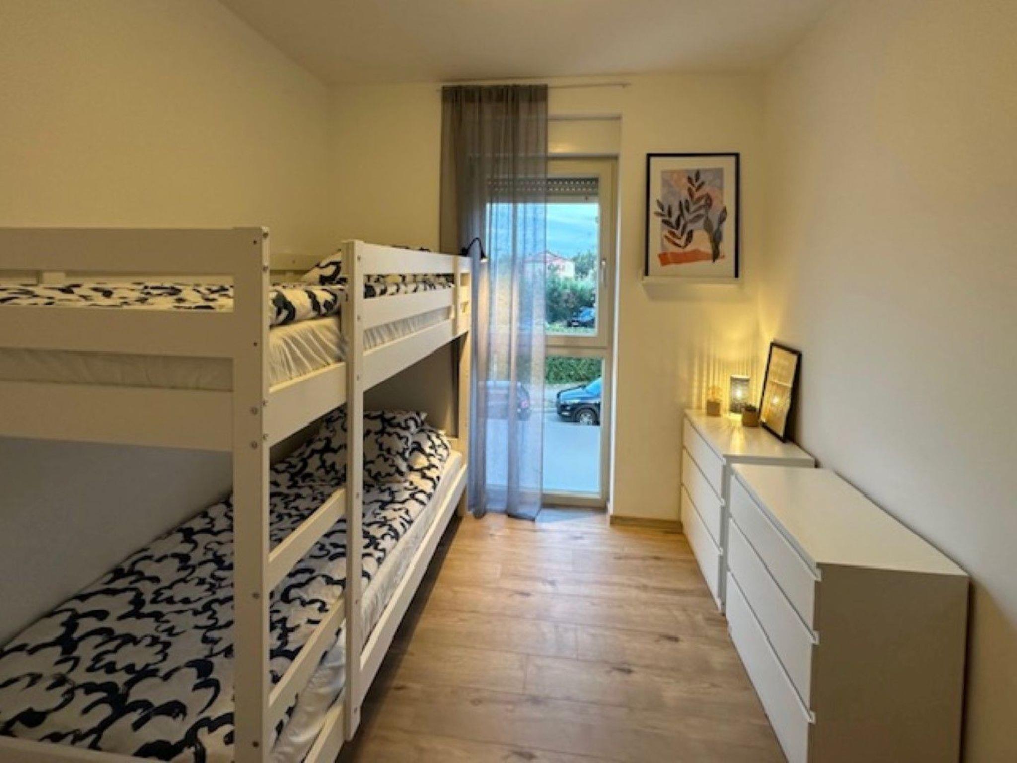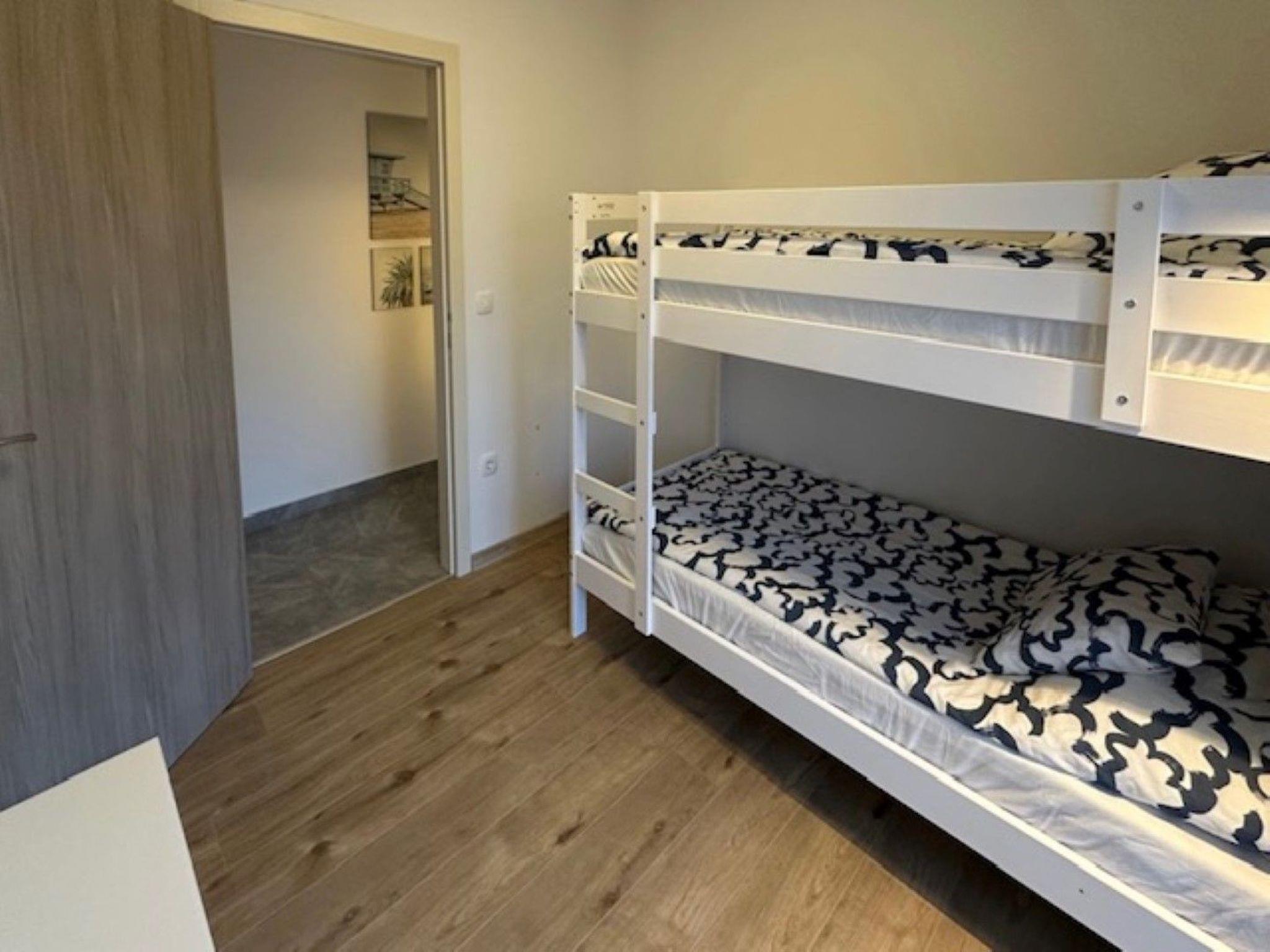 The apartment has two bedrooms, one with a double bed and the other with a bunk bed. An additional two guests can be accommodated on a sofa bed in the living room. The modern kitchen is equipped with the basic necessities for preparing meals.