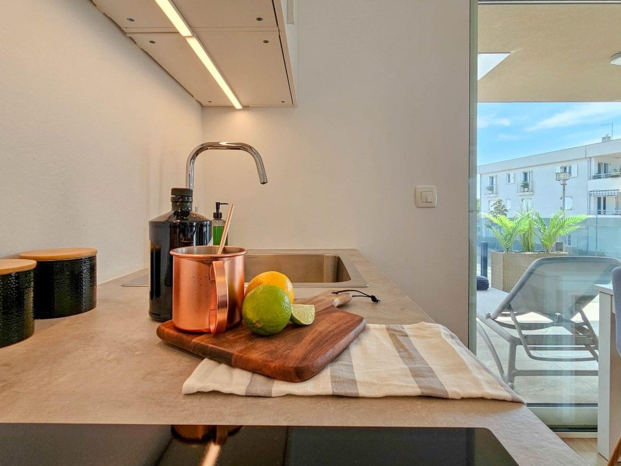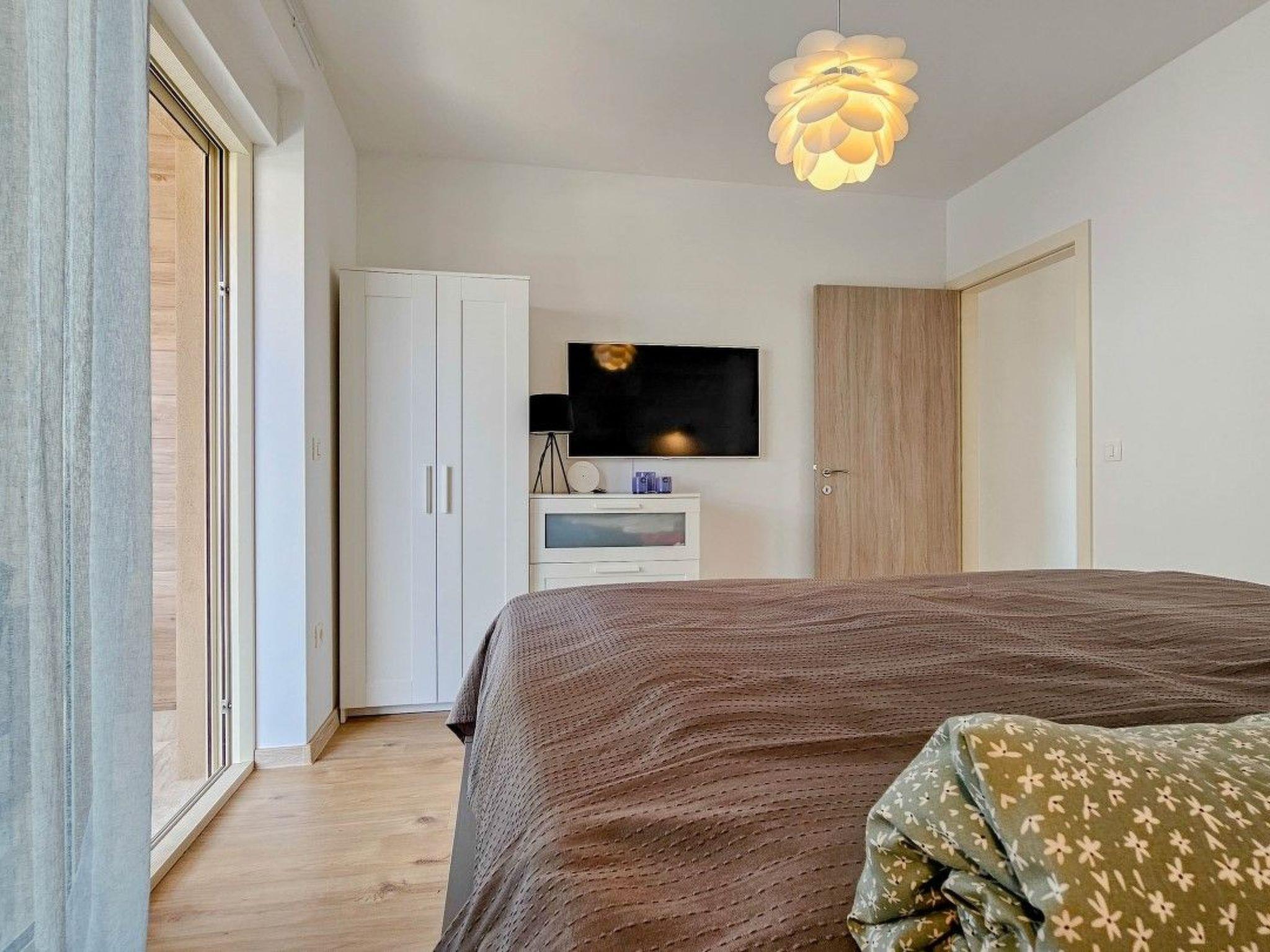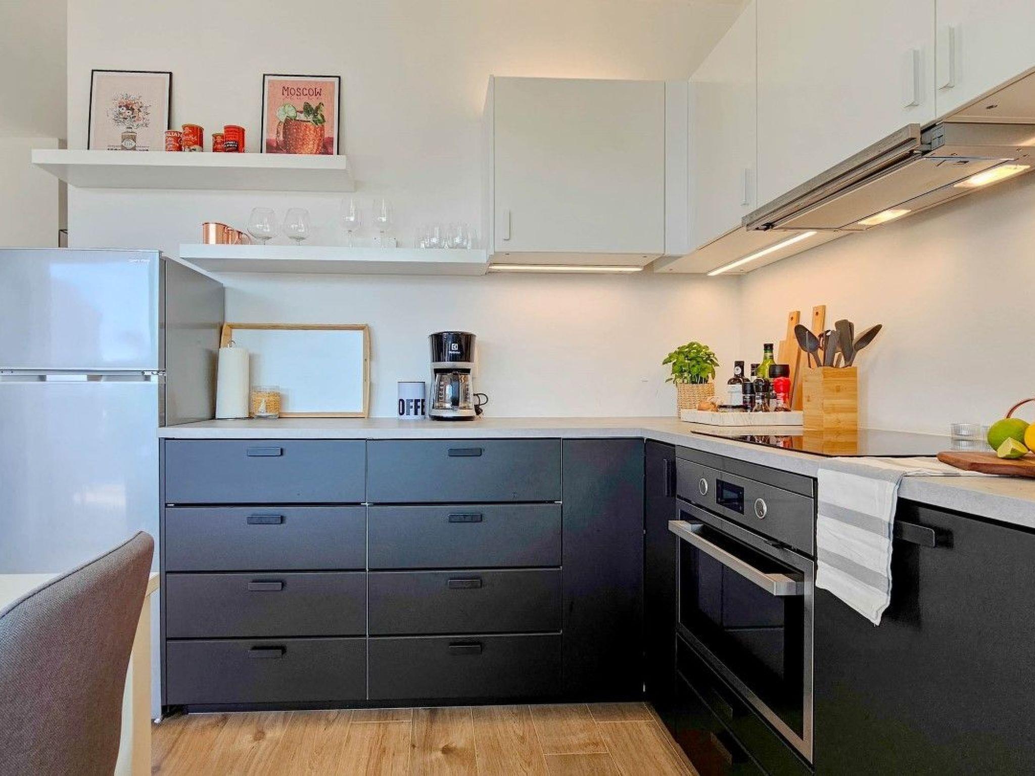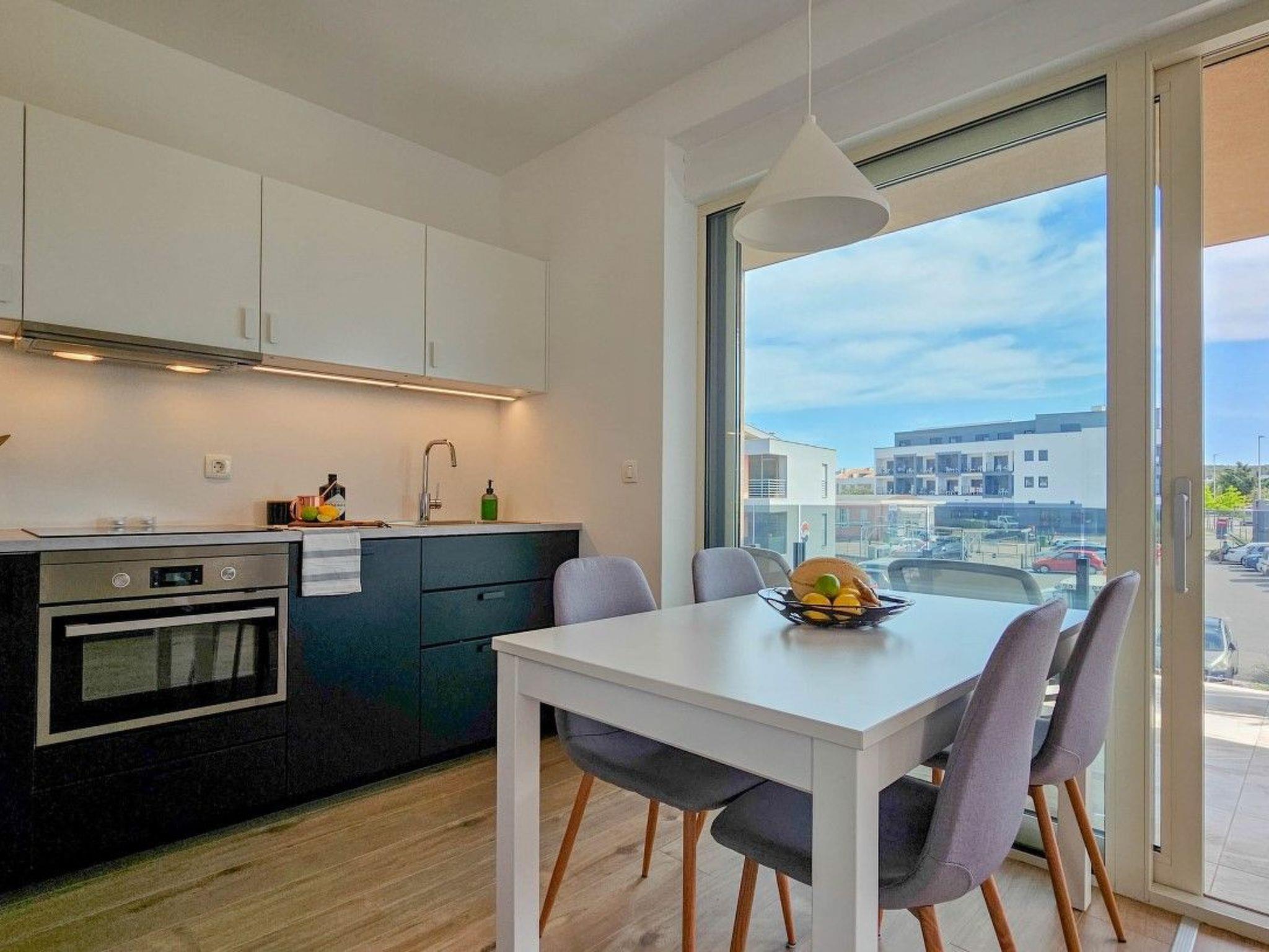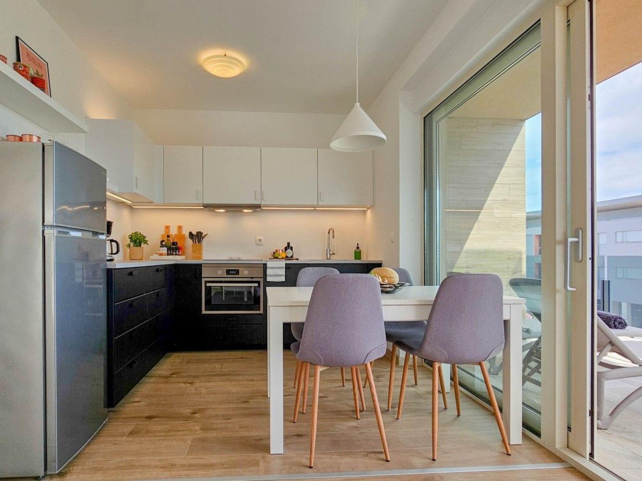 The apartment has two bedrooms, one with a double bed and the other with a bunk bed. An additional two guests can be accommodated on a sofa bed in the living room. The modern kitchen is equipped with the basic necessities for preparing meals.