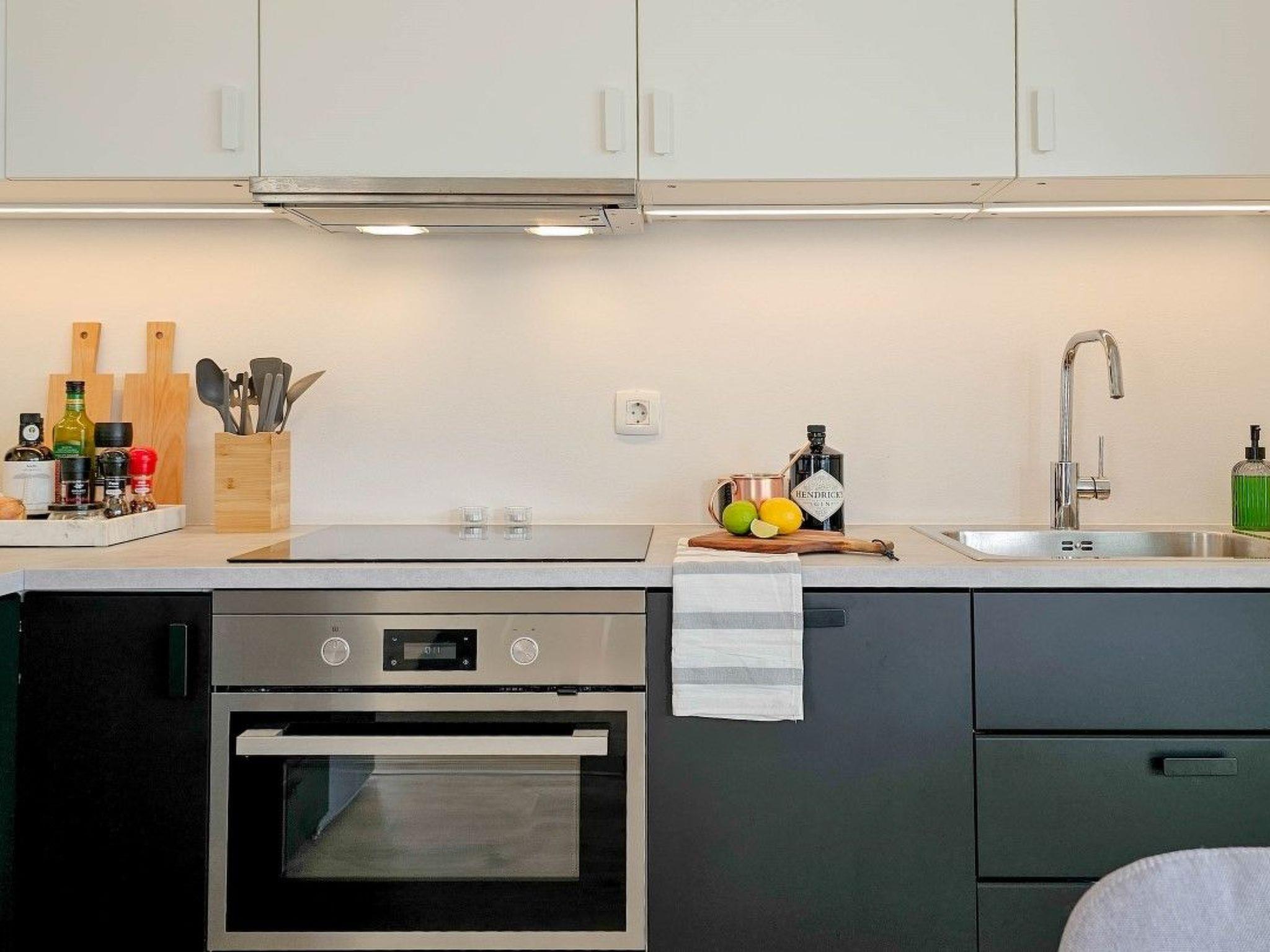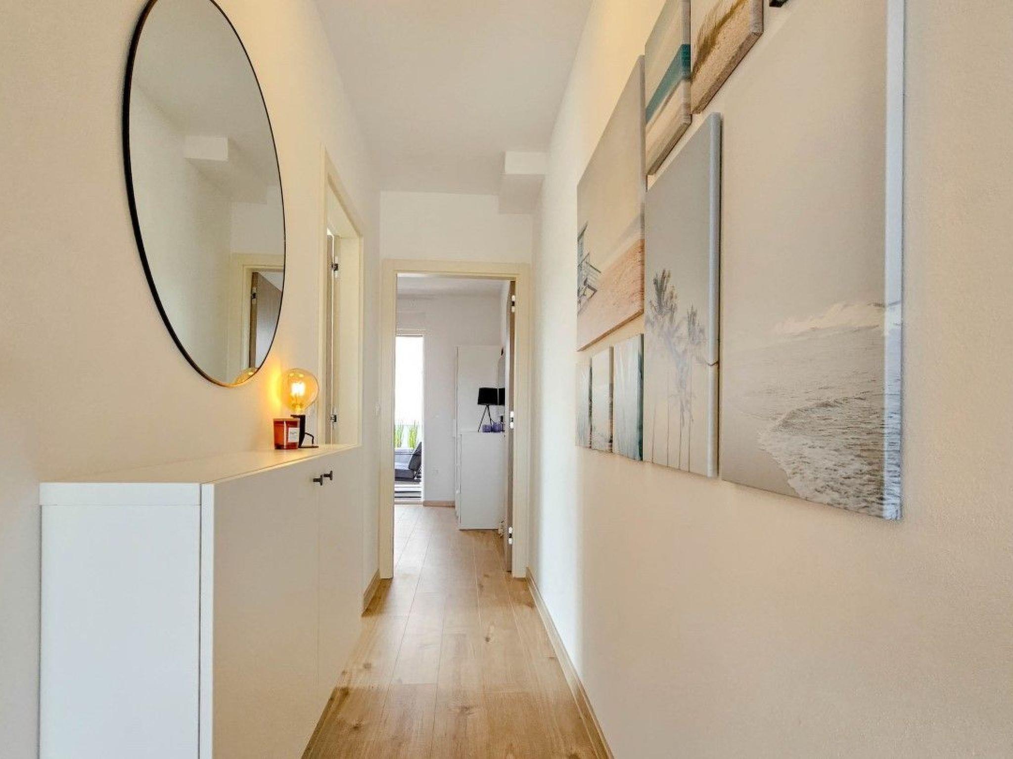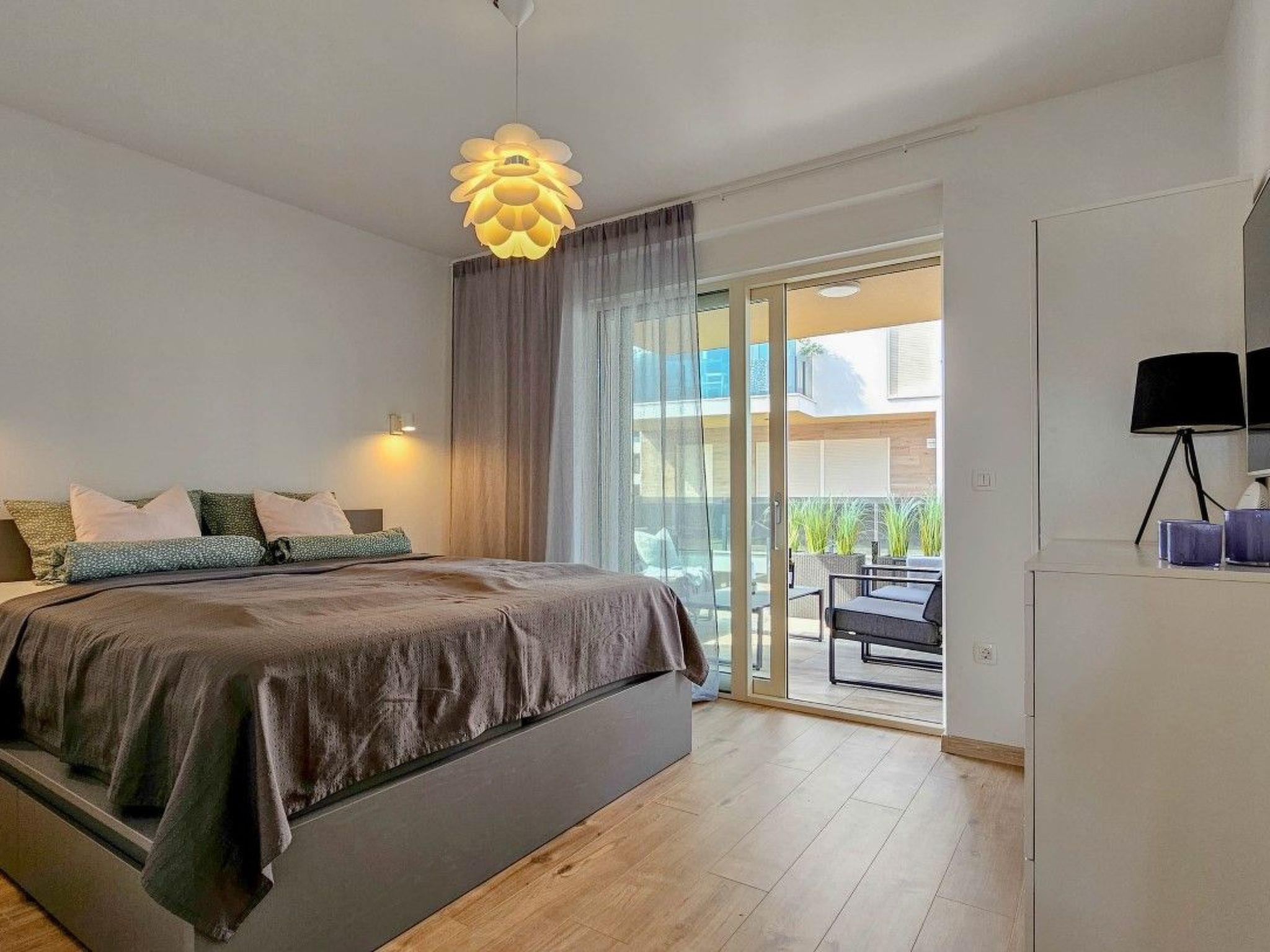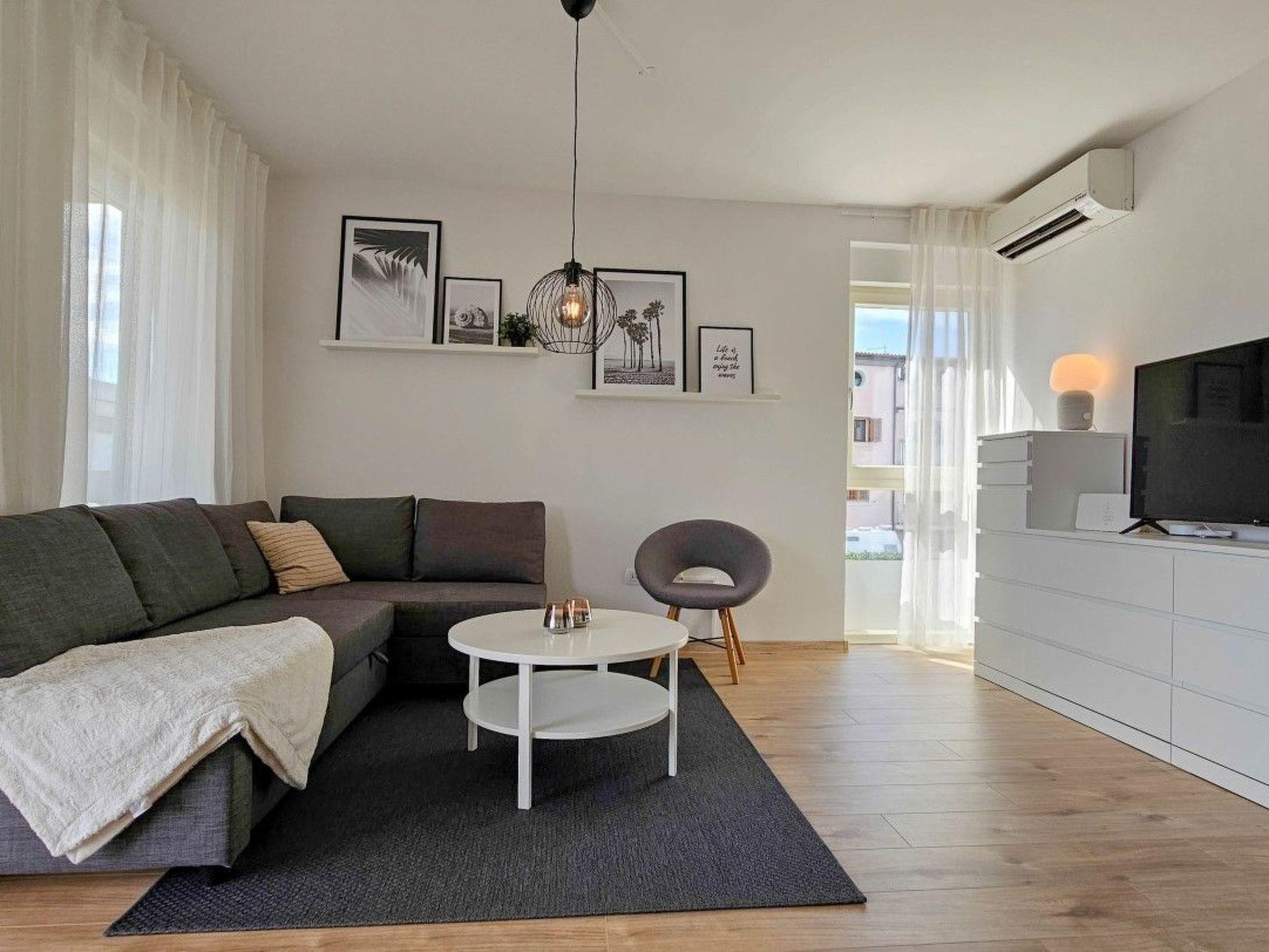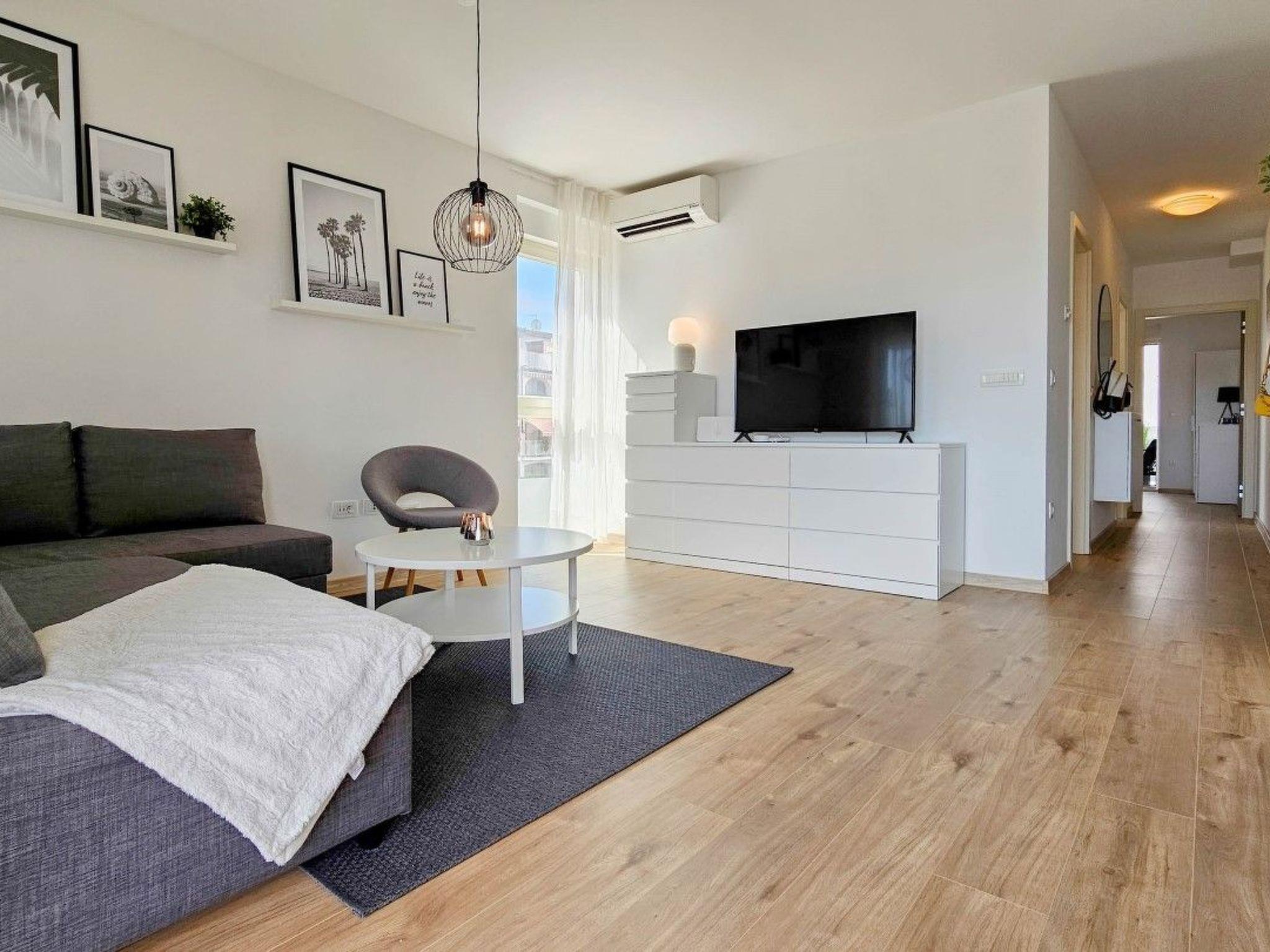 The apartment has two bedrooms, one with a double bed and the other with a bunk bed. An additional two guests can be accommodated on a sofa bed in the living room. The modern kitchen is equipped with the basic necessities for preparing meals.