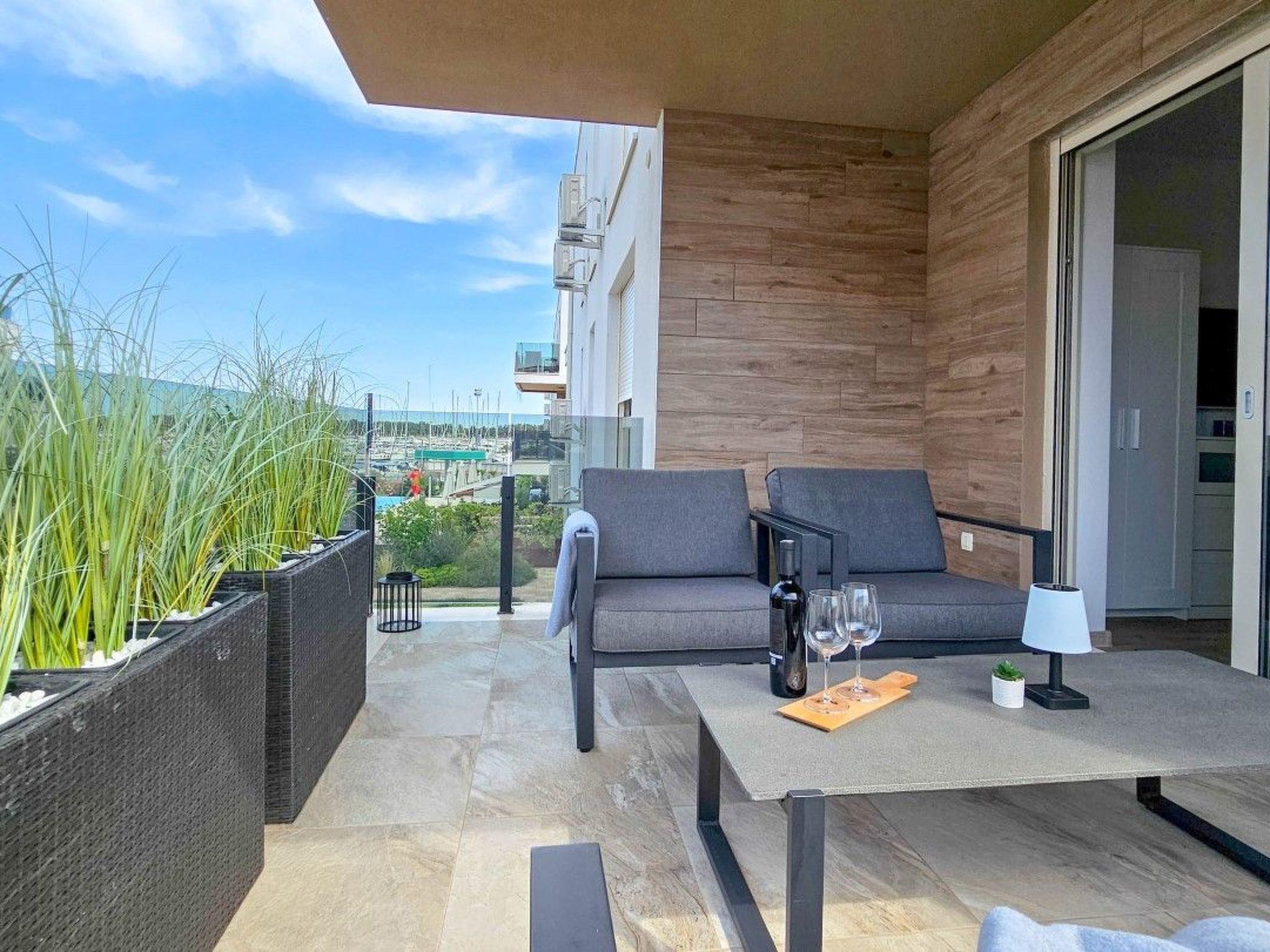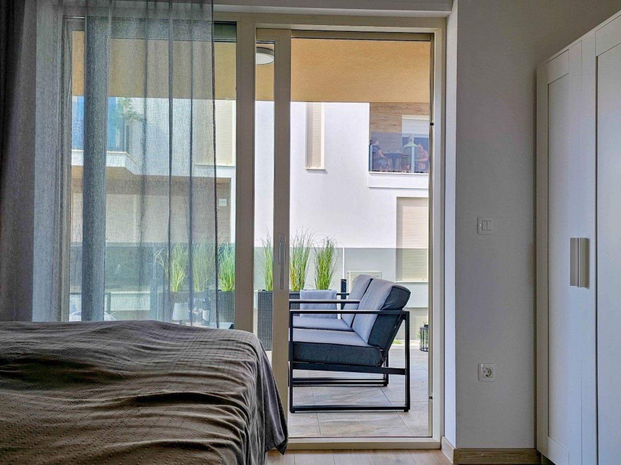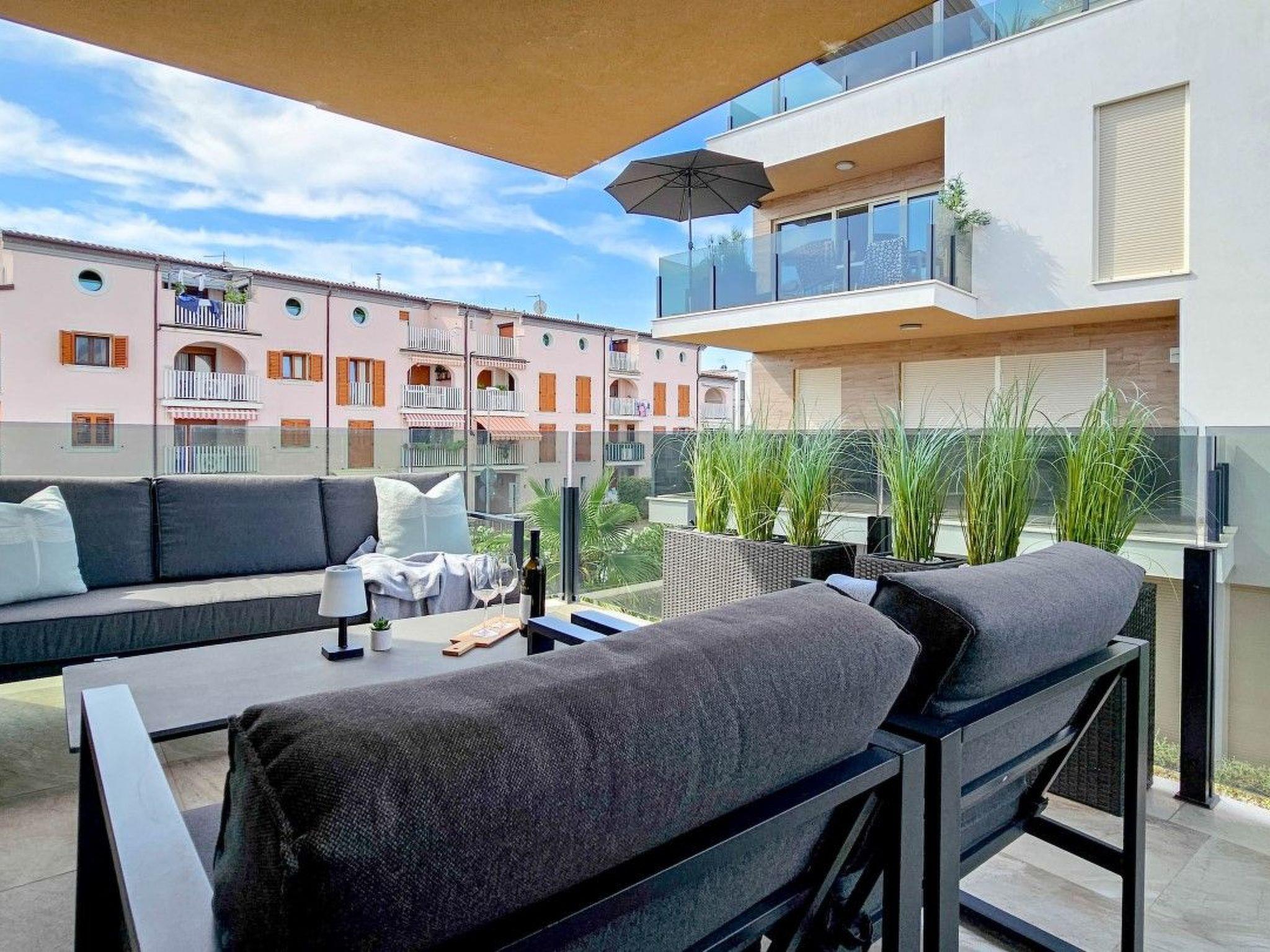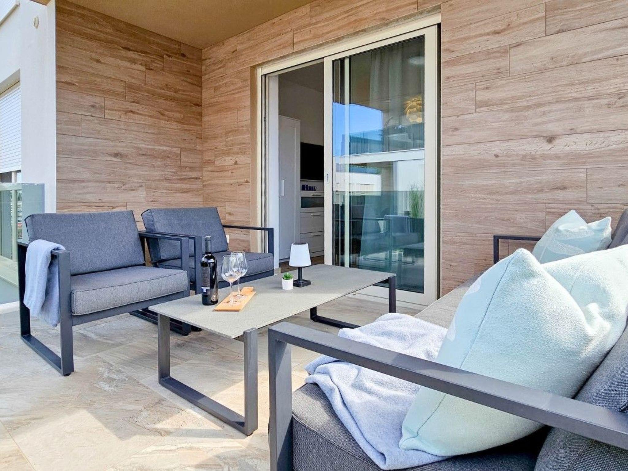 Guests have access to two balconies, one connected to the bedroom, and the other has an exit from the living room and is equipped with sun loungers, a parasol and a comfortable seating area.