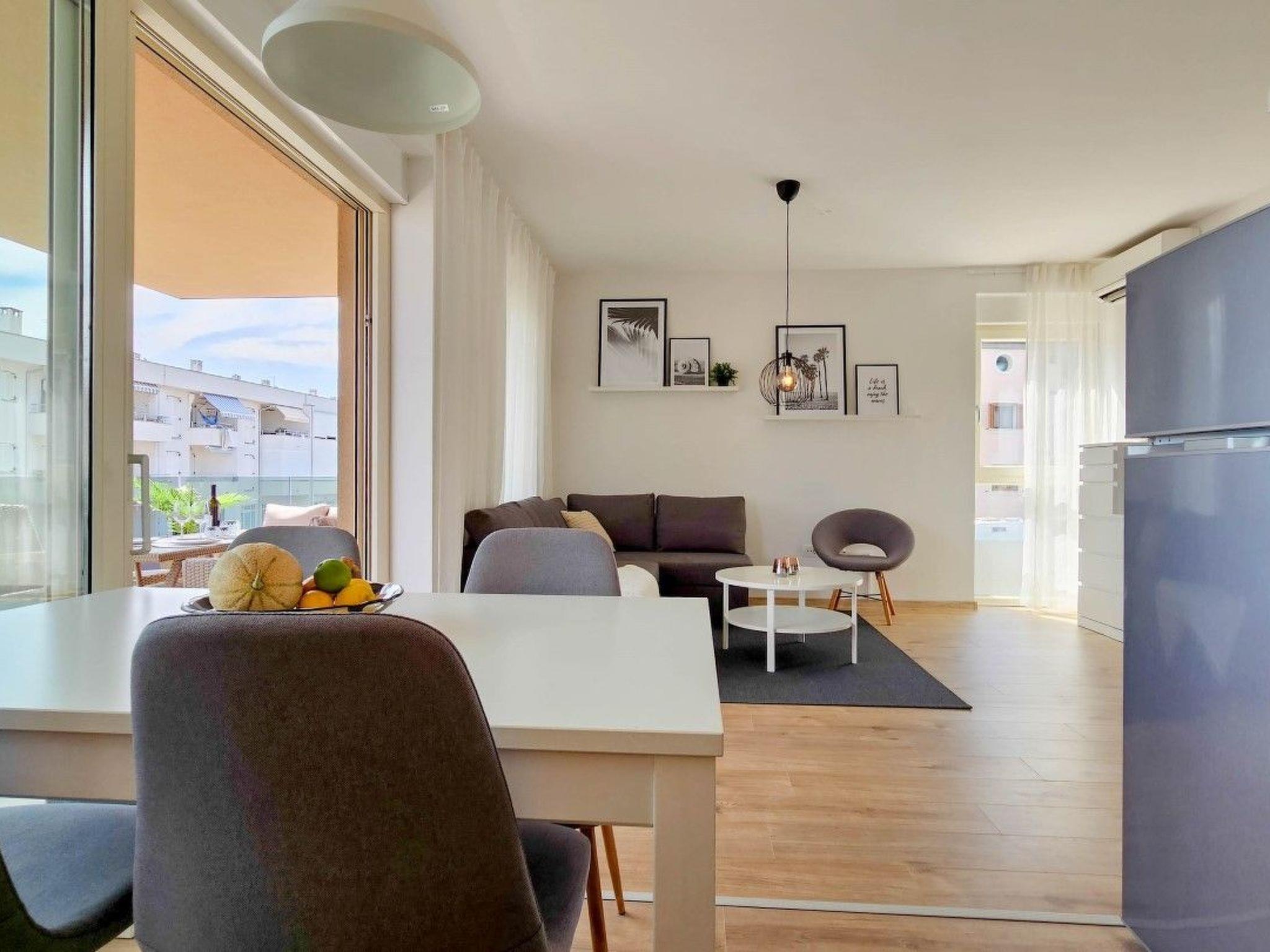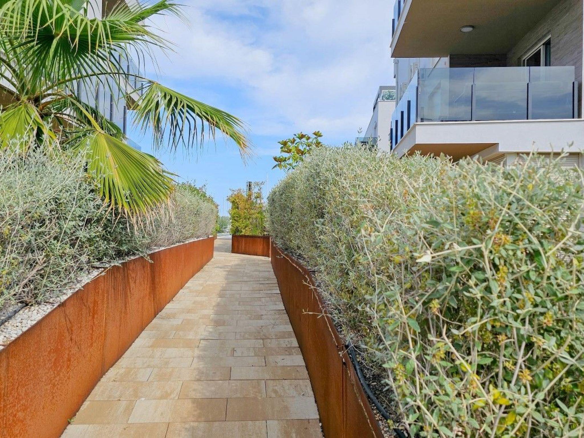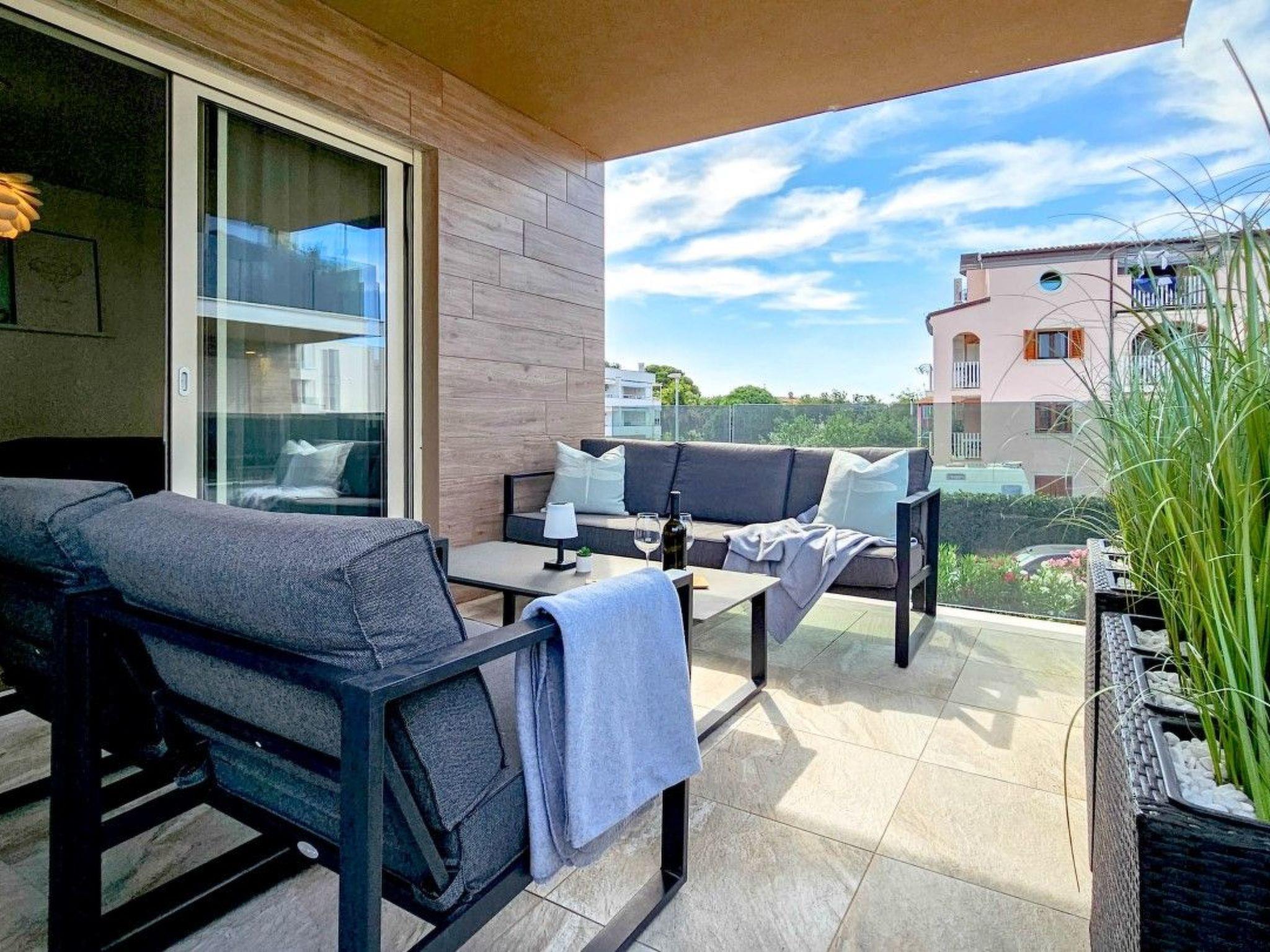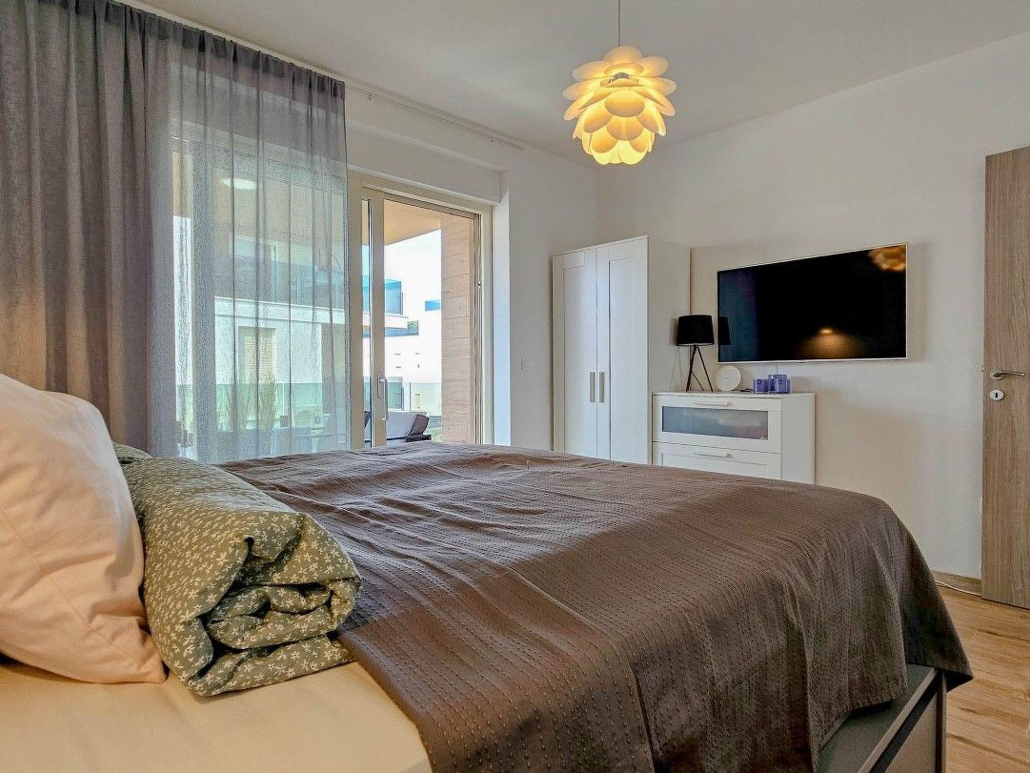 Guests have access to two balconies, one connected to the bedroom, and the other has an exit from the living room and is equipped with sun loungers, a parasol and a comfortable seating area.